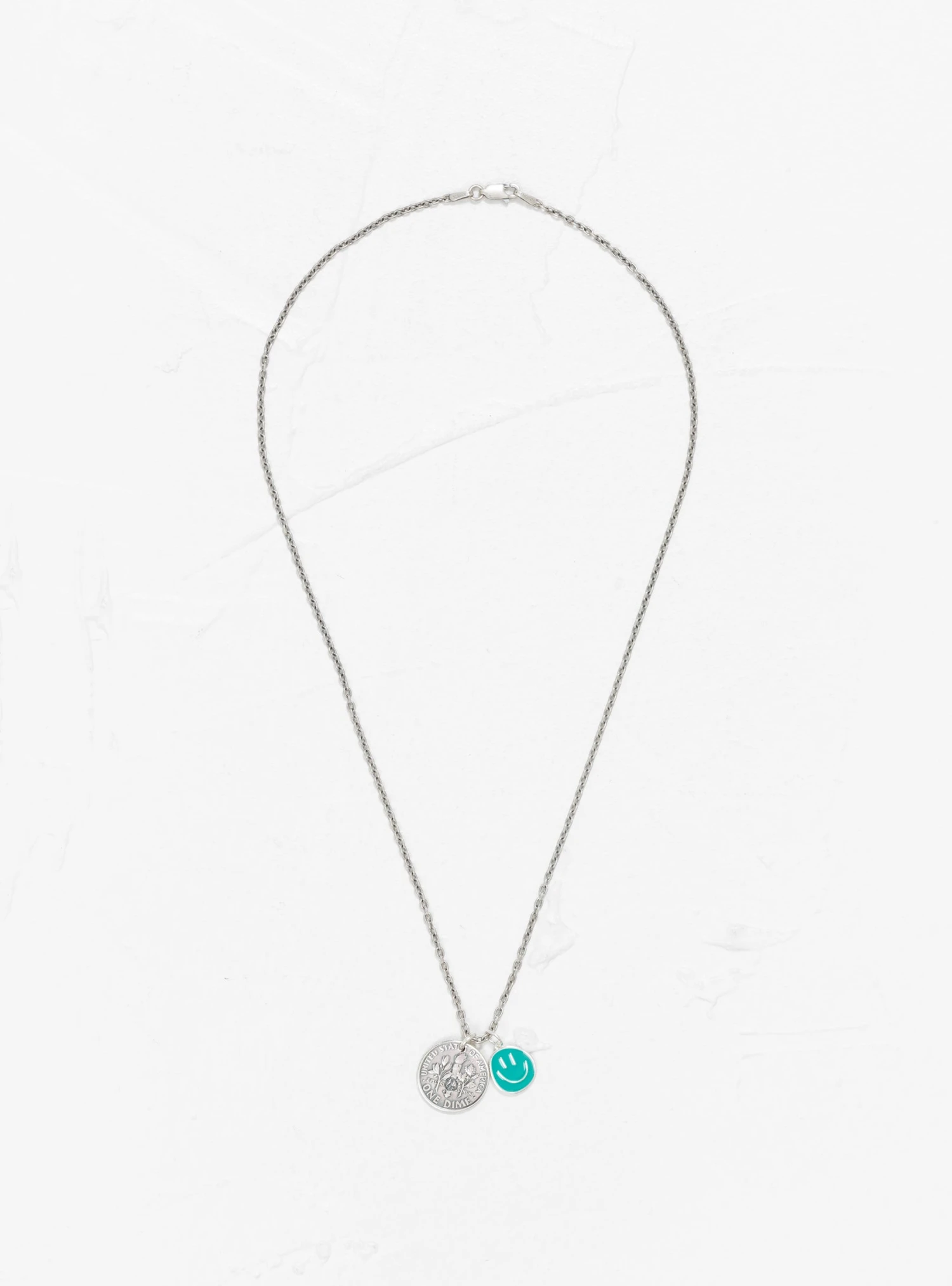 Handmade in Japan, this necklace from NORTH WORKS features a 10 Cent Brace Point pendant fashioned from a vintage American coin – used for its high silver content – and a 925 sterling silver chain embellished with an enamel Smilie charm.