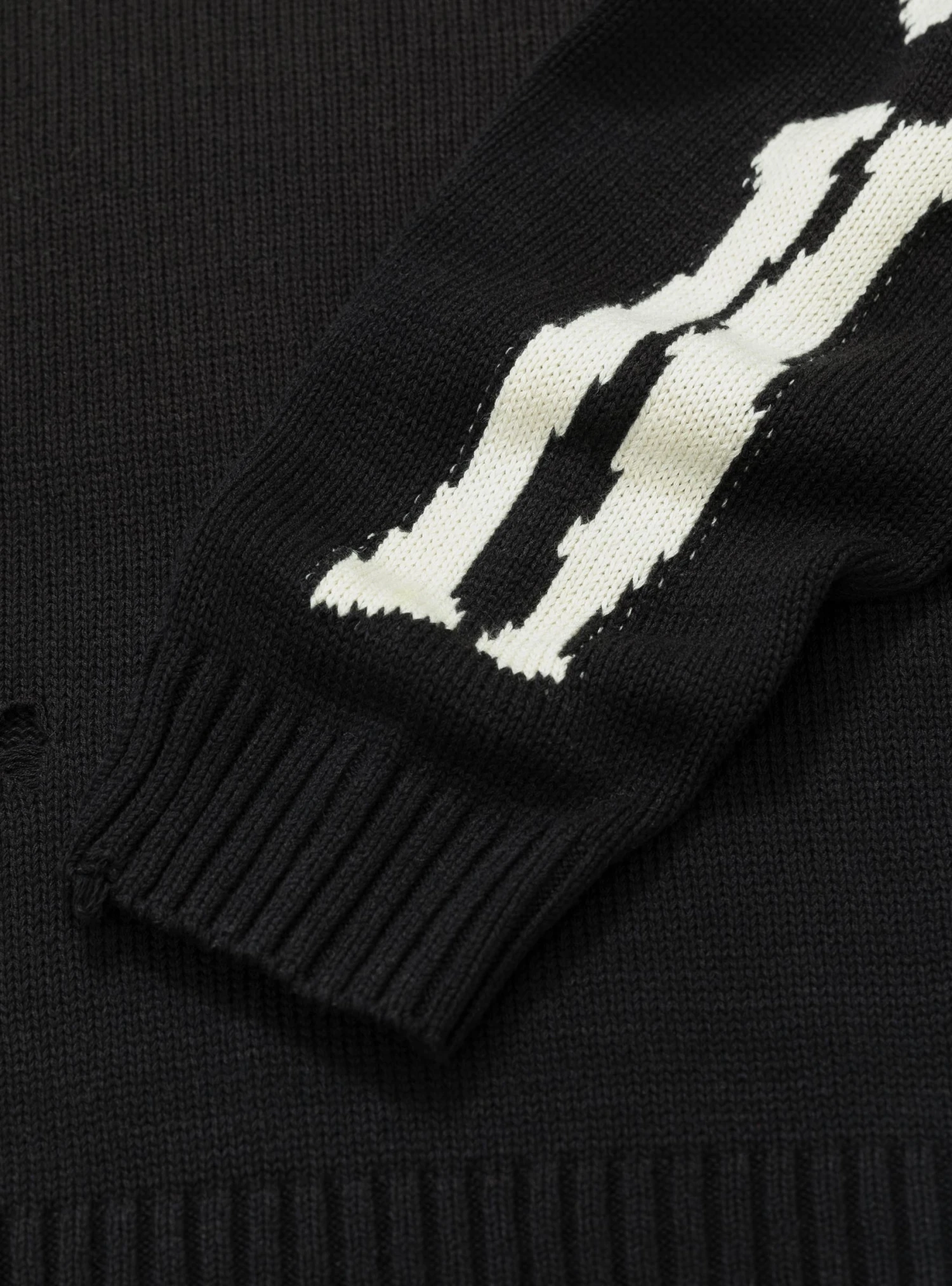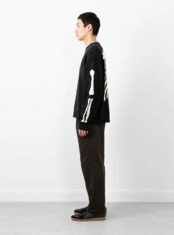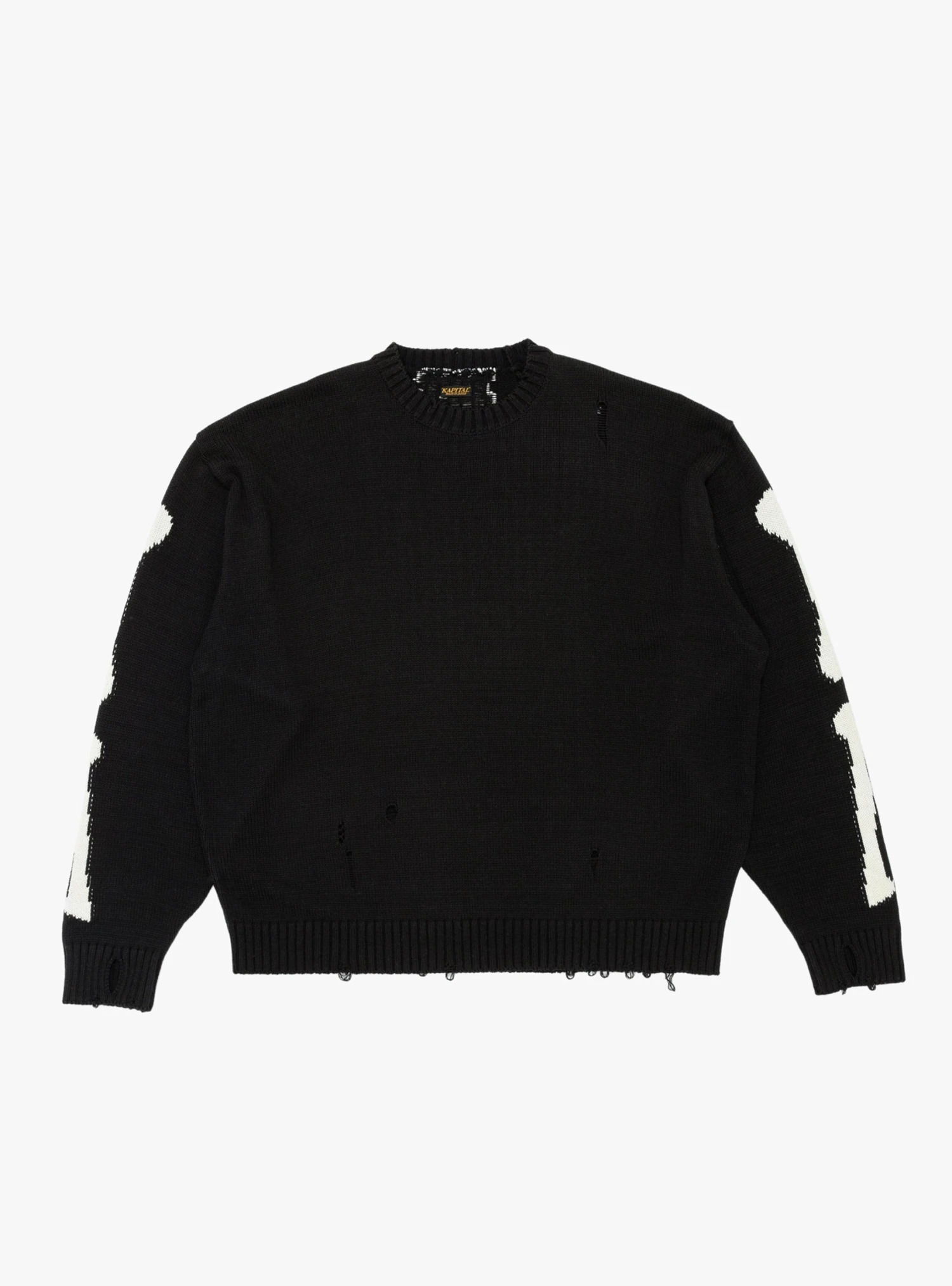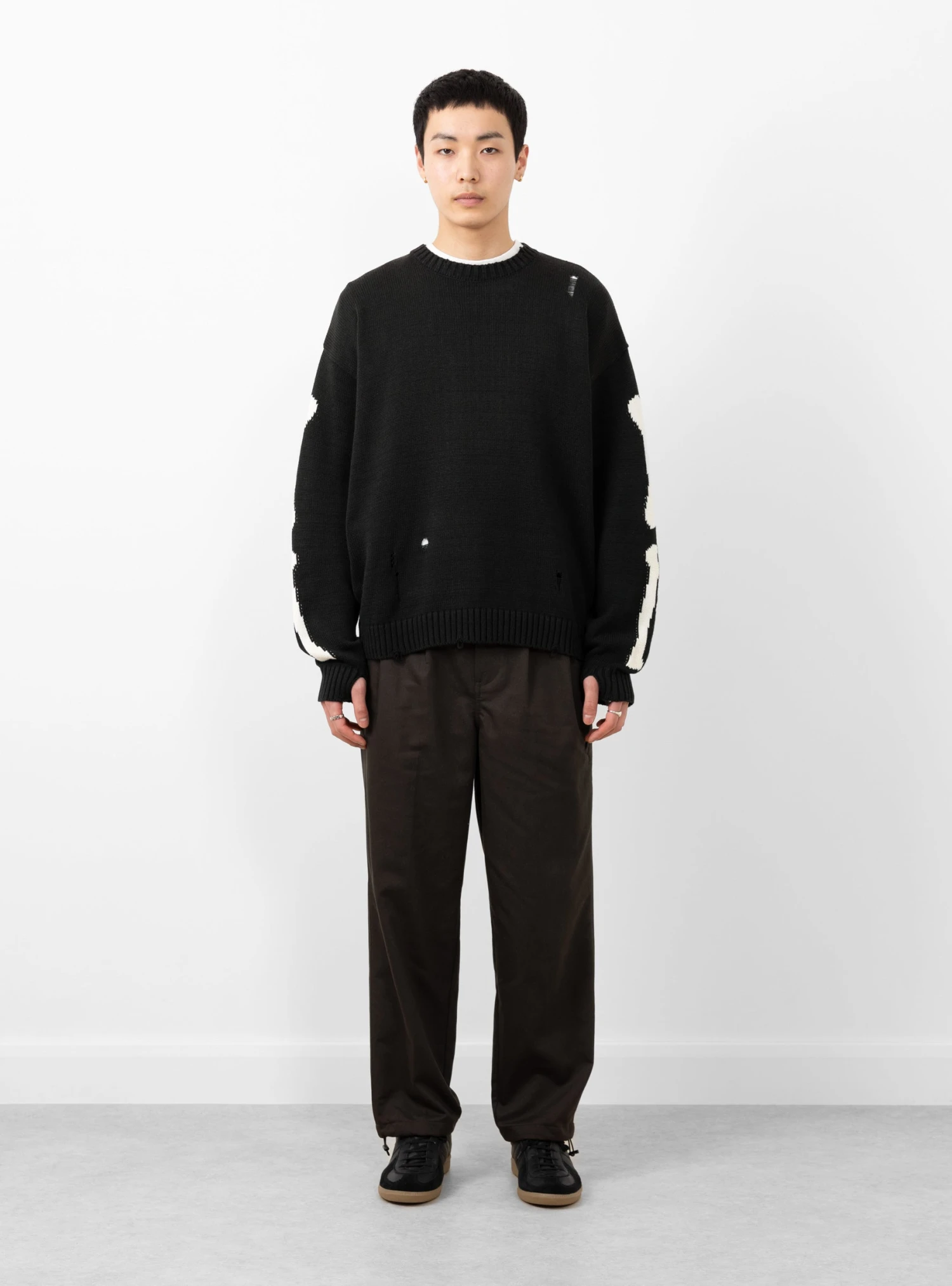 The 5G Cotton Knit Bone sweater from Kapital is cut from a black and white cotton-blend. Made in Japan, the mid-weight knit falls to a relaxed fit with dropped shoulders. Distressed detailing give the shirt a vintage look and feel and Kapital’s iconic bone intarsia is knitted across the back of the crewneck.