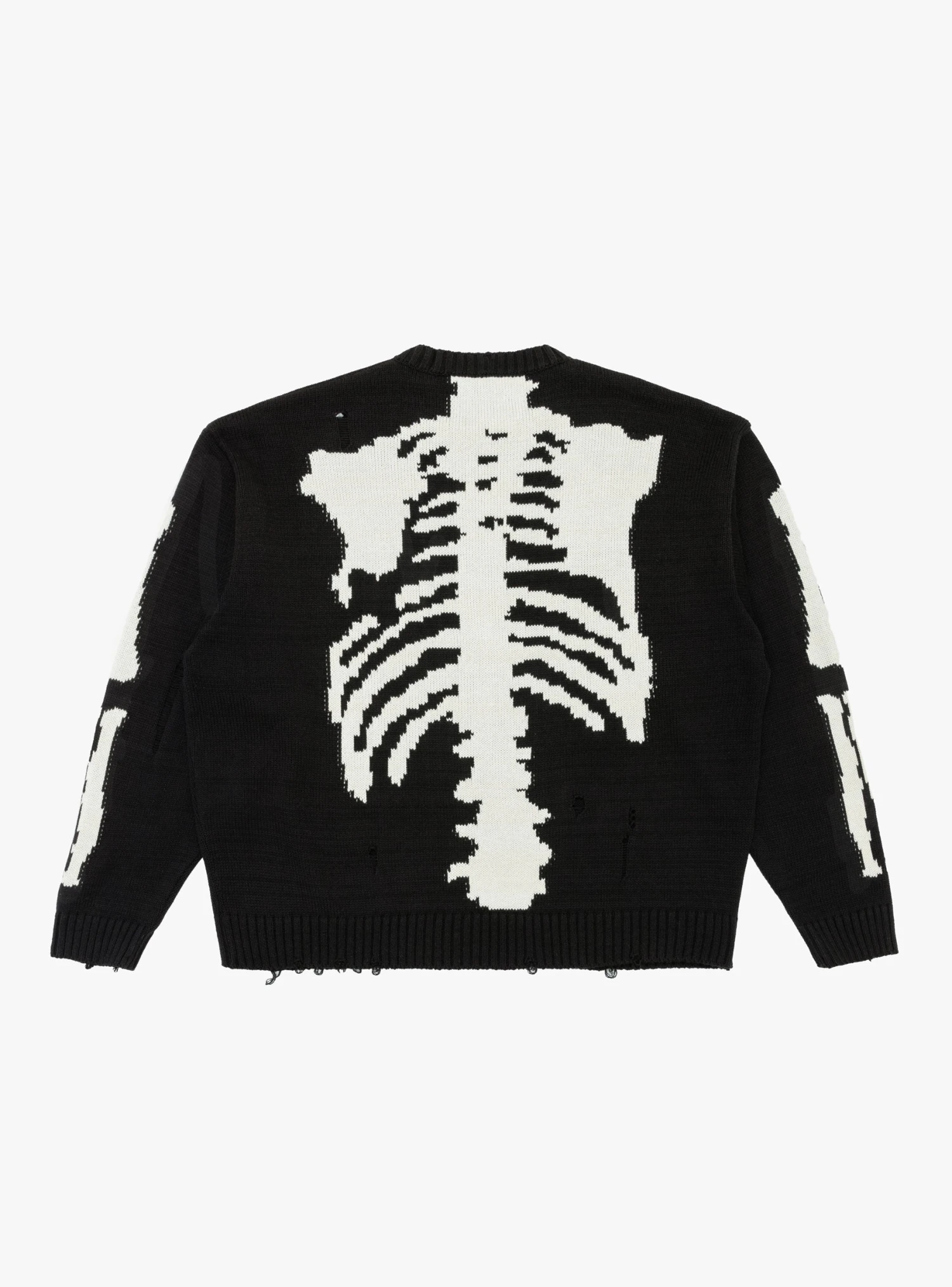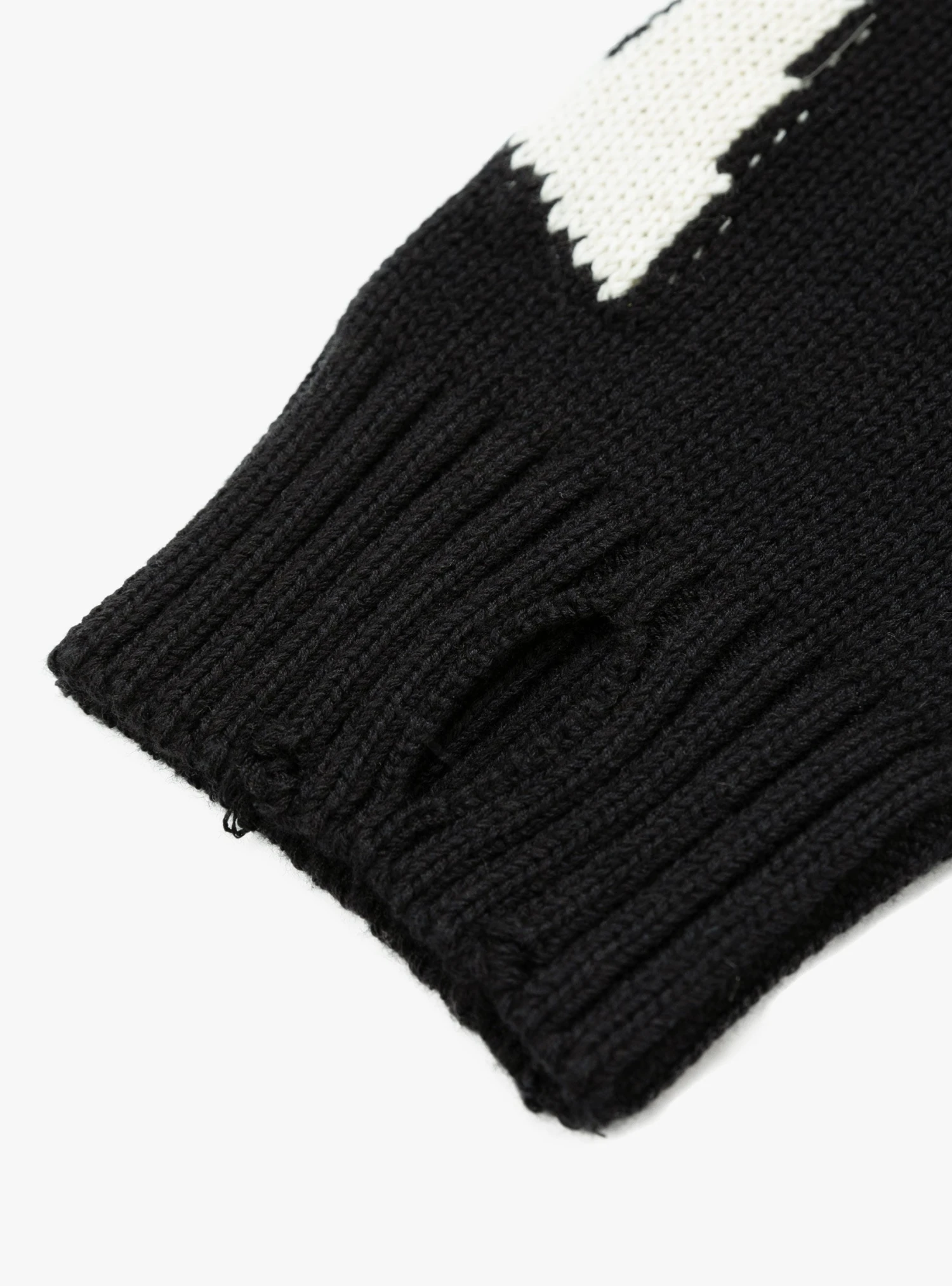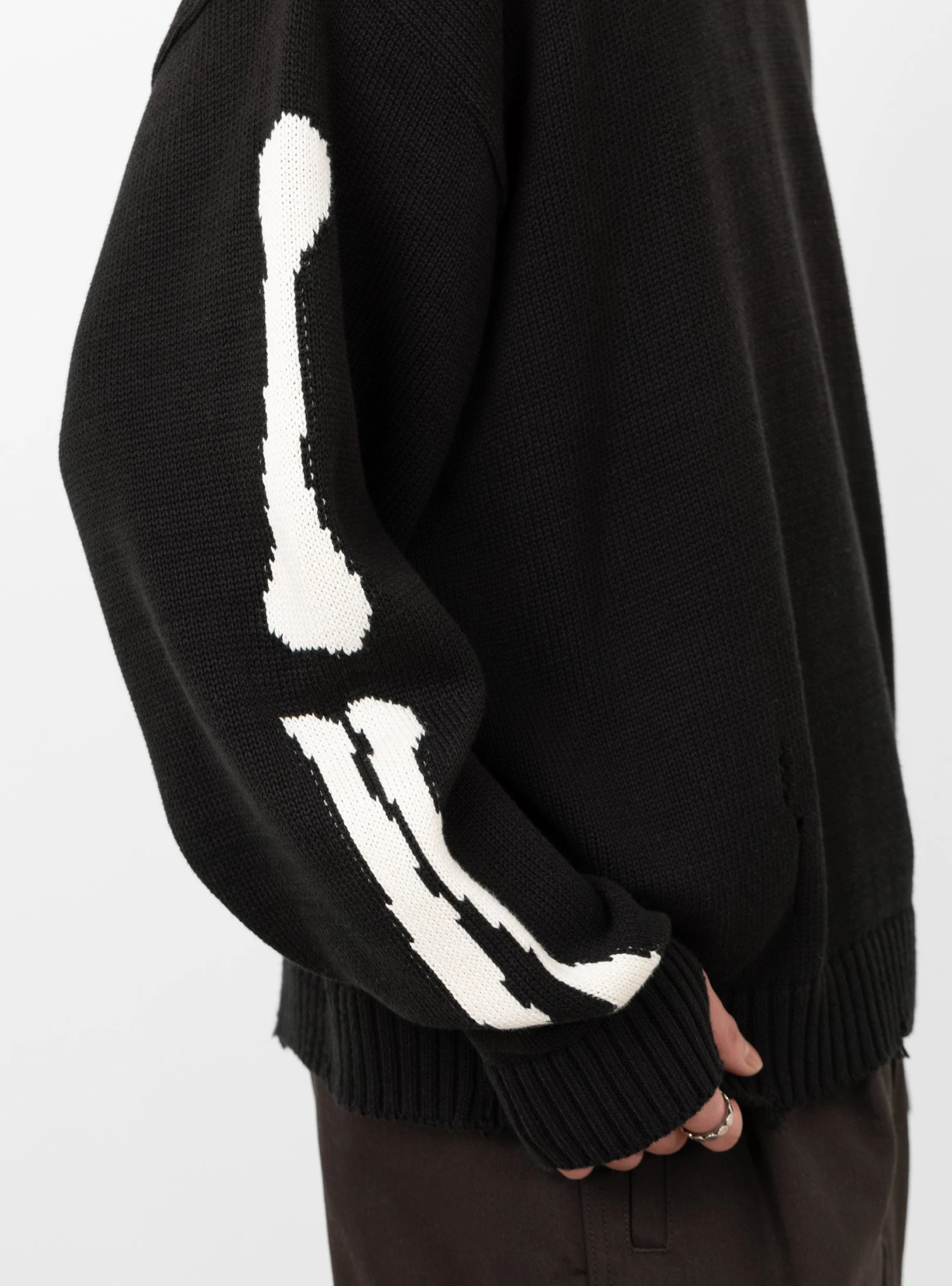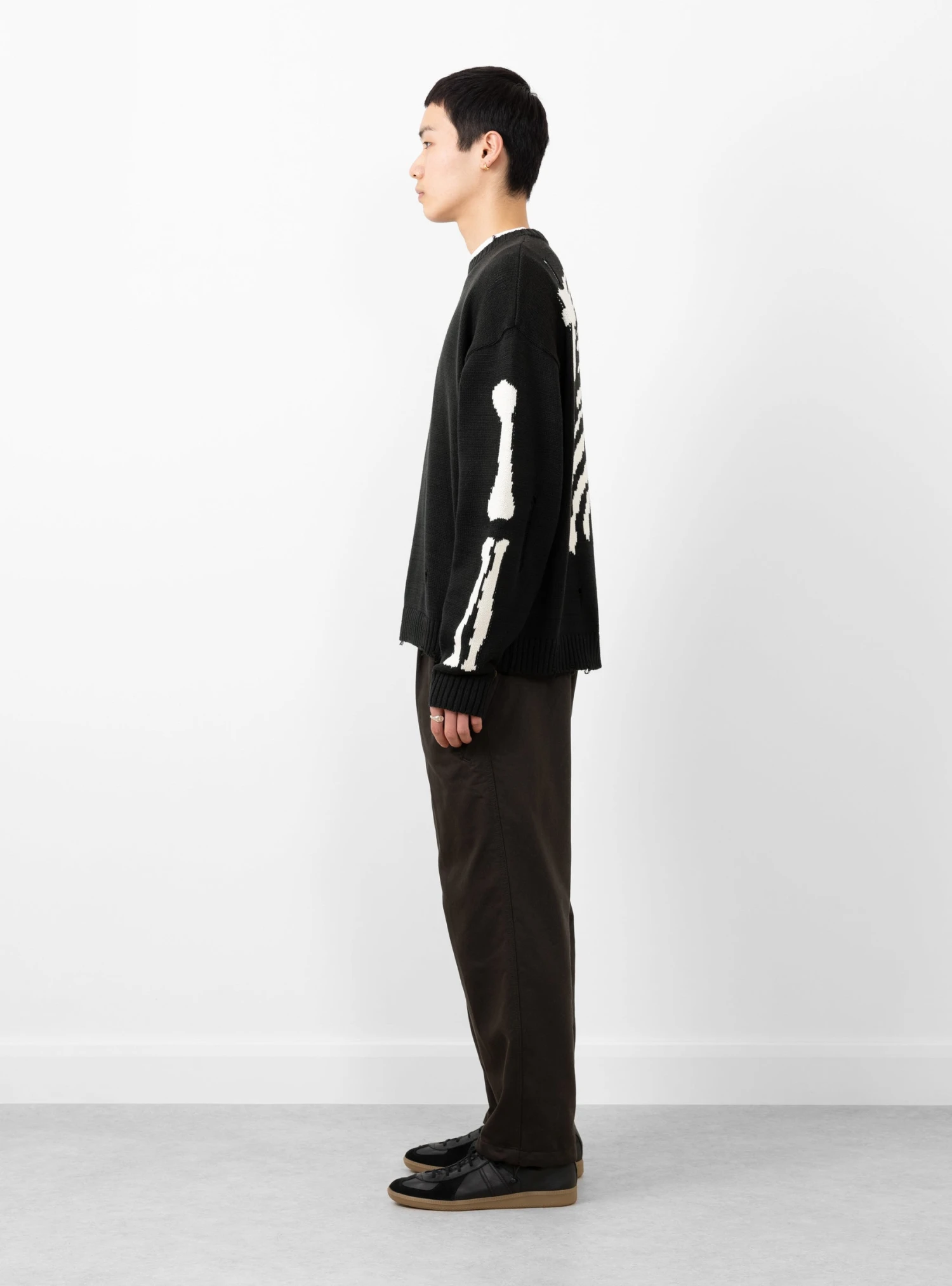The 5G Cotton Knit Bone sweater from Kapital is cut from a black and white cotton-blend. Made in Japan, the mid-weight knit falls to a relaxed fit with dropped shoulders. Distressed detailing give the shirt a vintage look and feel and Kapital’s iconic bone intarsia is knitted across the back of the crewneck.