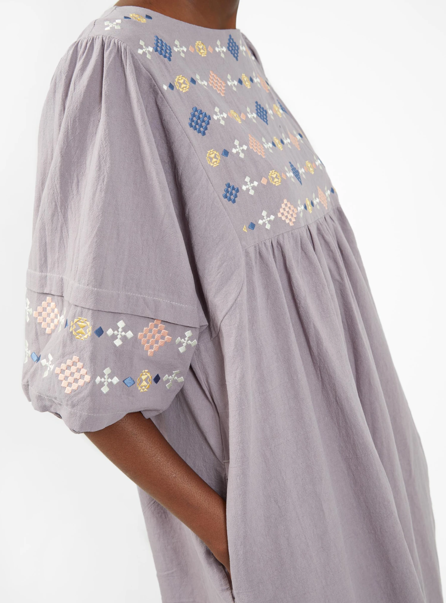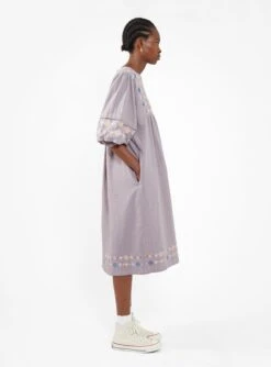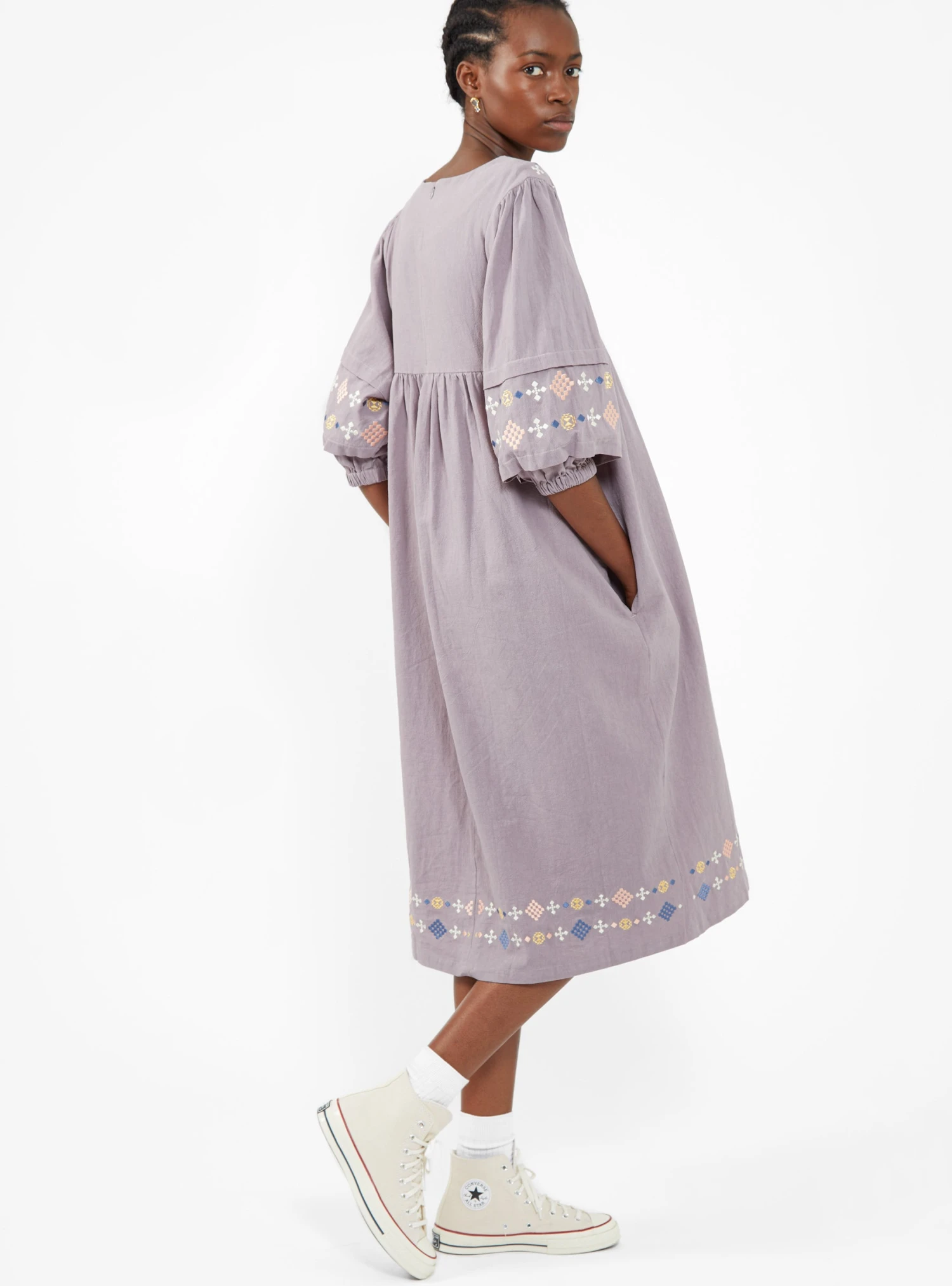 A standout piece from the AW22 collection, this lilac Ash dress from Sideline features whimsical embroidery accenting the chest, sleeves and hem. Made from a blend of linen and cotton, it’s cut to a slightly relaxed silhouette with a wide neckline and gathering at the waist.