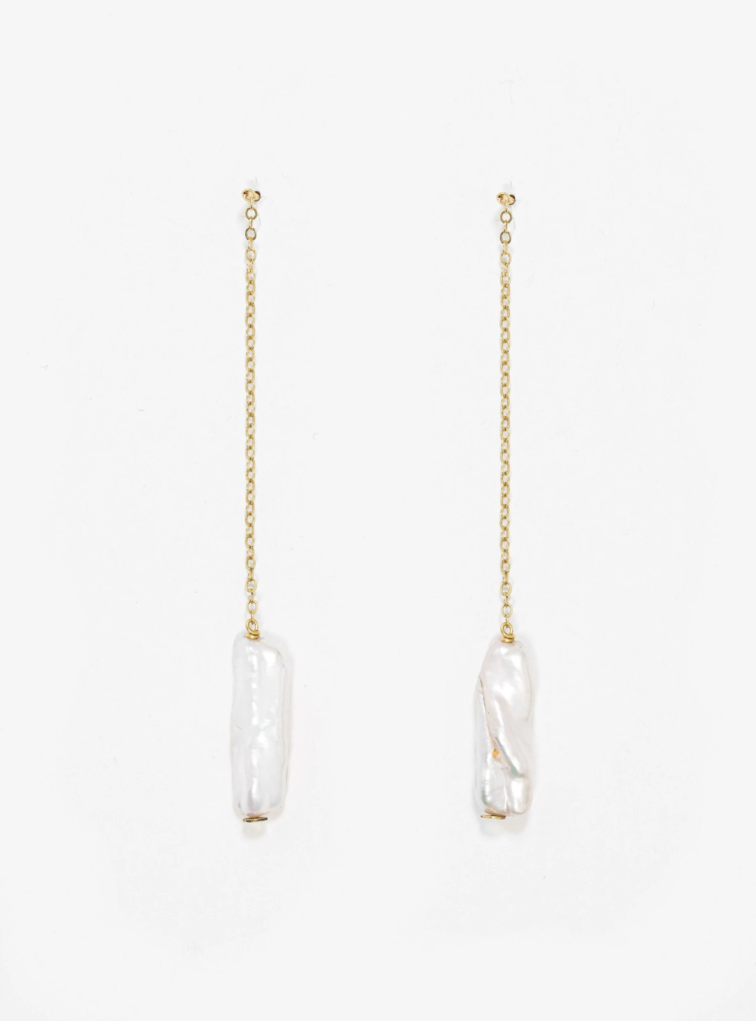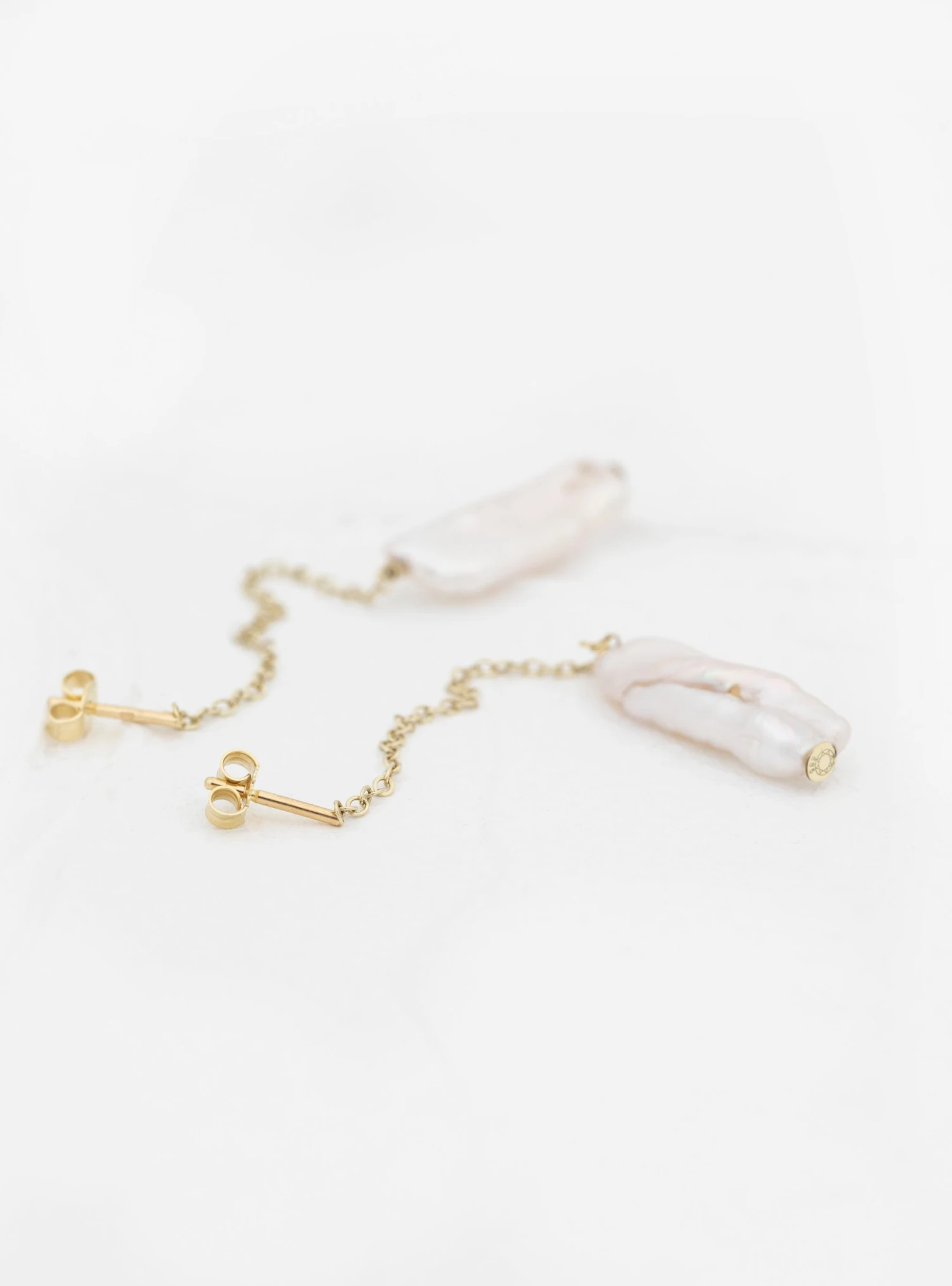 Saskia Diez champions perfect imperfections with these Baton earrings. Made in Germany from 14kt gold, they comprise dainty chains dropping down from the lopes to suspend organic-shaped freshwater pearls.