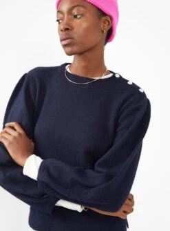 Bring a sense of sophistication to your winter wardrobe with this Captain-navy Dervo sweater from Bellerose. Made from wool-blend yarn, which incorporates mohair for added softness, itβs knitted to a classic silhouette with gathered shoulder seams and puffed sleeves. Three mother-of-pearl buttons fasten along one shoulder.