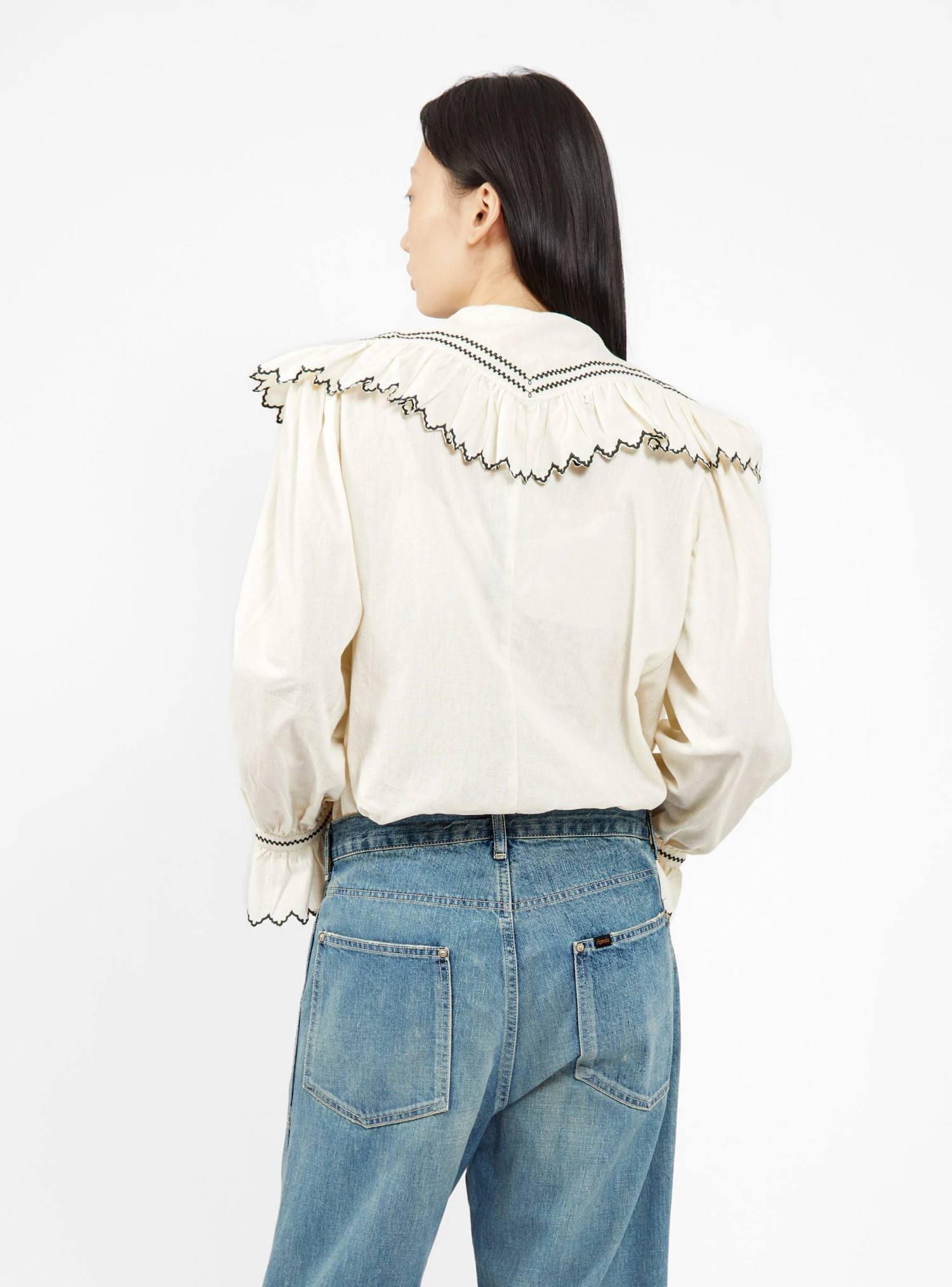 This off-white Blossom shirt from YMC is embroidered with contrasting details framing the frilled collar and cuffs. Made from a soft and lightweight blend of cotton and linen, it’s cut to a slightly relaxed silhouette with gathered shoulders and French Seams.