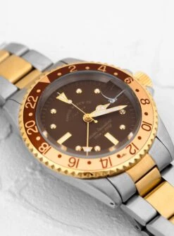 Capable of reaching depths up to 100m, this brown BRWN GMT diver watch from Vague Watch Co. is made from a combination of silver tone and gold-plated stainless steel, features Swiss-made quartz movement and hard crystal glass with date indicator lens.