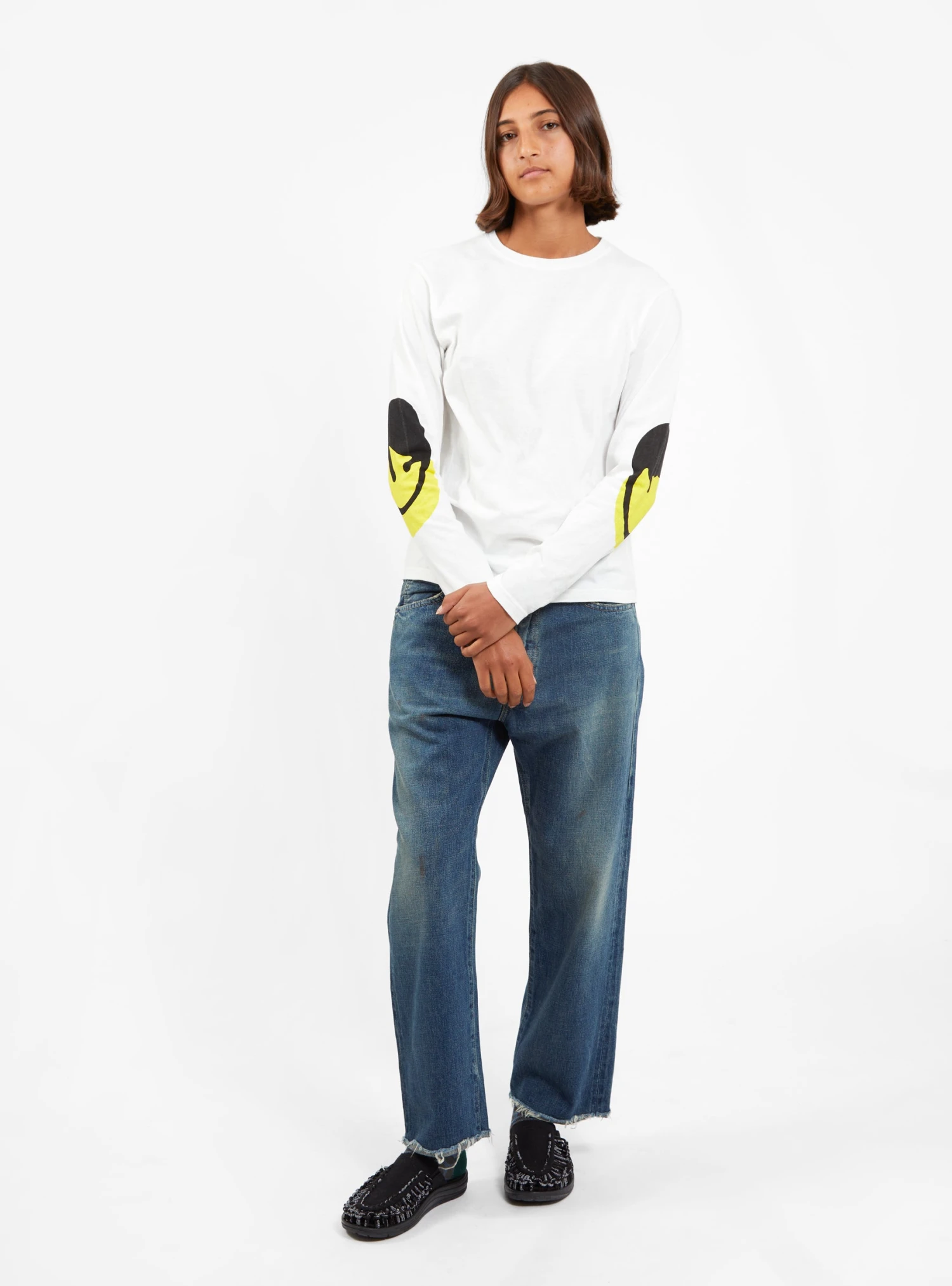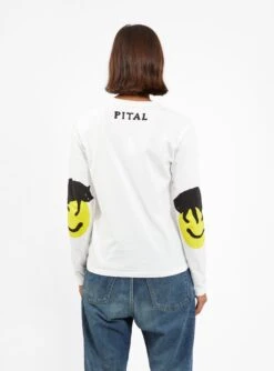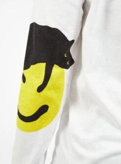 Kapital’s playful nature shines through with this white Catpital T-shirt. Made in Japan from cotton jersey, it’s cut to a classic silhouette and features the label’s signature smiley face graphics printed at the elbows.