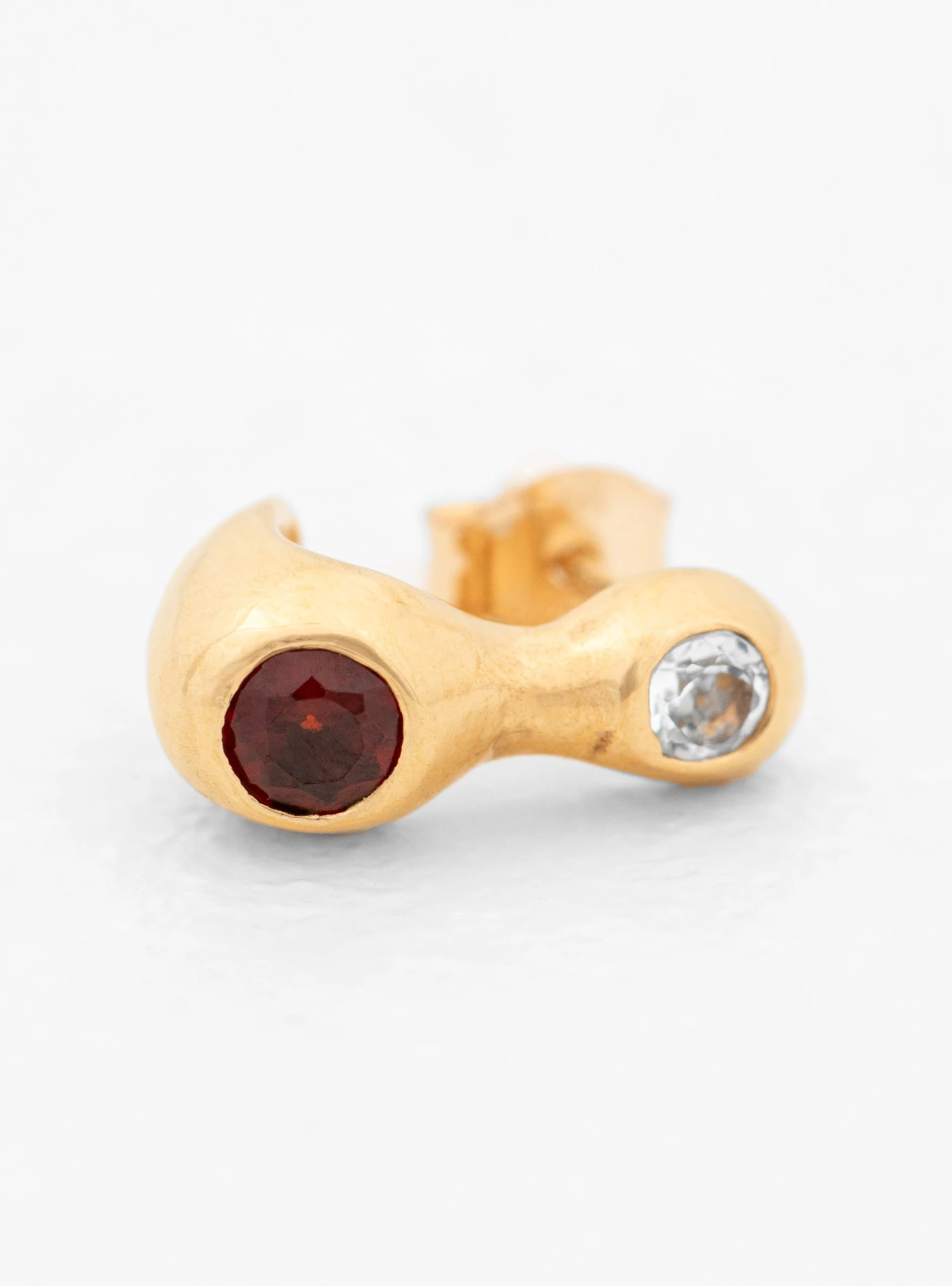 Embellished with topaz and garnet gemstones, this Chamelle stud earring from Faris is made by hand from 14kt gold-plated bronze at the label’s Seattle studio.