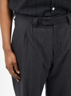 Made in Portugal from lightweight organic-cotton twill, these black pinstripe Classic trousers from mfpen’s SS23 collection are cut to a relaxed silhouette with wide, pleated legs and features internal drawstrings for a personalised fit.