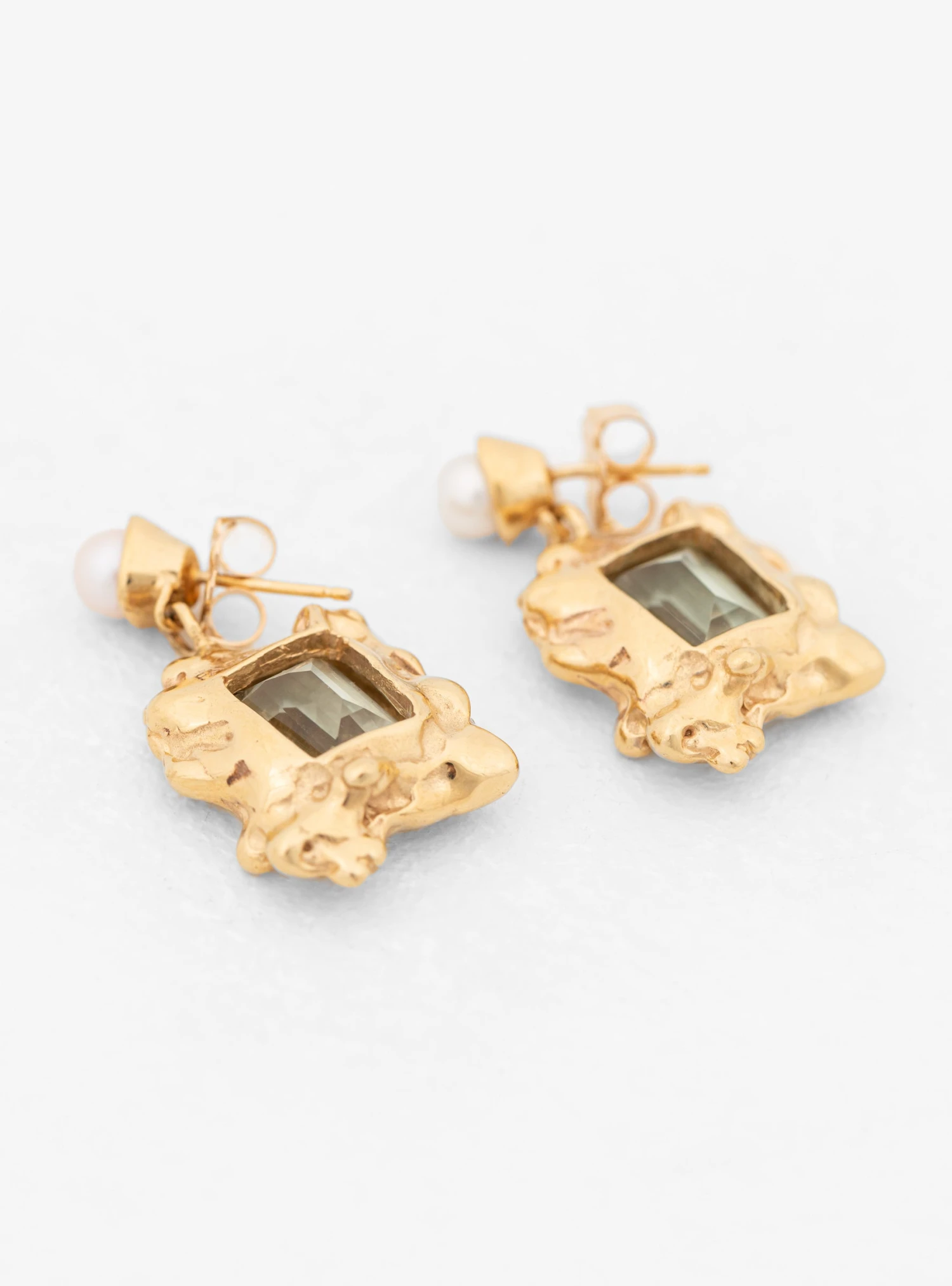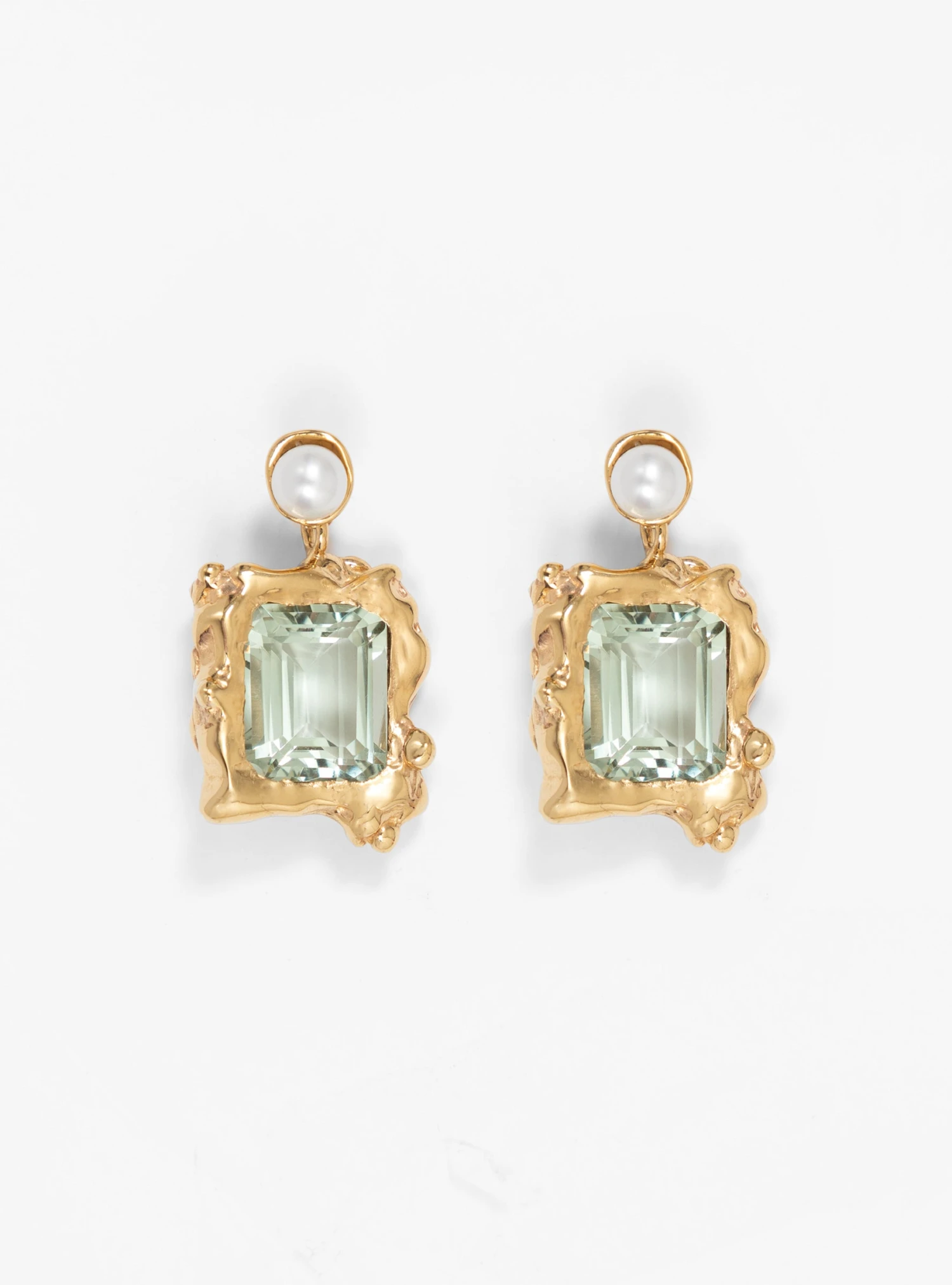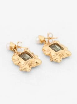 Embellished with shimmering freshwater pearls and green amethyst crystals, these Cornice drop earrings from Faris are made by hand from 14kt gold-plated bronze at the label’s Seattle studio.