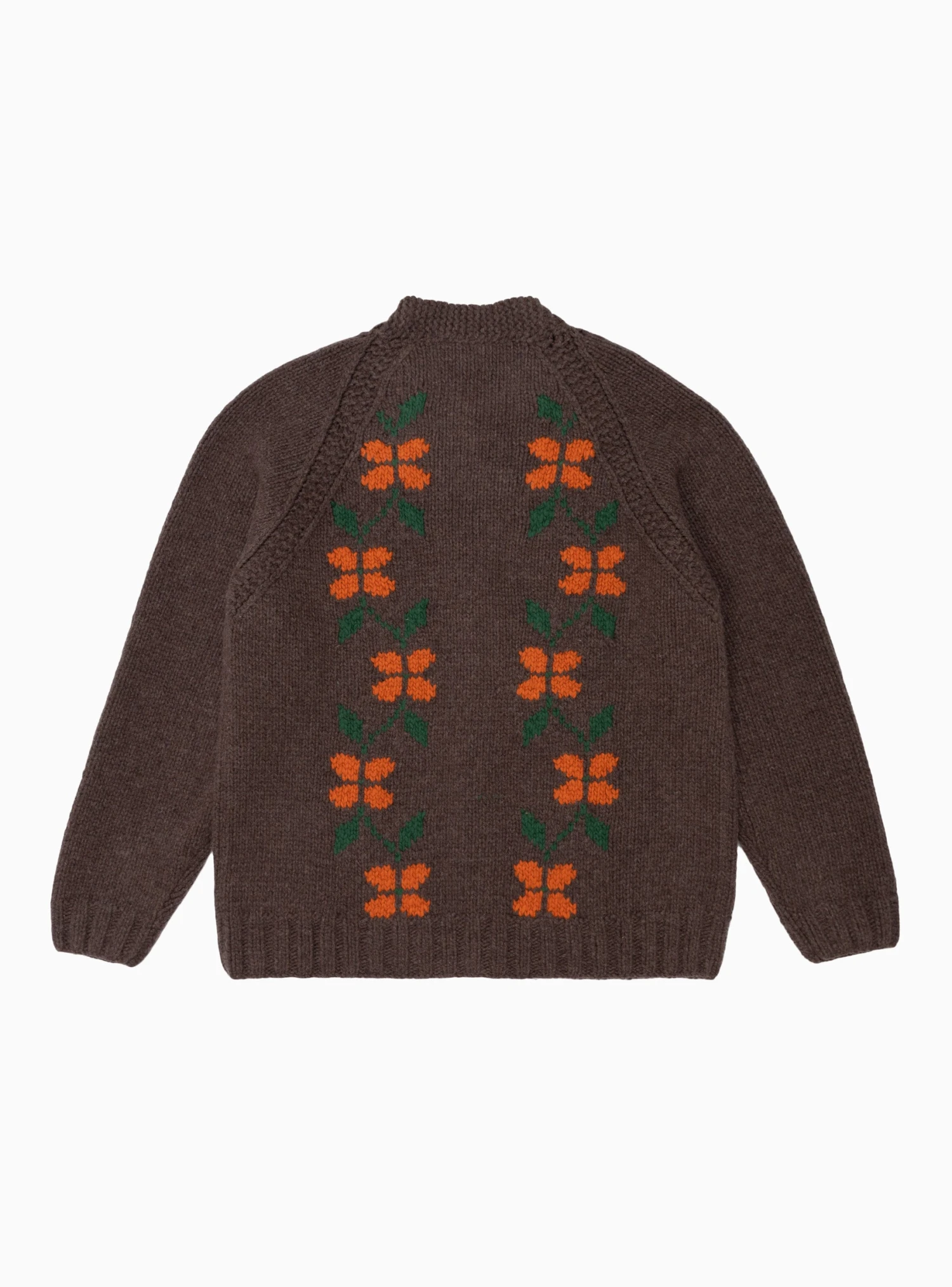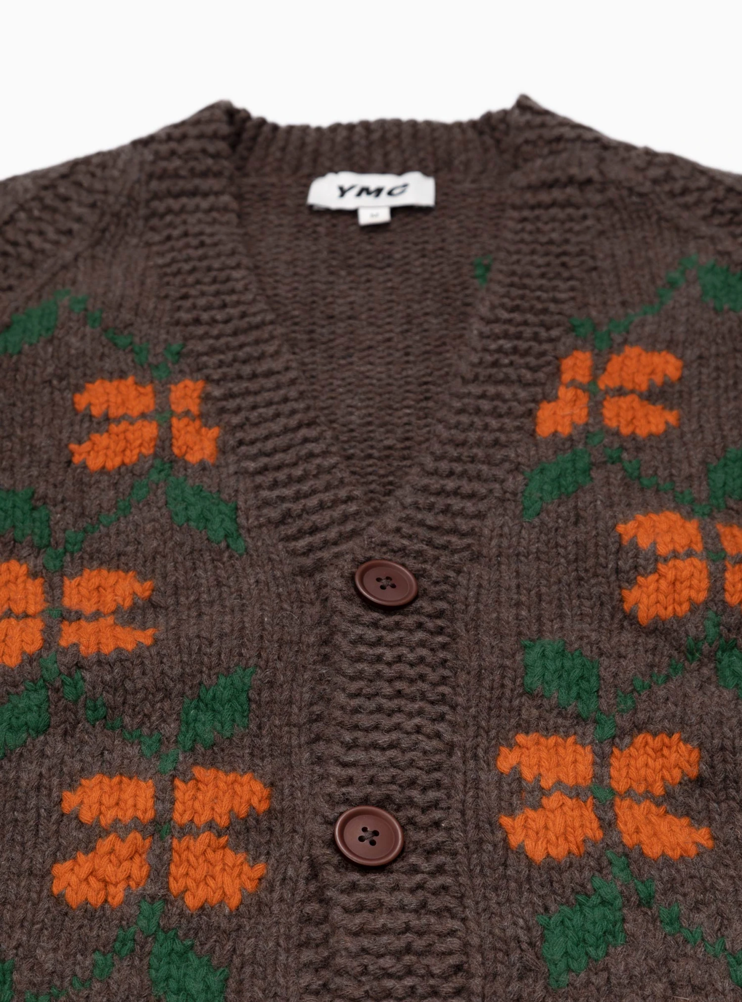 Featuring a graphic floral intarsia motif, this brown cottage cardigan from YMC is knitted from lambswool-blend yarn to a relaxed silhouette with raglan sleeves and patch pockets.