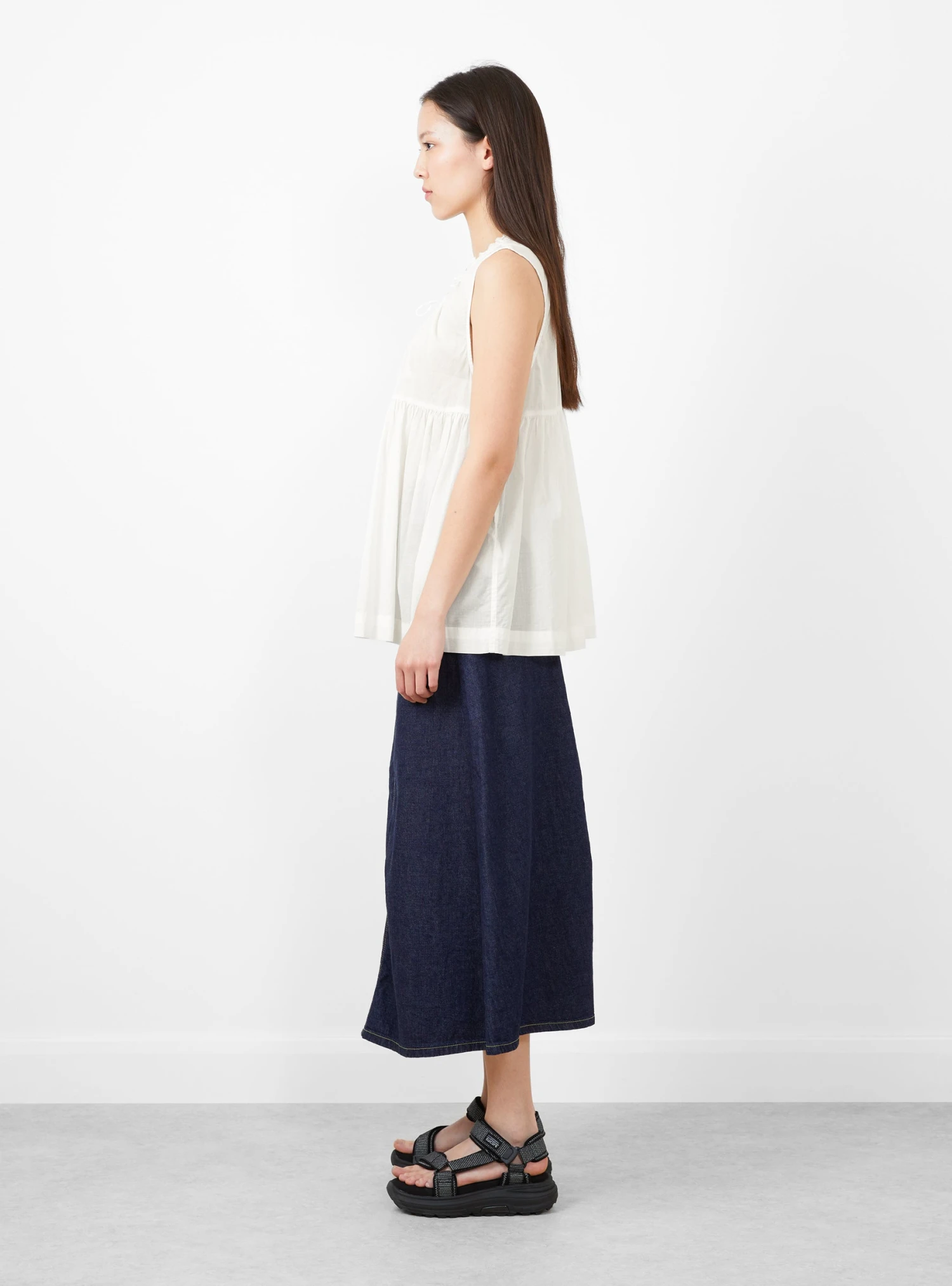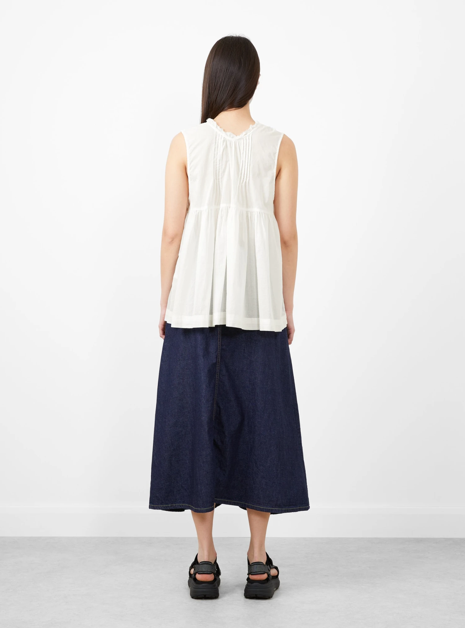 This Cotton Gathered Sleeveless Blouse in Off White from Harajuku based brand Beams Boy is crafted from 100% cotton. Featuring two front ties and a ruched neck line and a two pleats down the back, this top is cut to fall delicately and loosely.
