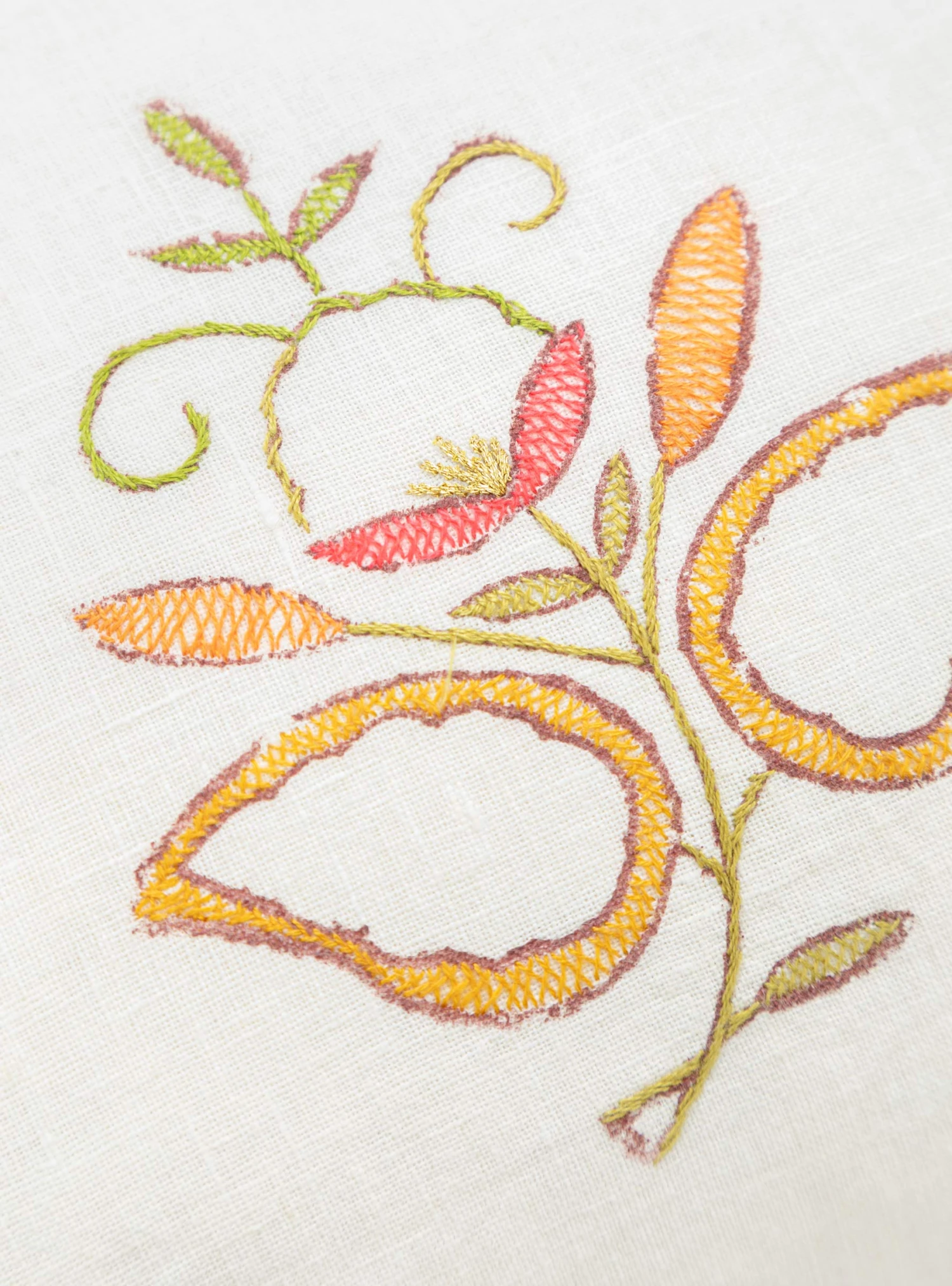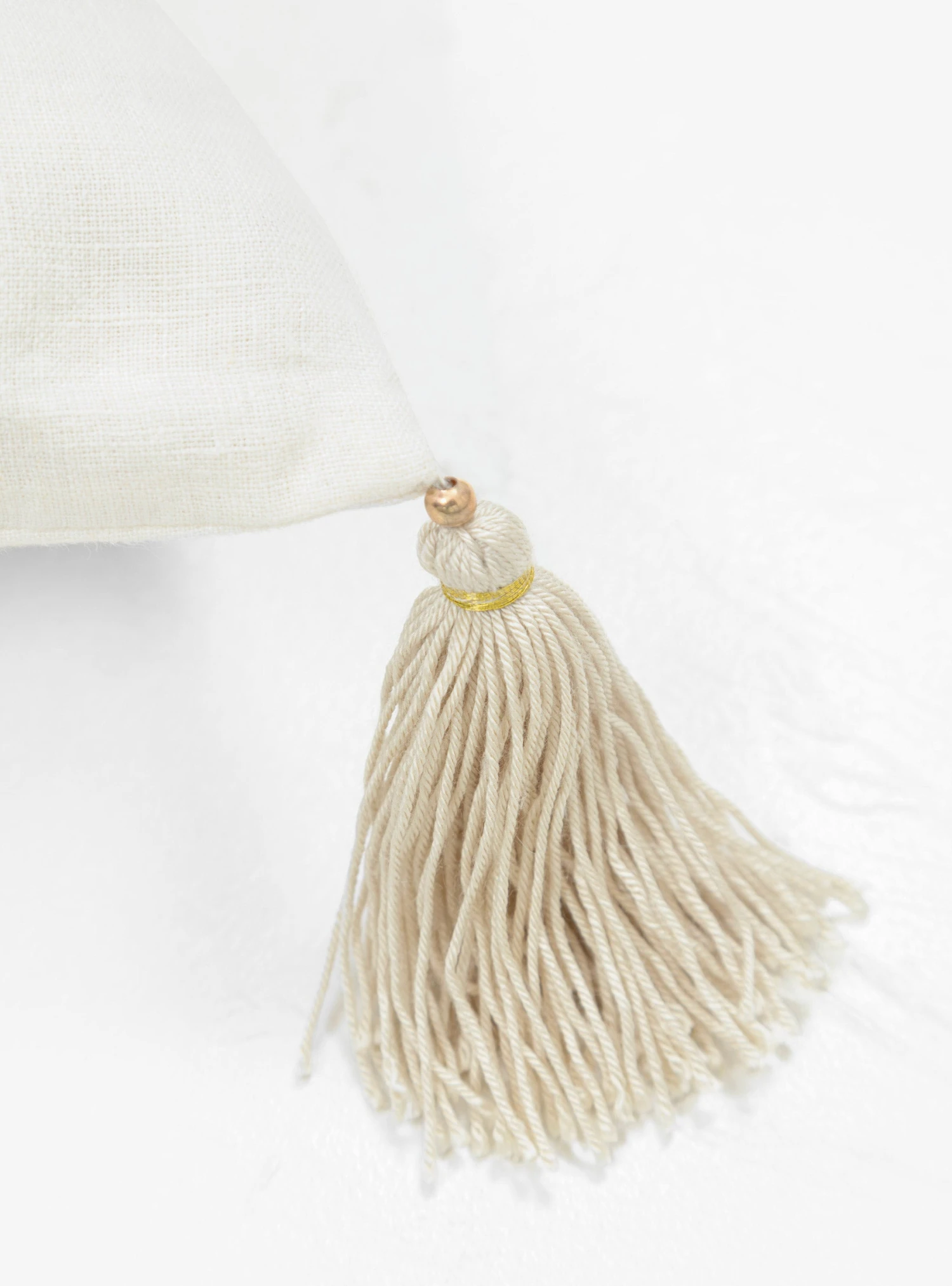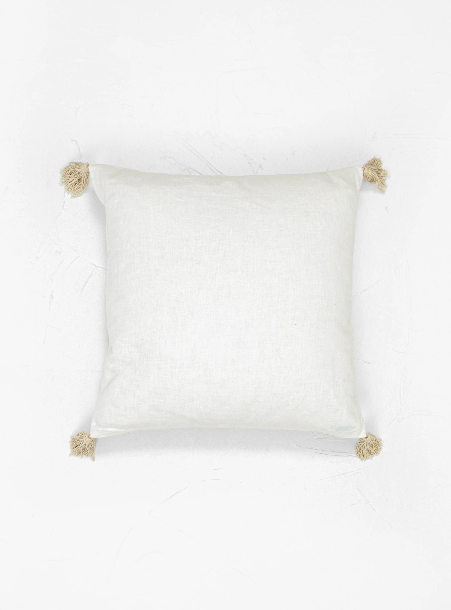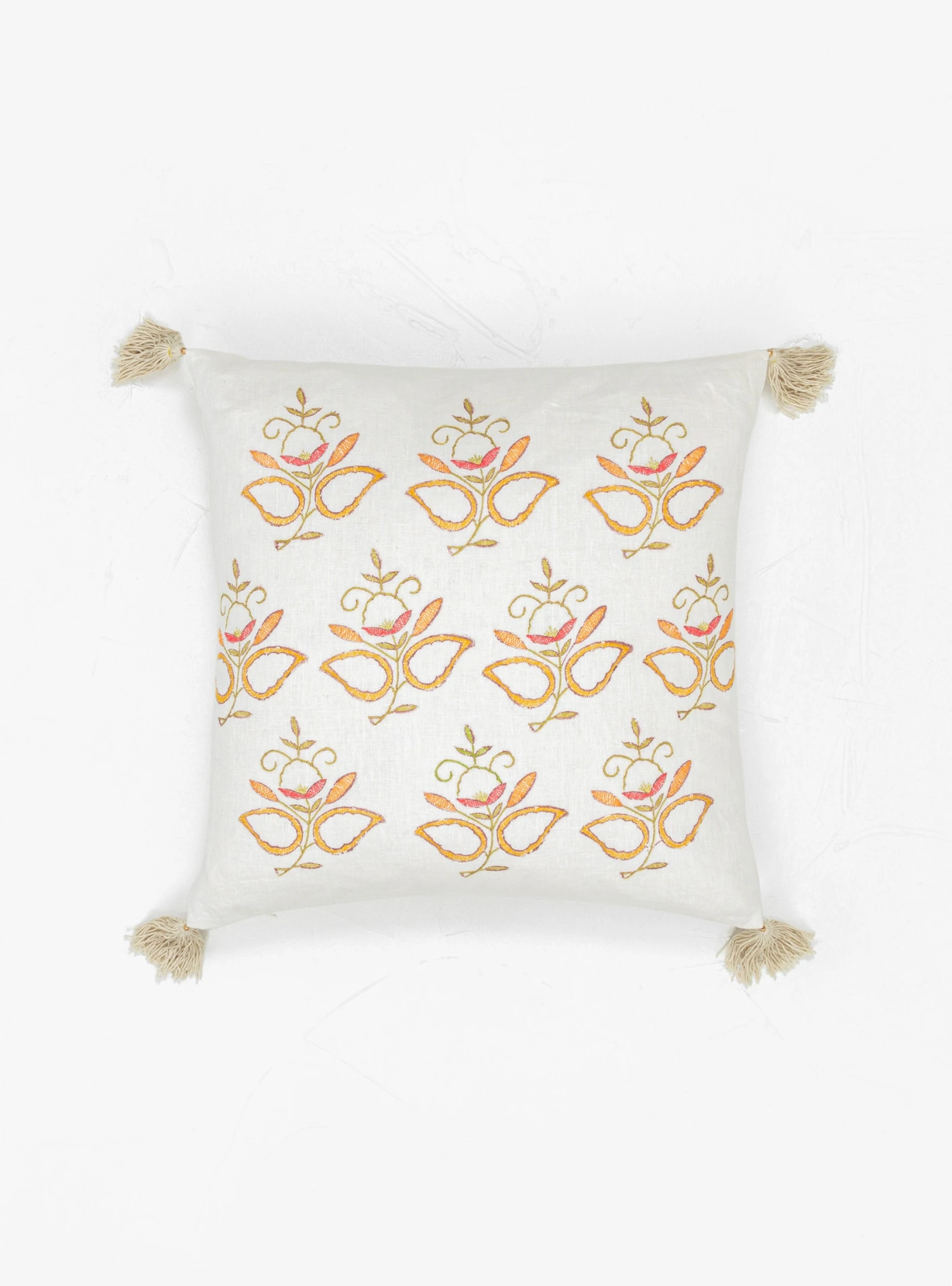 Made in Egypt from linen, this off-white Courtyard cushion from Malaika features block-printed florals with hand-embroidered accents and finished with tassel trims.