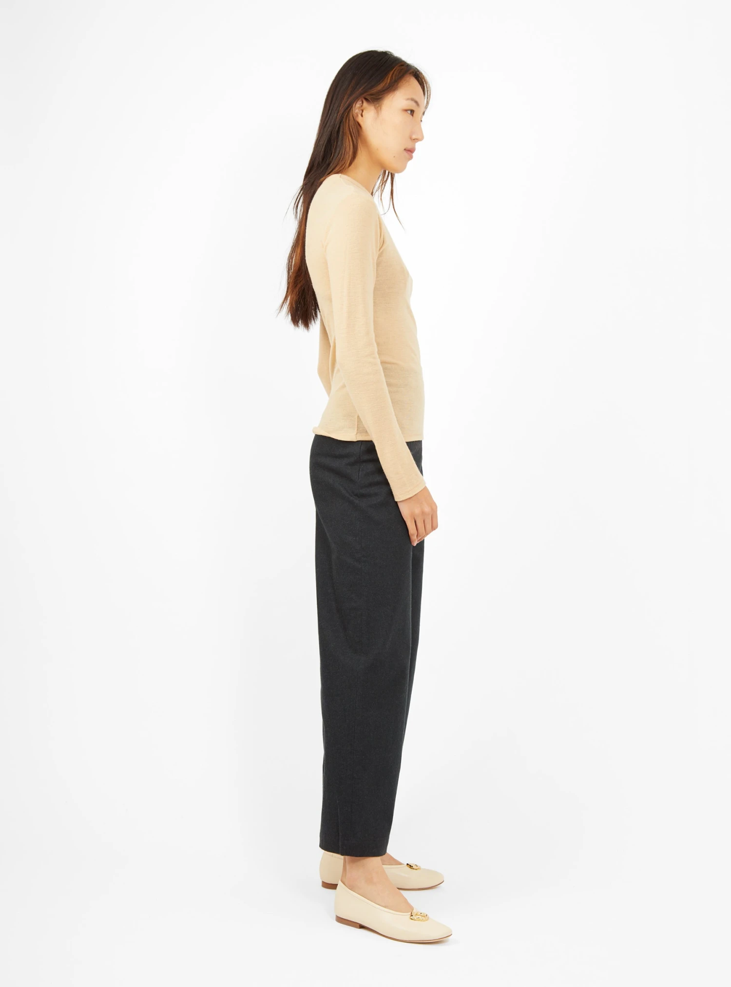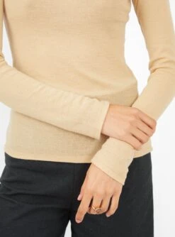 This beige Drive Long Sleeve Tee from Baserange is cut to a body-forming silhouette with a round neck. Made from the softest wool that regulates according to the temperature, this the perfect layer for the new season.