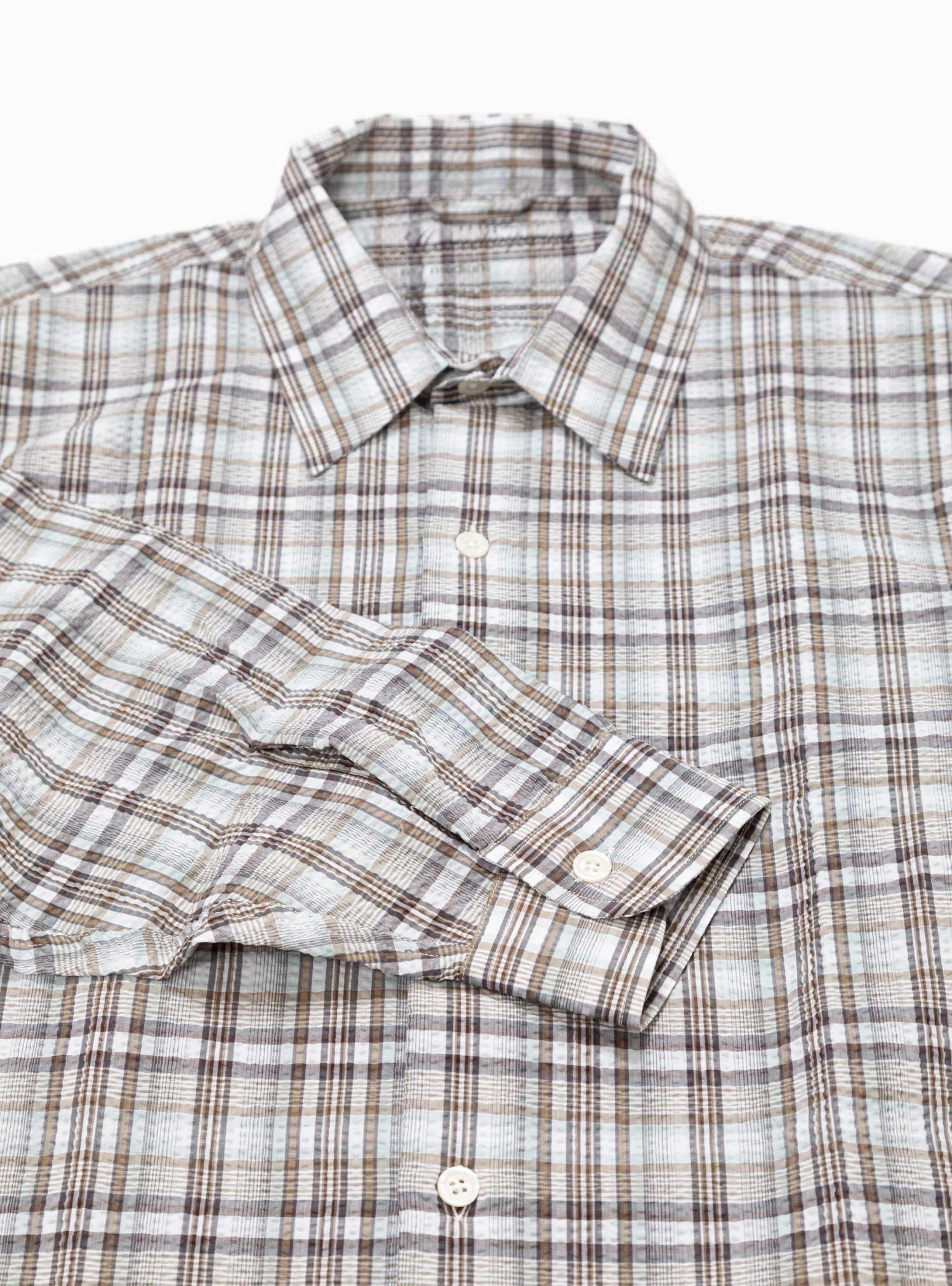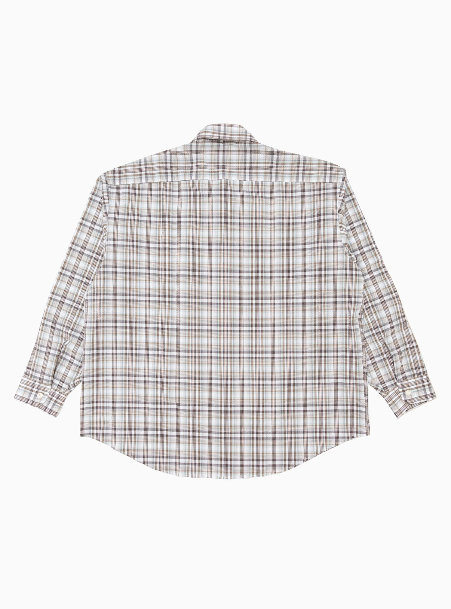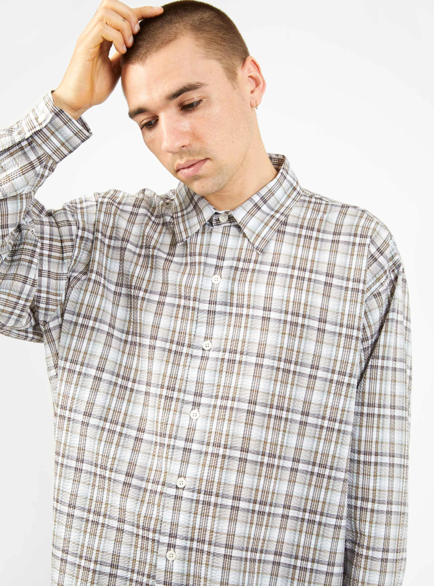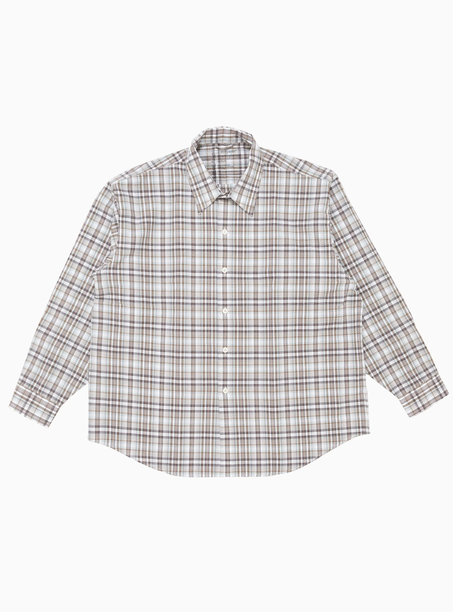 mfpen sources deadstock Italian fabrics to create pieces, such as this mint-taupe check Exact shirt, from the SS22 collection. Made from cotton seersucker, which is both soft and lightweight, it’s cut to an oversized silhouette with dropped shoulders and a curved hem.