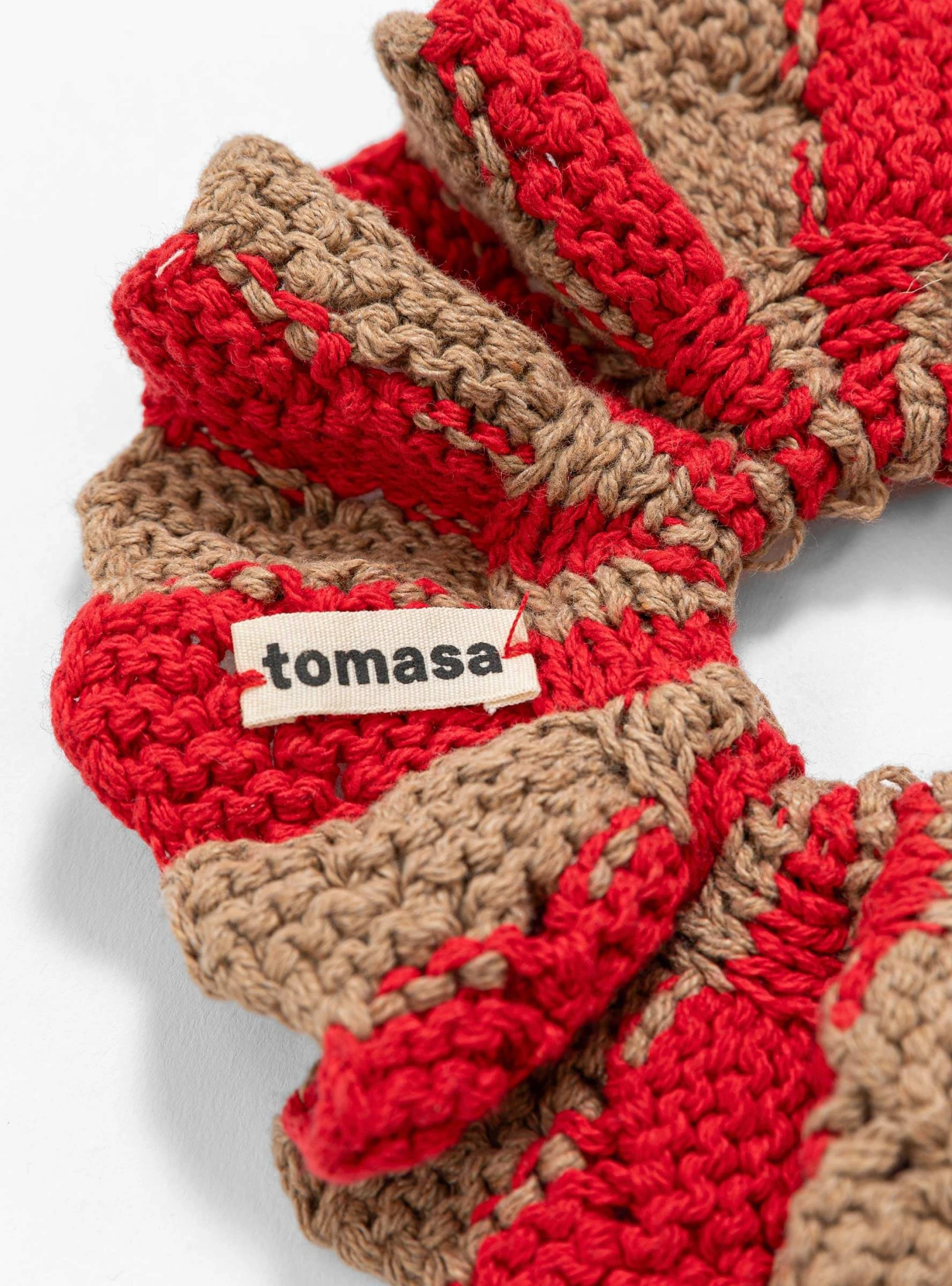 Knitted in Spain with Organic Cotton yarn, the Fernandita Scrunchie by Tomasa comes in a red and brown Amapola colourway. The textured scrunchie is oversized, defining it’s nature as a standout hair accessory.
