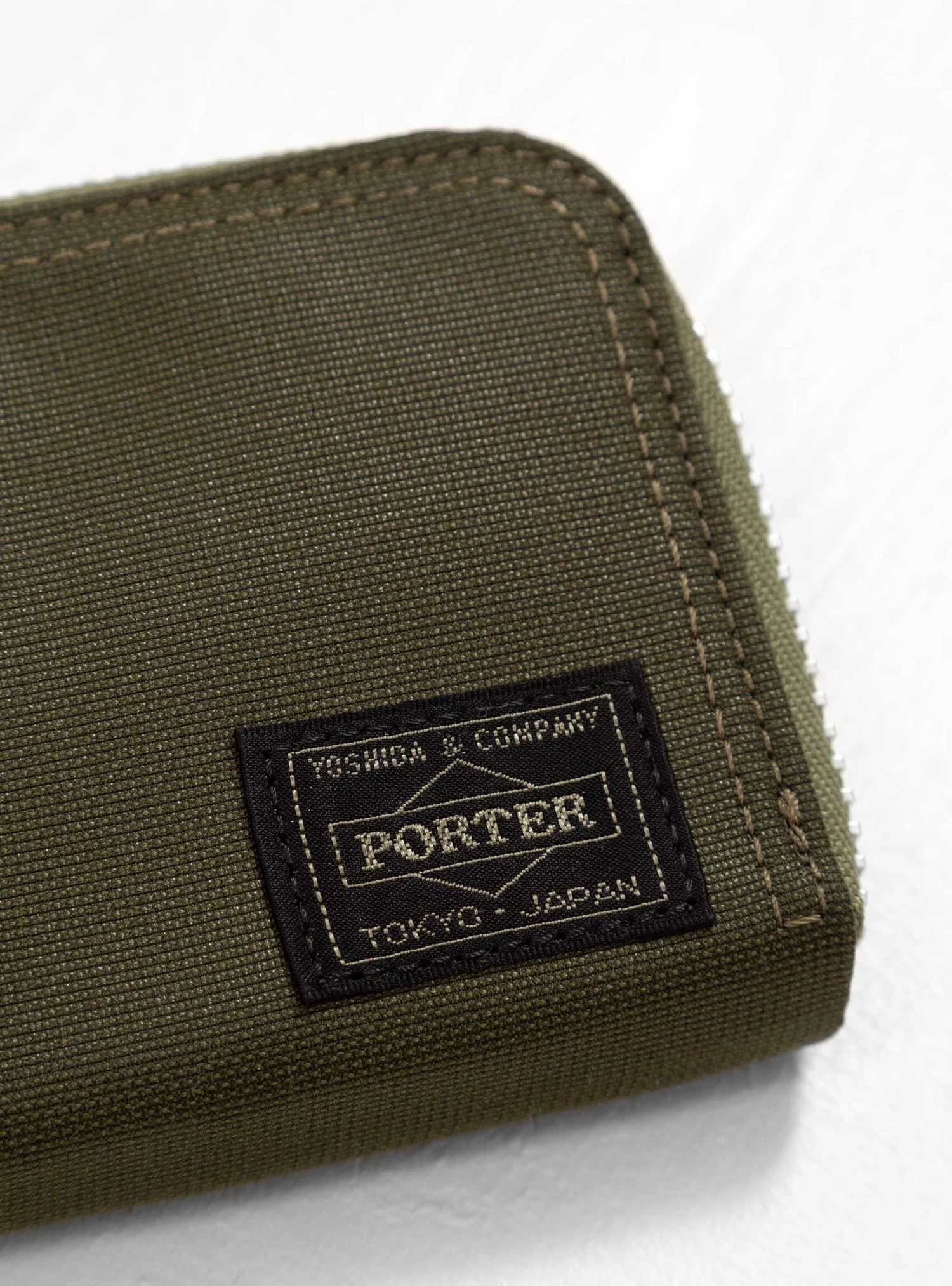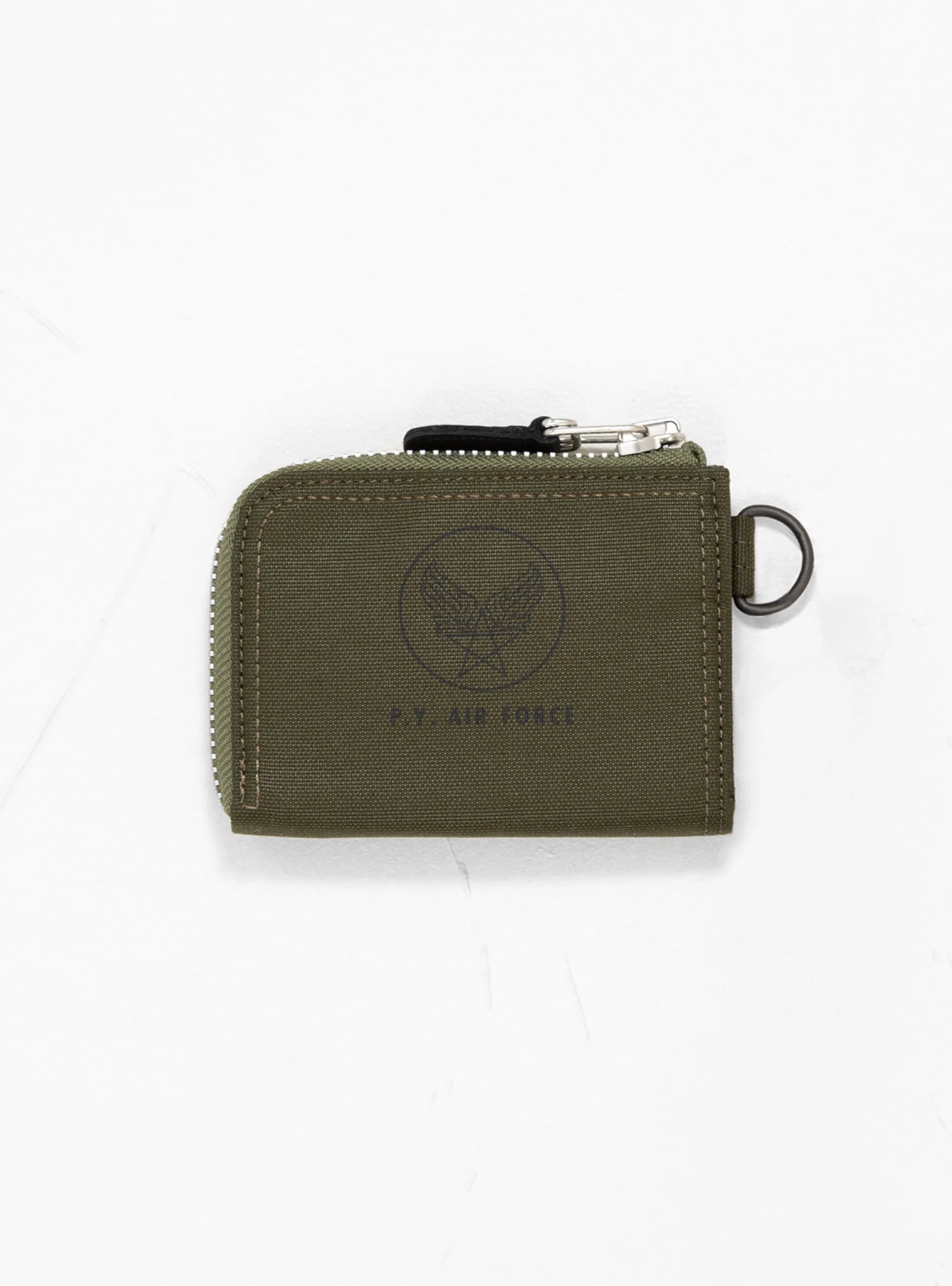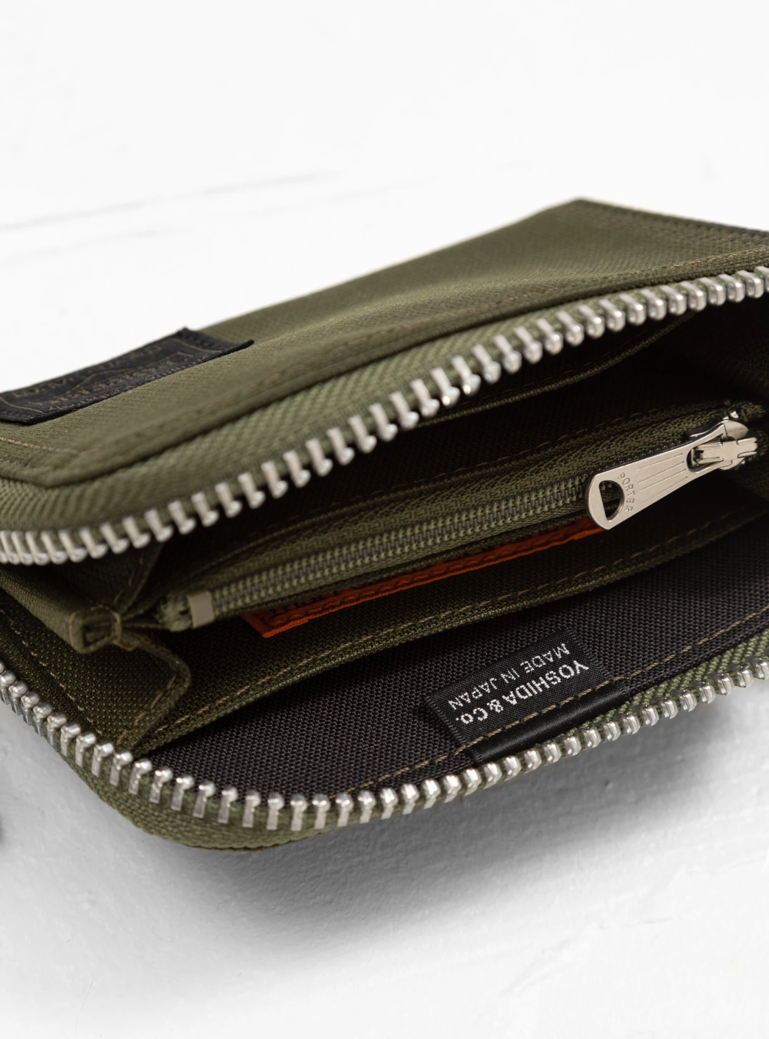 Made in Japan from nylon twill, this olive-drab Flying Ace wallet from Porter Yoshida & Co. has a wrap-around zip fastening which, when opened, reveals an internal zip compartment and two coin slots.