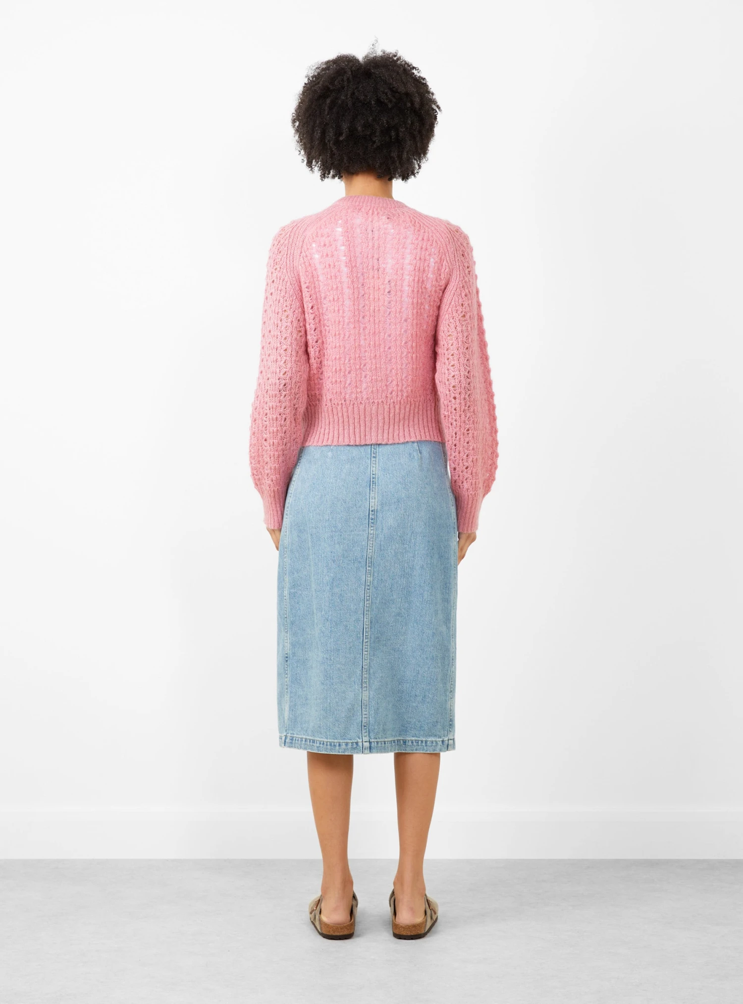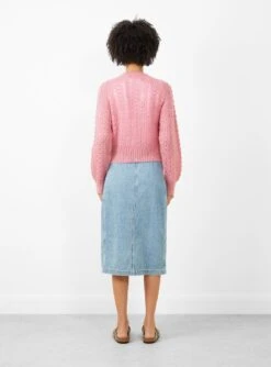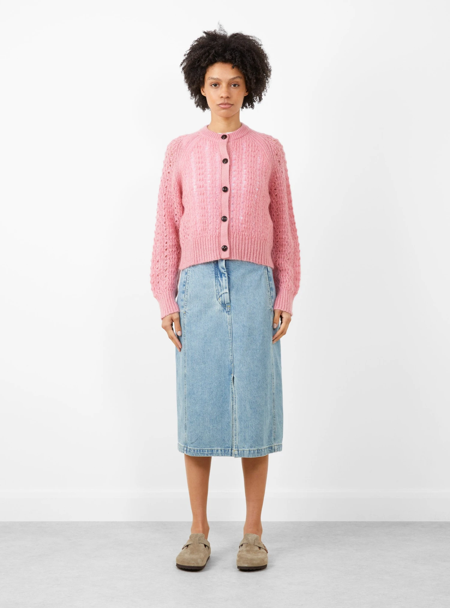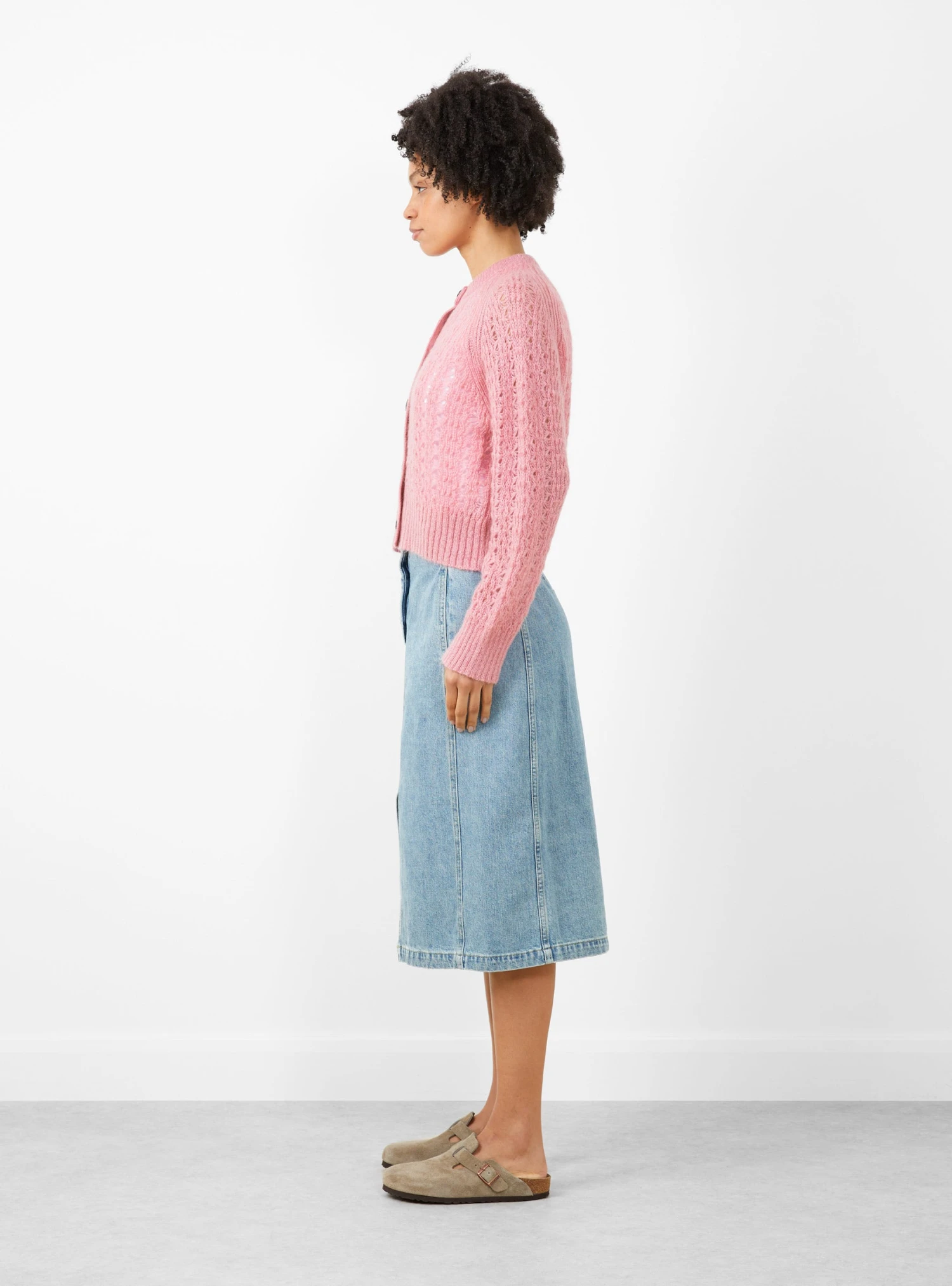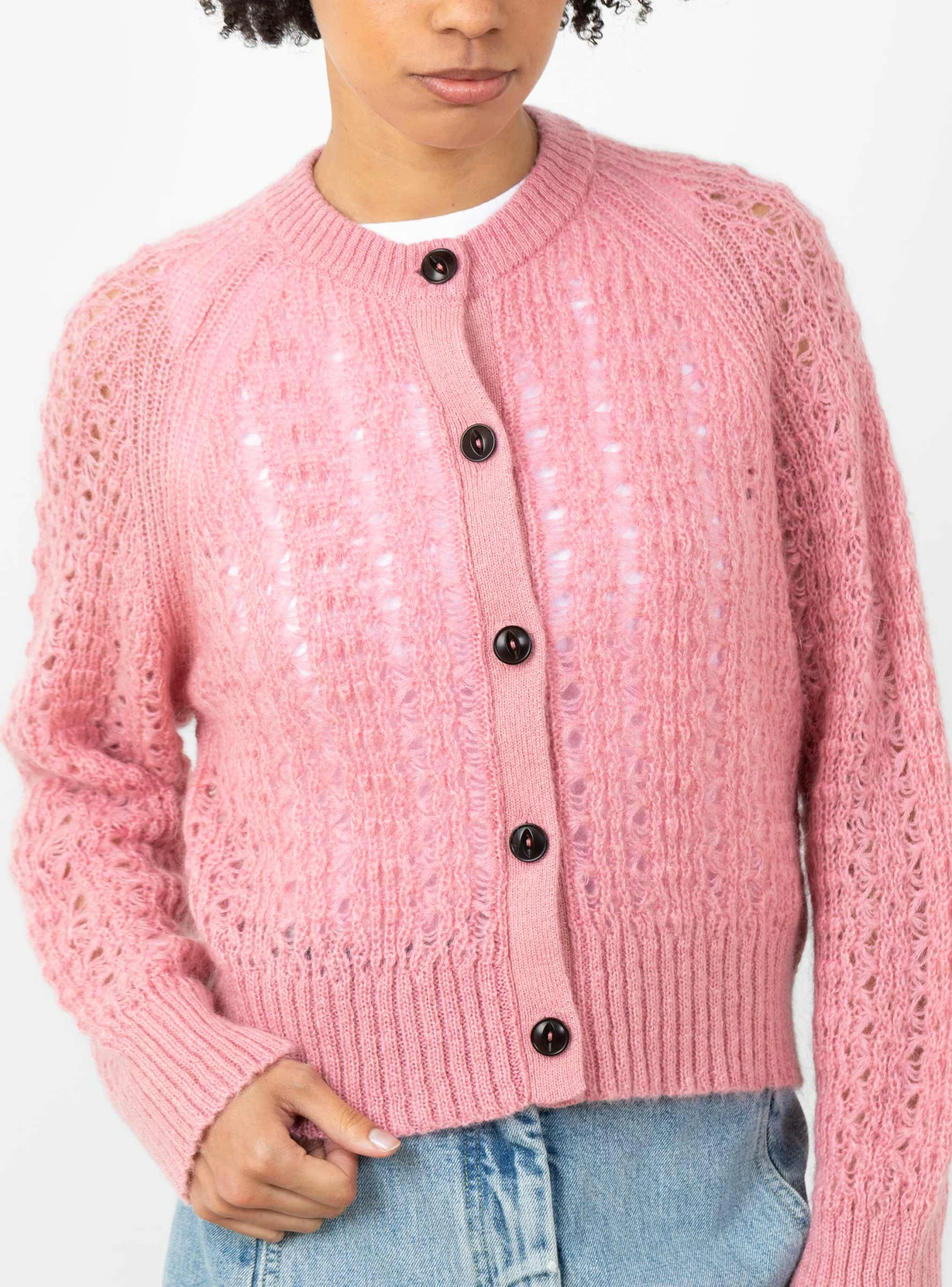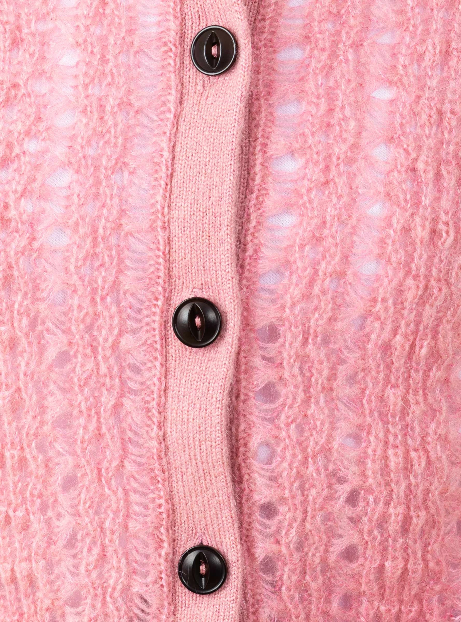 The Foxtail Cardigan from YMC arrives in a soft pink. Made in Portugal from a mohair wool blend yarn, the cardigan falls to a relaxed fit with a cropped finish. A ladder stitch give the lightweight cardigan texture and ribbed trims and a corozo button front fastening finish the garment.