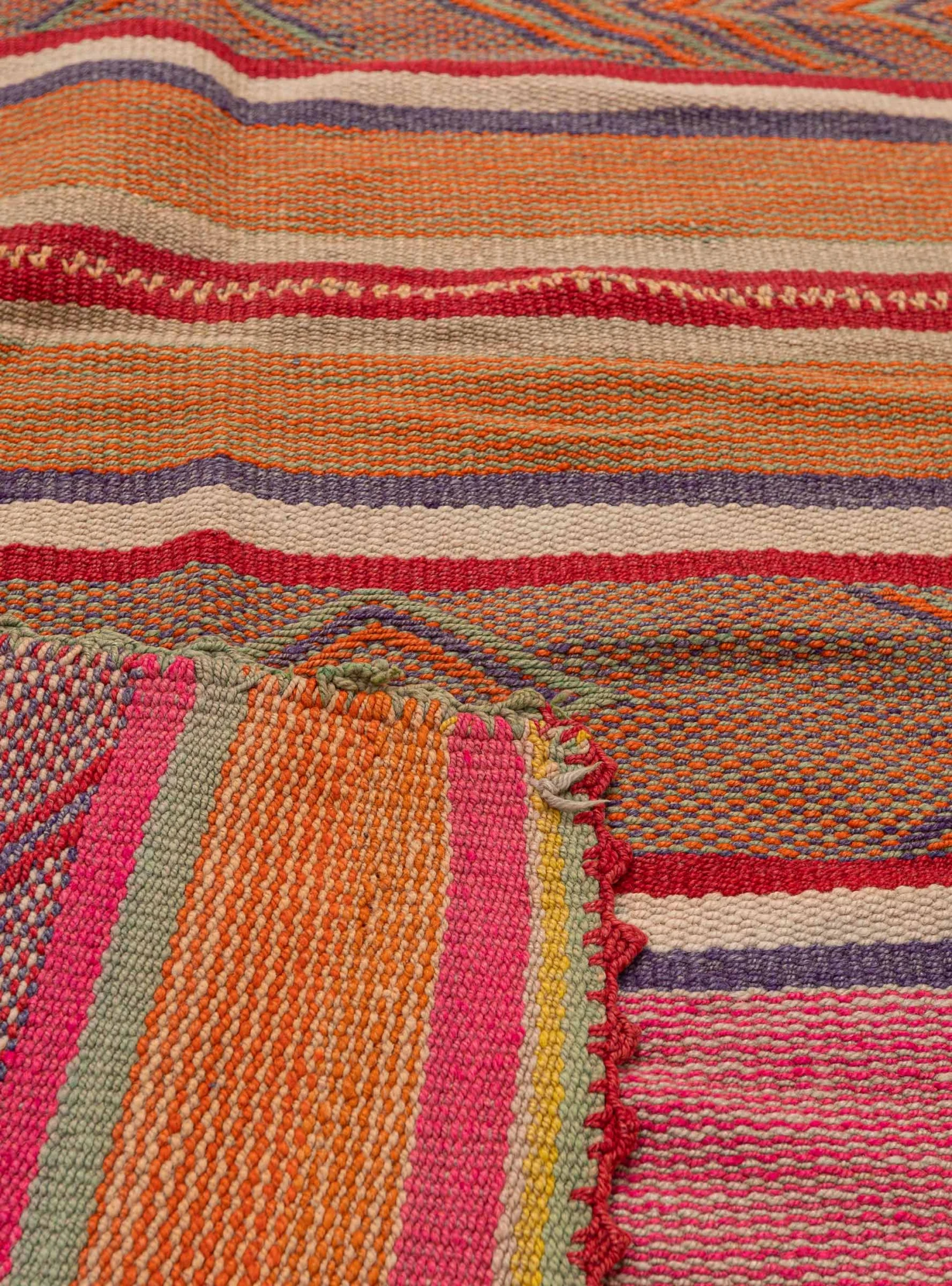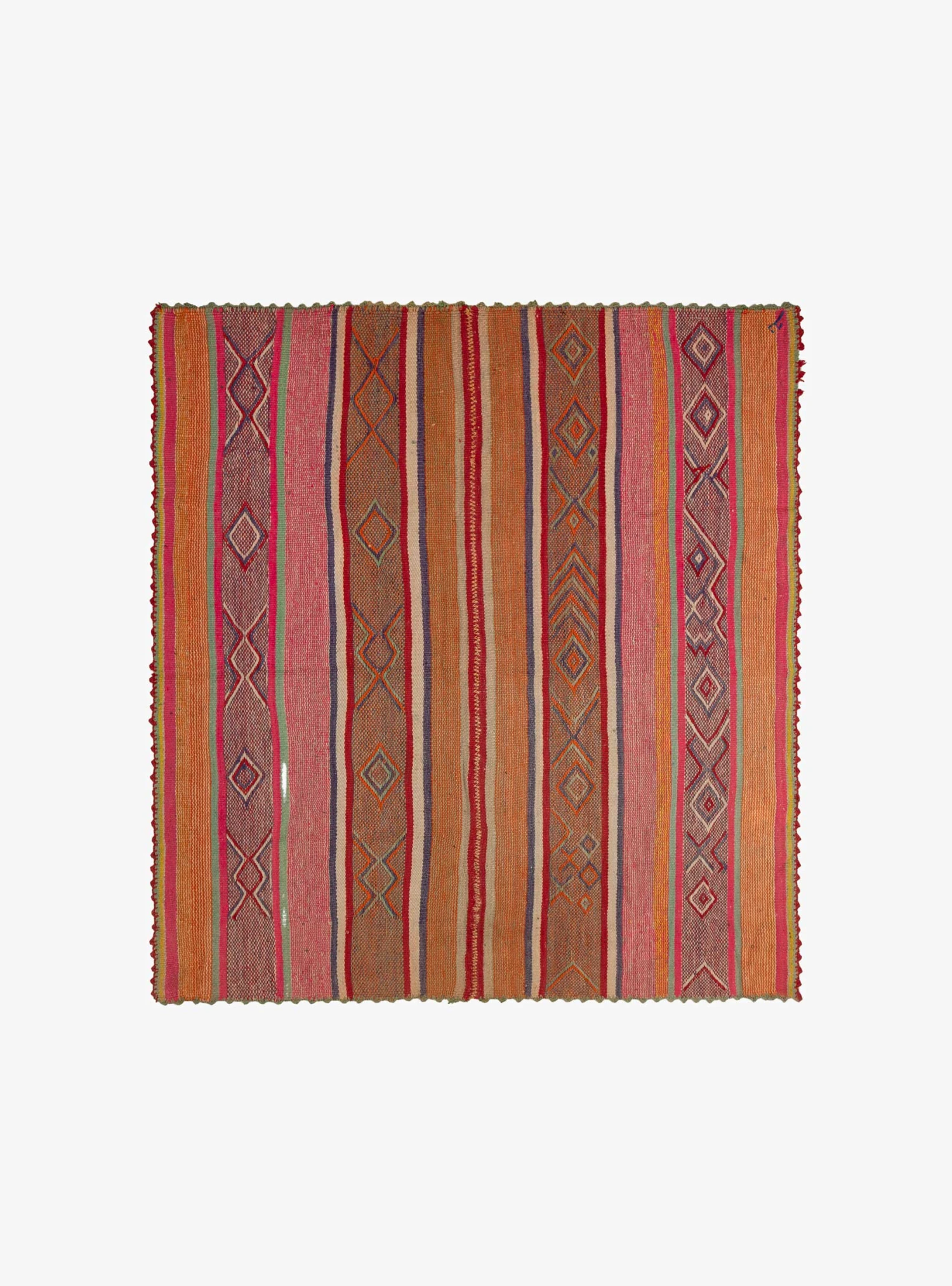 This blanket/ rug from Llamative is woven in a multi stripe, with smooth, marbled borders and woven geometric designs. Handwoven high in the Andes on a wooden loom from sheep wool, it celebrates the craft of those who live in isolation in the South American mountain range through manufacturing techniques and natural pigment dye.