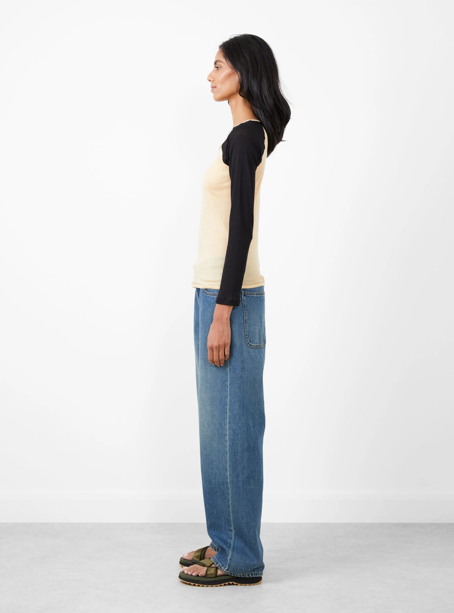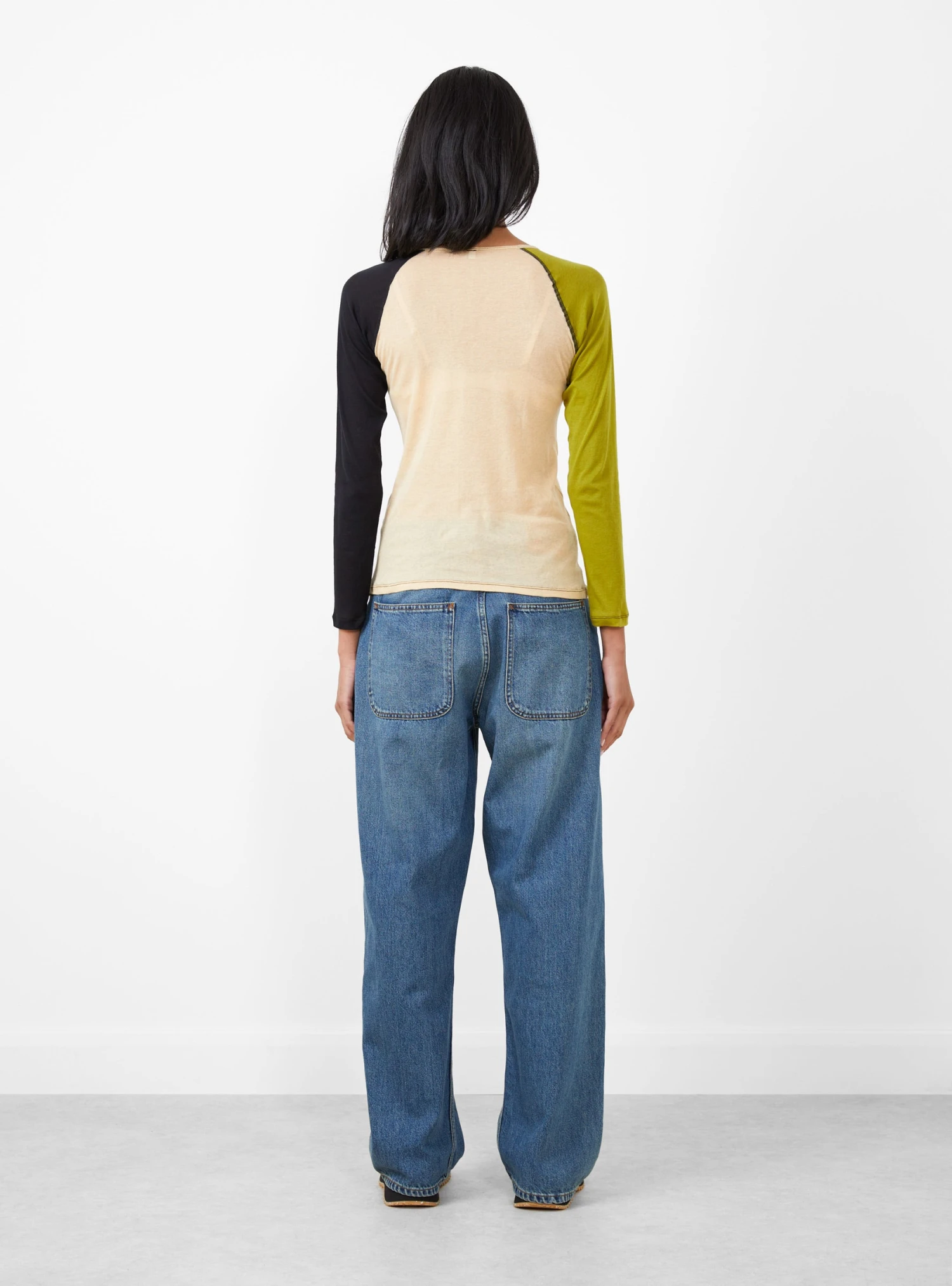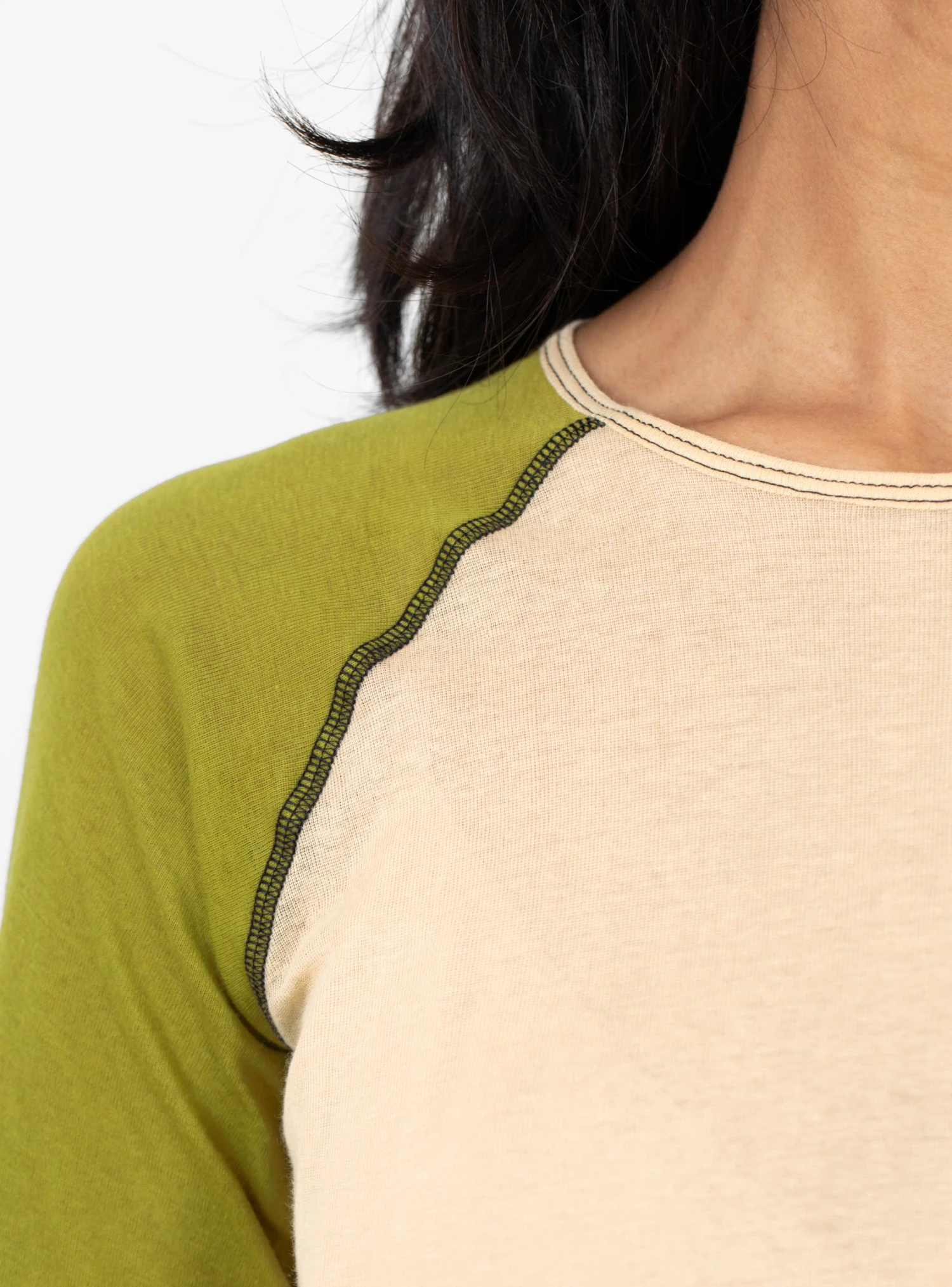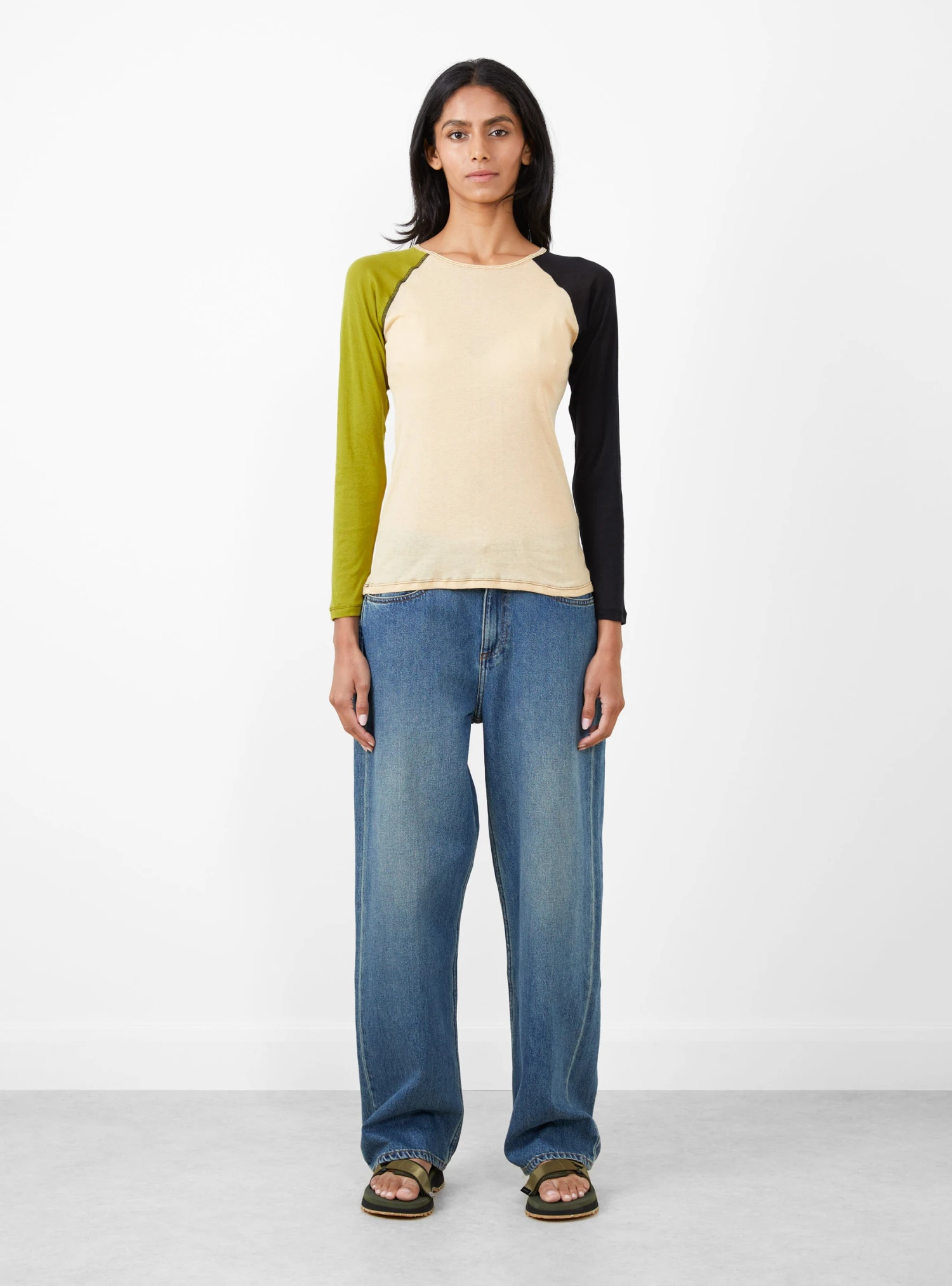 The Gene Long Sleeve Top from Baserange comes in a beige, khaki and black. Made in Portugal from organic cotton, the top falls to regular, slightly form-fitting silhouette takes after classic baseball styles with contrast stitching and different coloured sleeves. A wide neck and ribbed trims finish the top.