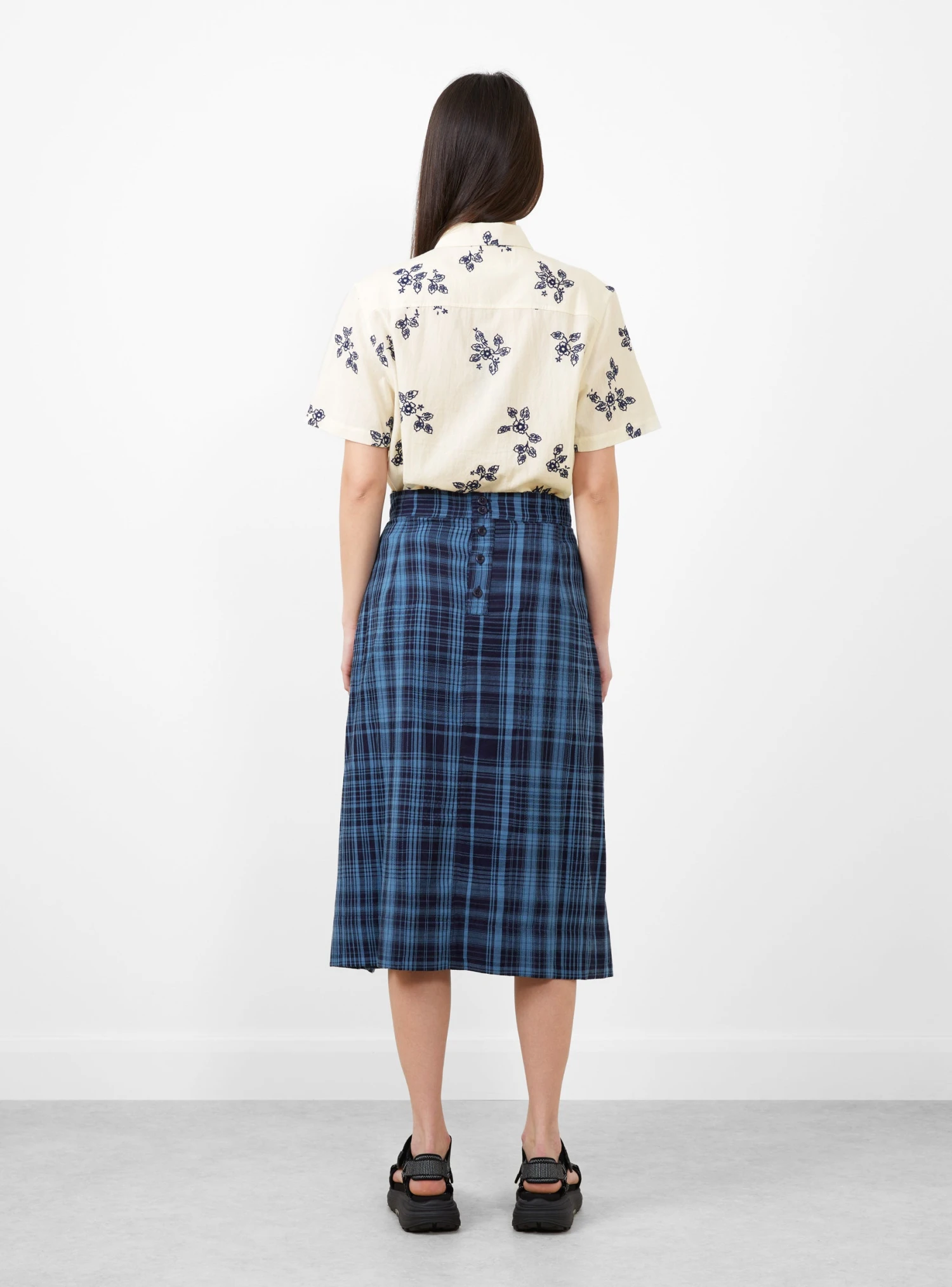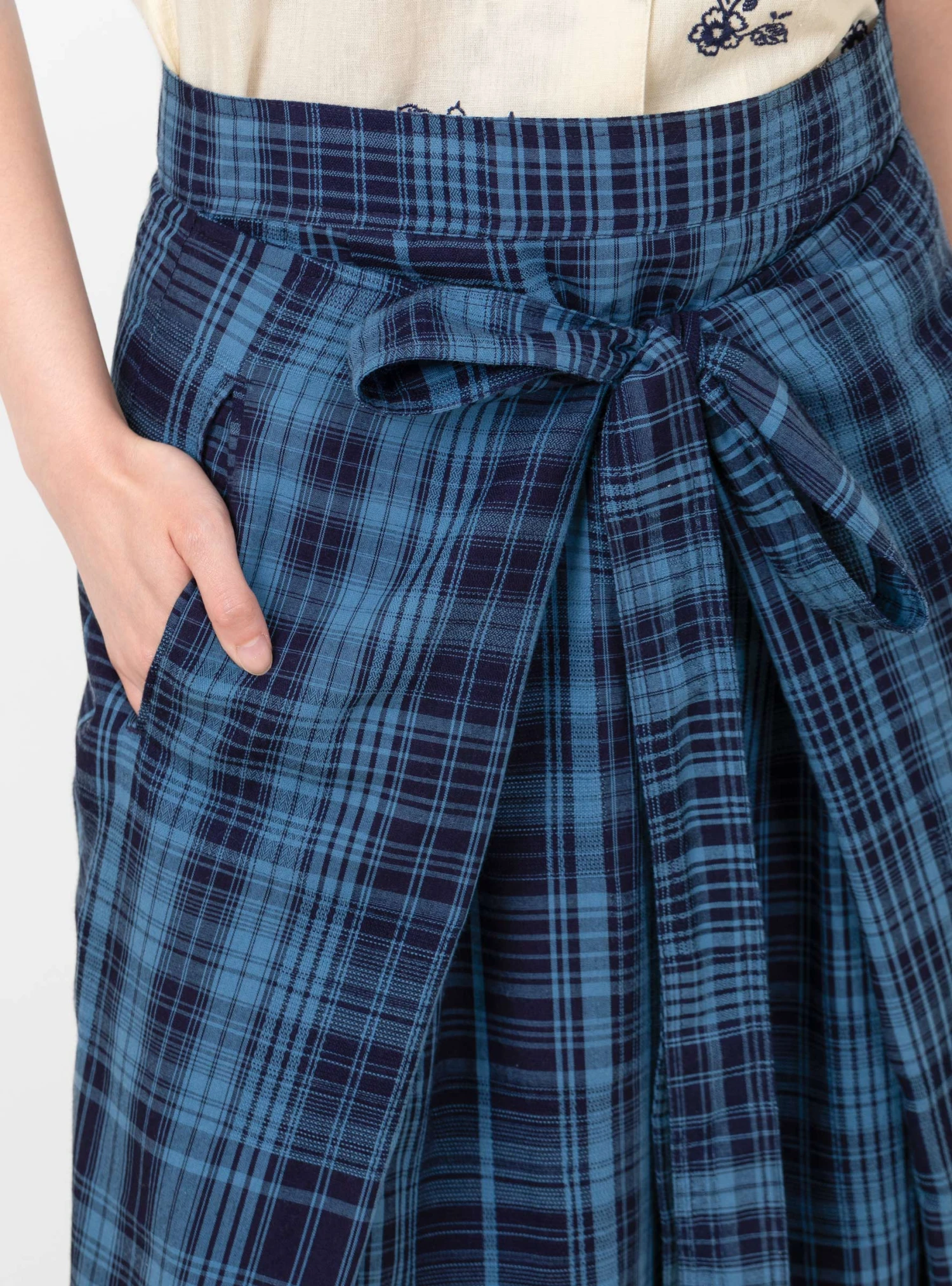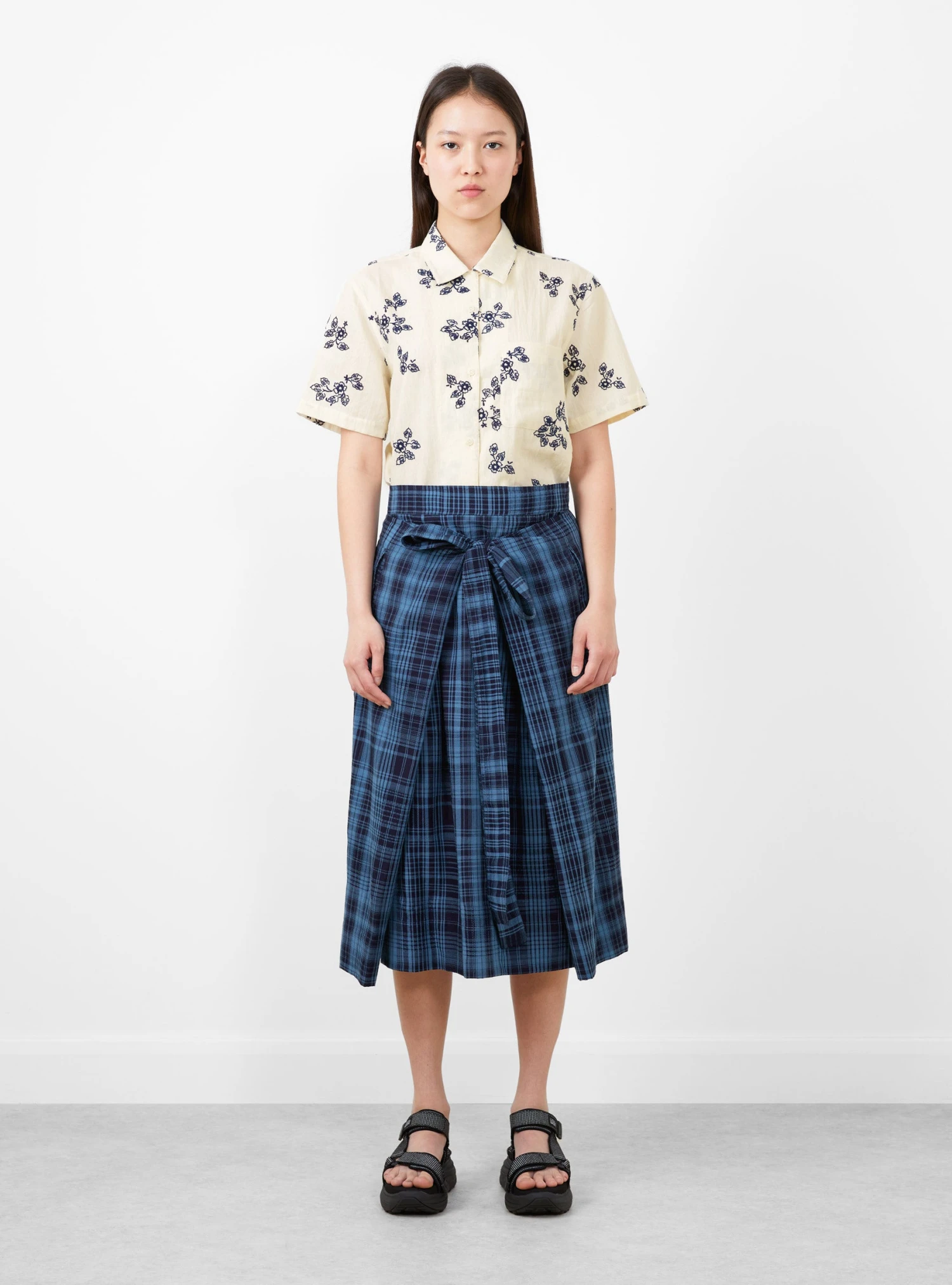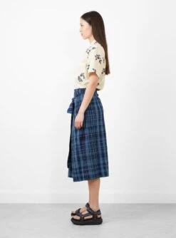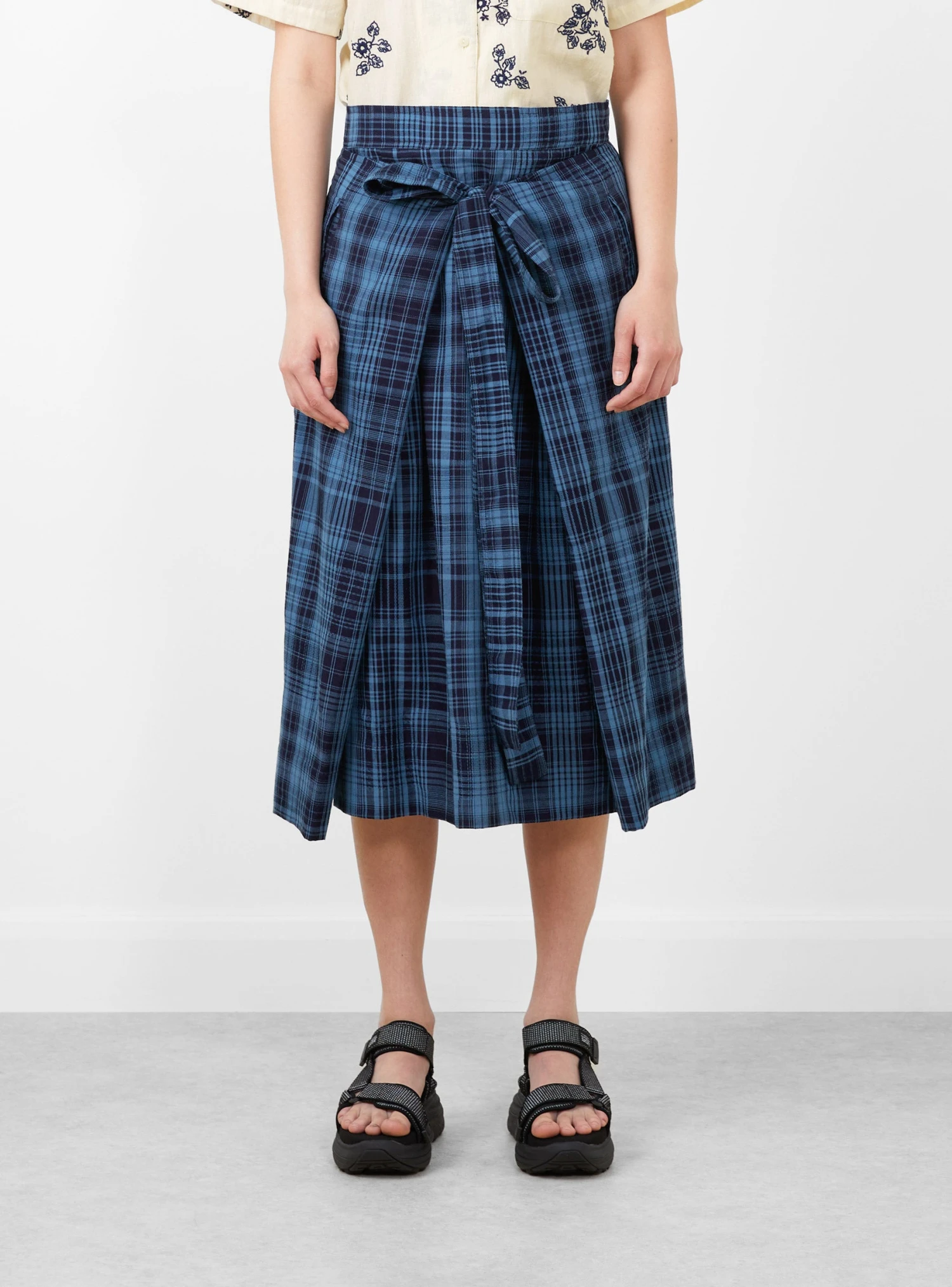 The George Skirt from YMC comes in an Indigo Check. Cut from a soft, garment washed and lightweight cotton, the straight mid-length skirt features a wrap waist tie, giving the skirt pleats when tied. Side welt pockets and a back opening with a half button stand round off the skirt.Ā
