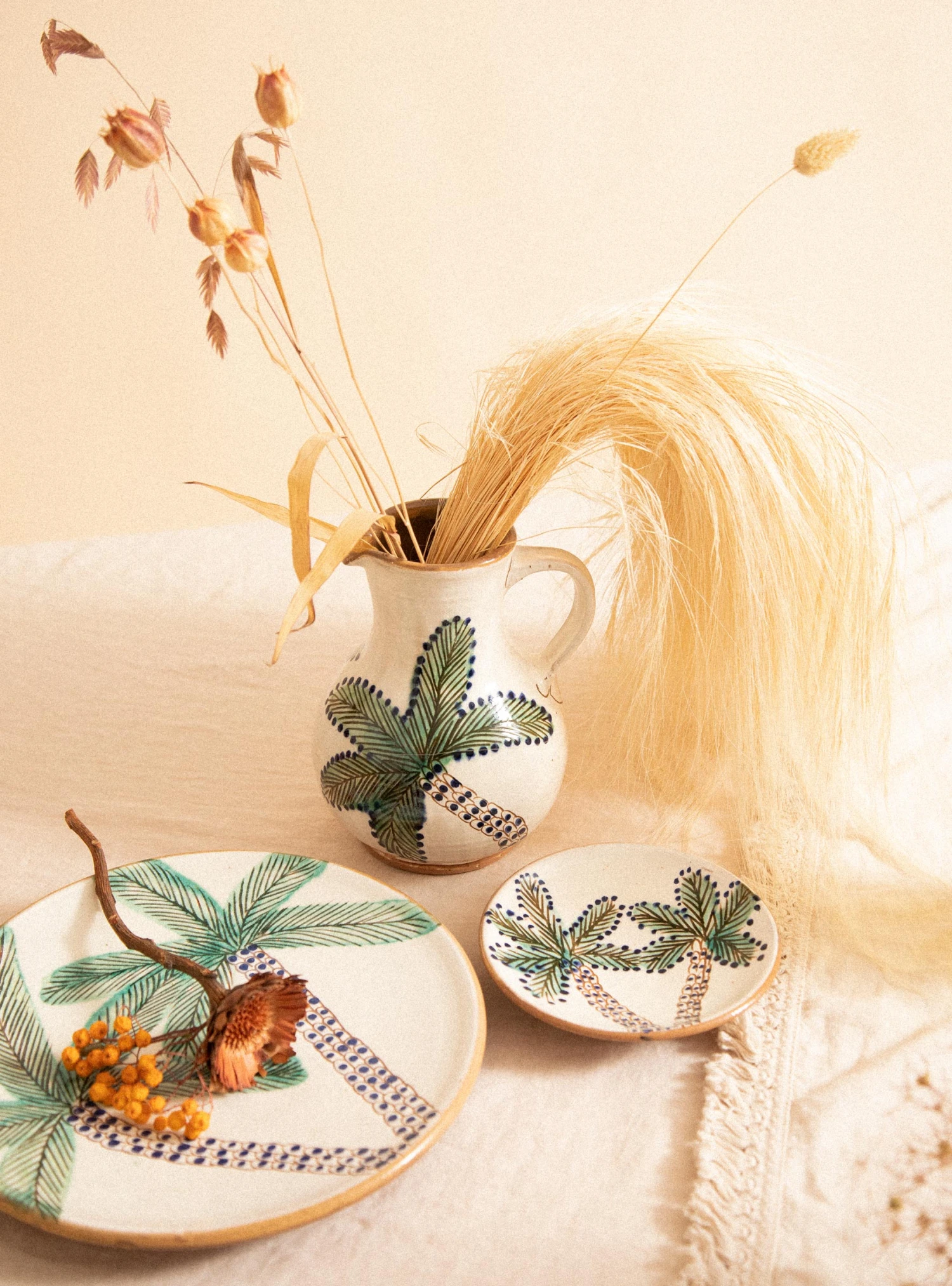 Malaika enlists highly skilled Egyptian artisans to create its range of homeware, including these white Green Leaves espresso cups, handcrafted from clay by a potter in the oasis village of Tunis, Fayoum.