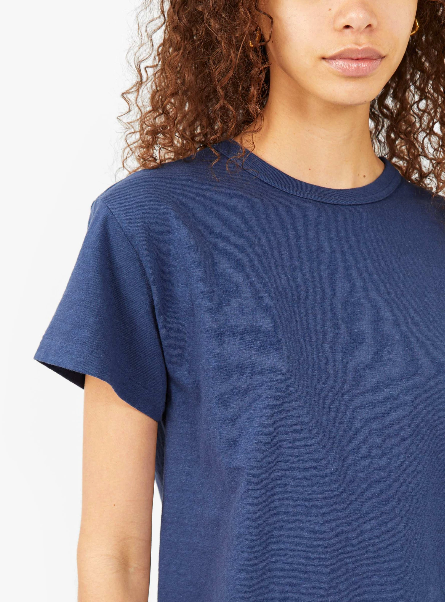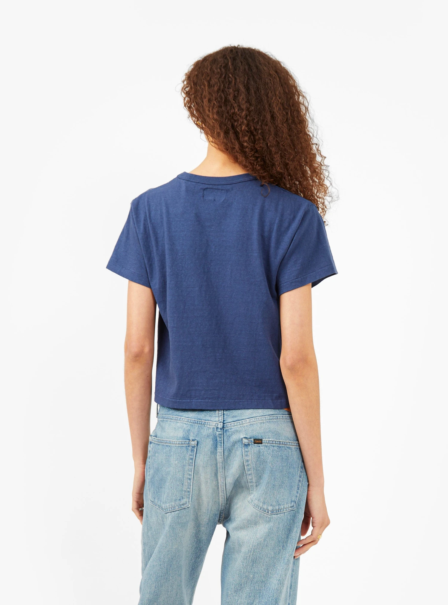 Made in Japan from recycled Ochiwata cotton using one of the last two antique loopwheel knitting machines, which avoids the need for side seams and creates less tension on the fabric, this insignia-blue Hi’aka T-shirt from Sunray Sportwear has a boxy silhouette with a cropped hem.Â