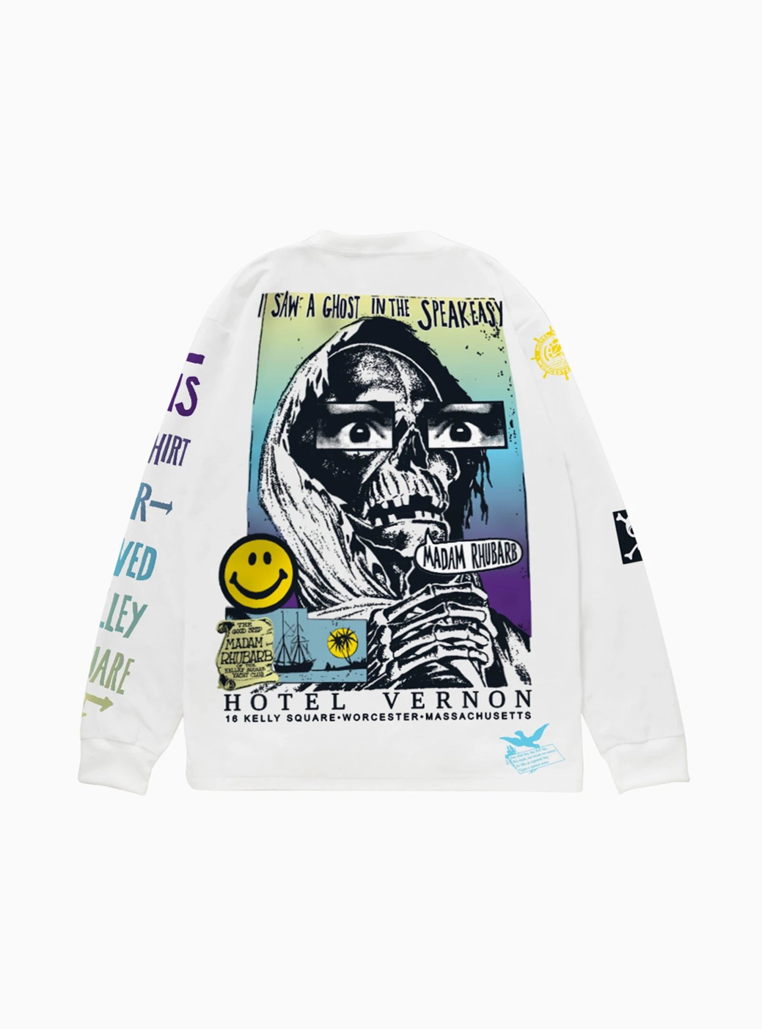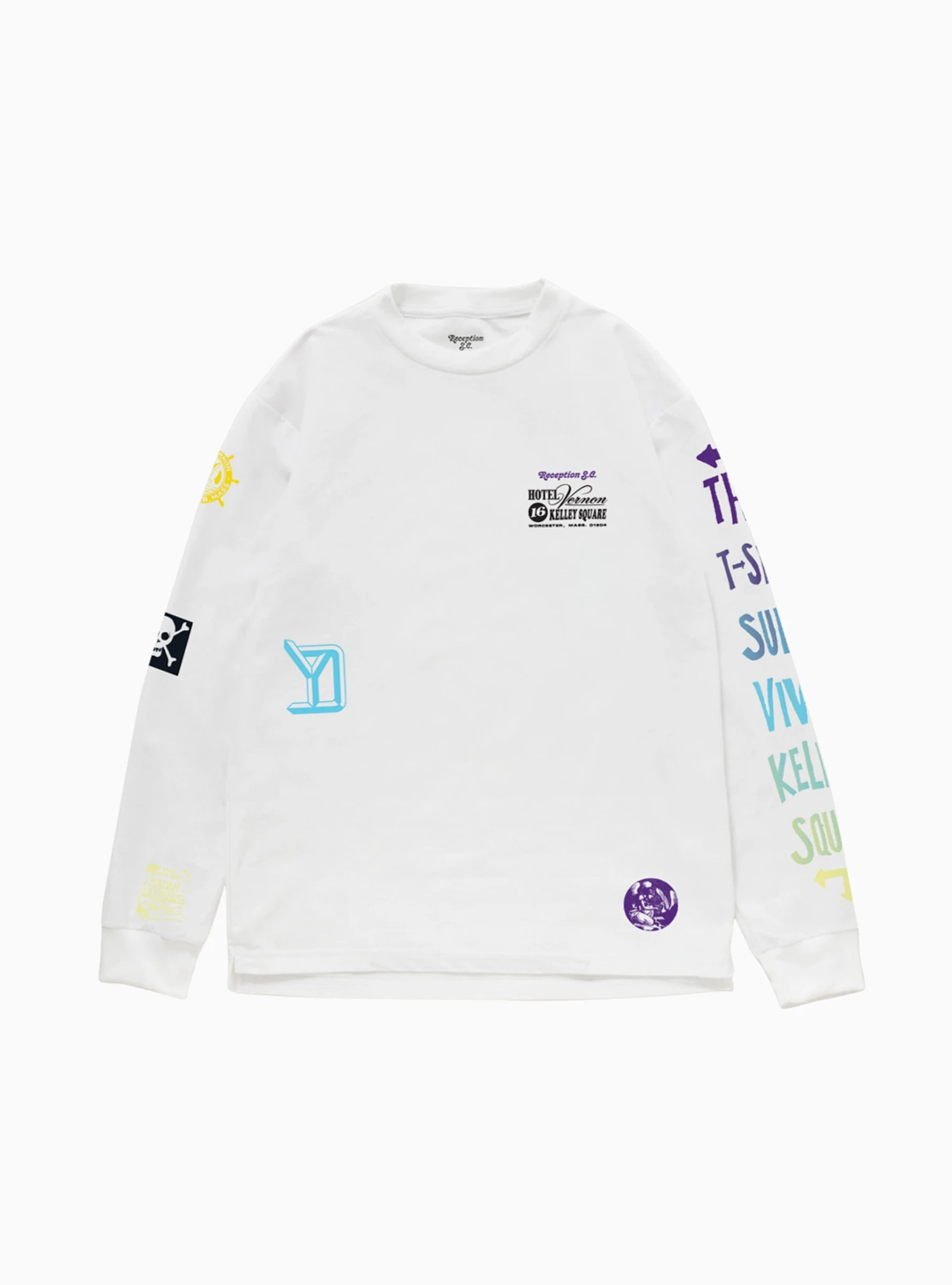 As part of the Fall 22 collection, Reception pays homage to some of its favourite food establishments, creating this white Hotel Vernon T-shirt in collaboration with artist B. Thom Stevenson. Made in Portugal from cotton jersey, it’s cut to a classic-fit silhouette with printed graphics throughout.