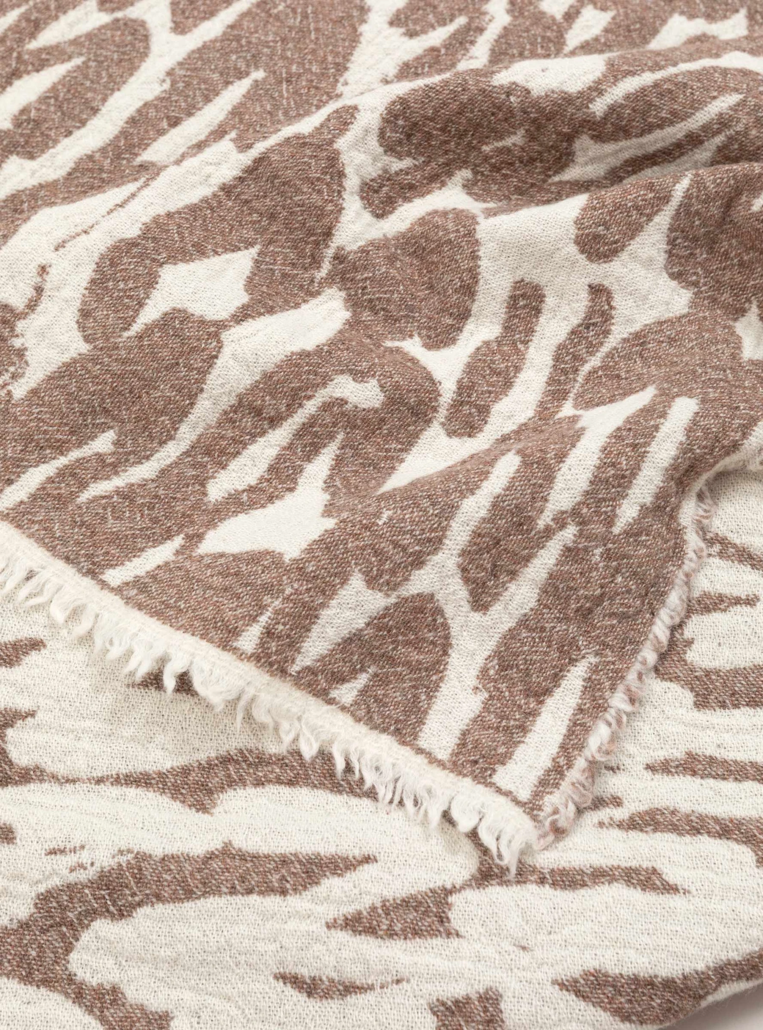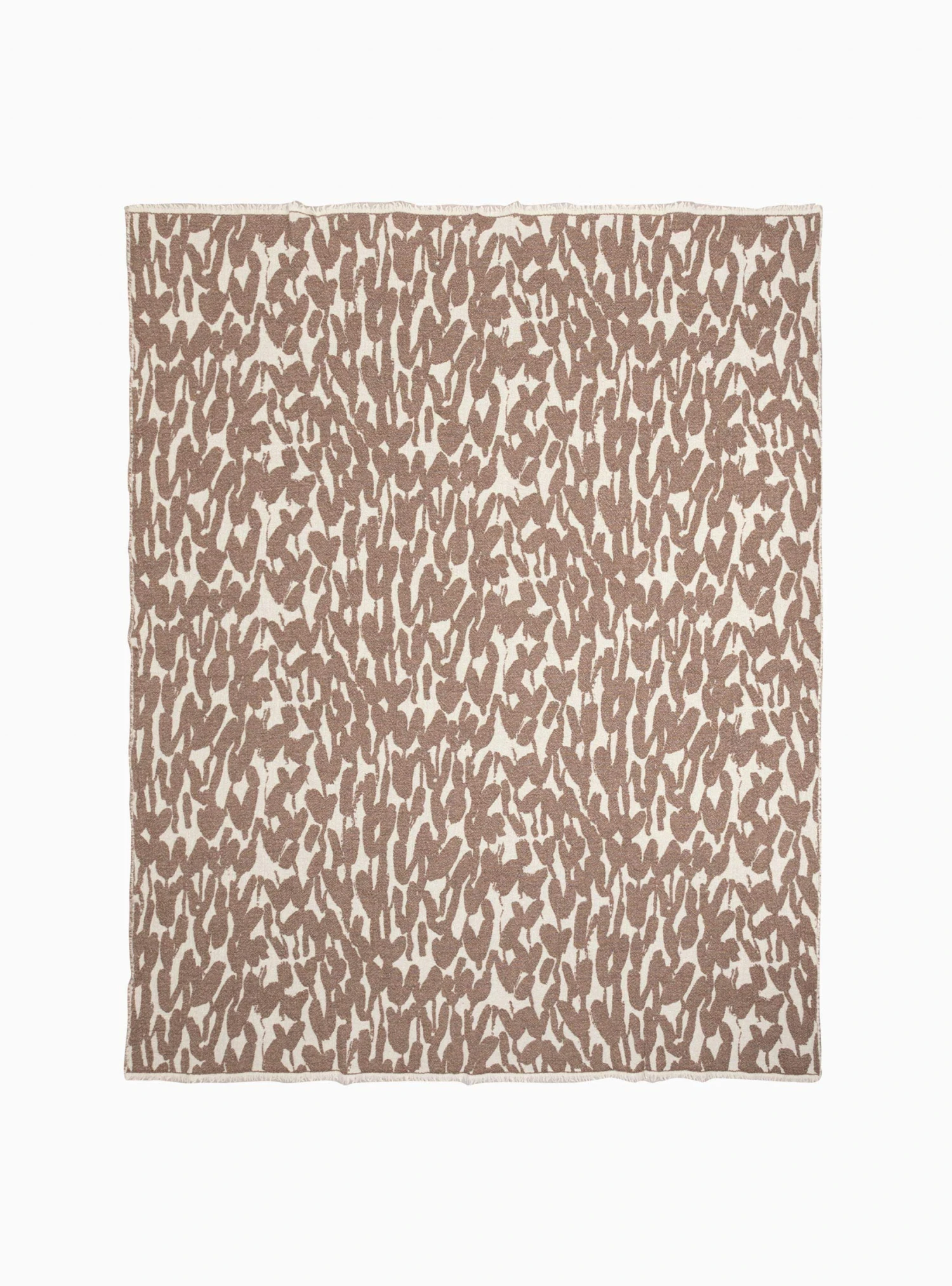 Made in Finland from extra-soft merino wool-blend yarn, this white and brown Jakala blanket from Lapuan Kankurit features an abstract motif inspired by the forest.