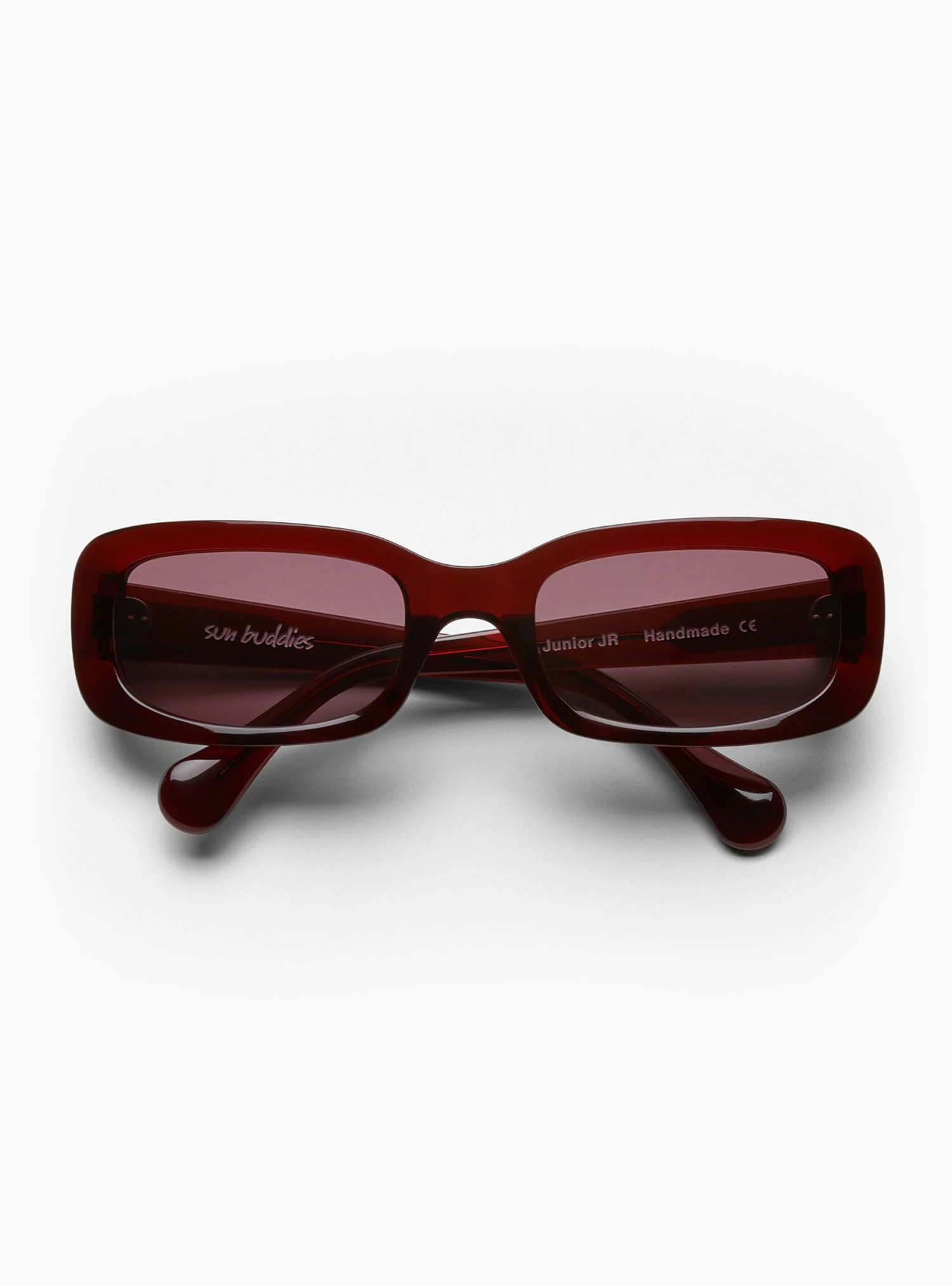 Handmade from sturdy Italian acetate, these bourgogne-red Junior Jr sunglasses from Sun Buddies feature red Carl Zeiss lenses to provide 100% UV protection.