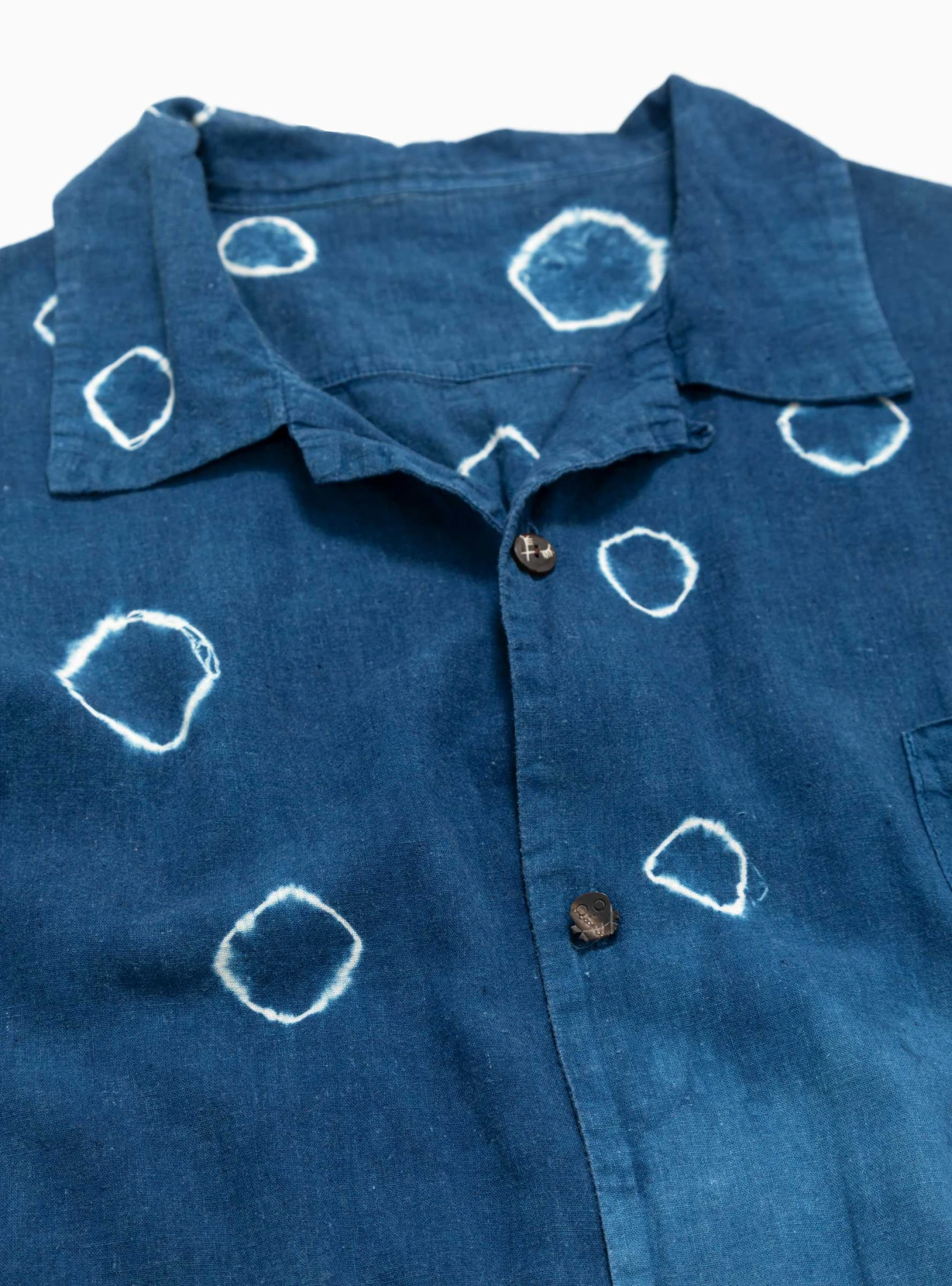 This Kapital Aloha shirt demonstrates two traditional Japanese dying techniques – indigo dip dying and Shibori. Made in Japan from soft and lightweight cotton, it has a classic silhouette with a spread collar and chest patch pocket.