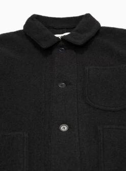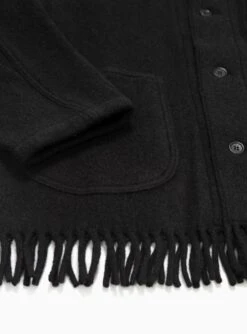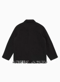 The black Labour Chore jacket from YMC’s AW22 collection takes inspiration from French workwear. Made from soft virgin wool-blend felt, it’s cut to a relaxed silhouette with dropped shoulders, three patch pockets, and a rodeo-inspired fringed hem.