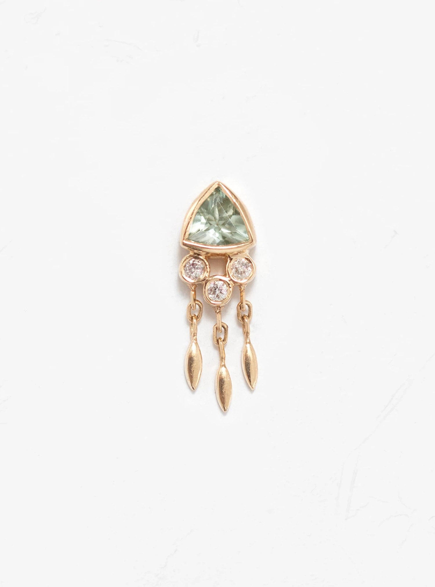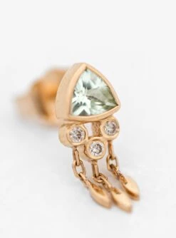 This single earring by Belgian designer Celine Daoust features a central trillian cut light green tourmaline gemstone, complemented with three diamonds and articulated pendants in 14k solid gold. Each gemstone has been individually selected for its unique characteristics that are incorporated by skilled Indian craftsmen into the design of the piece.