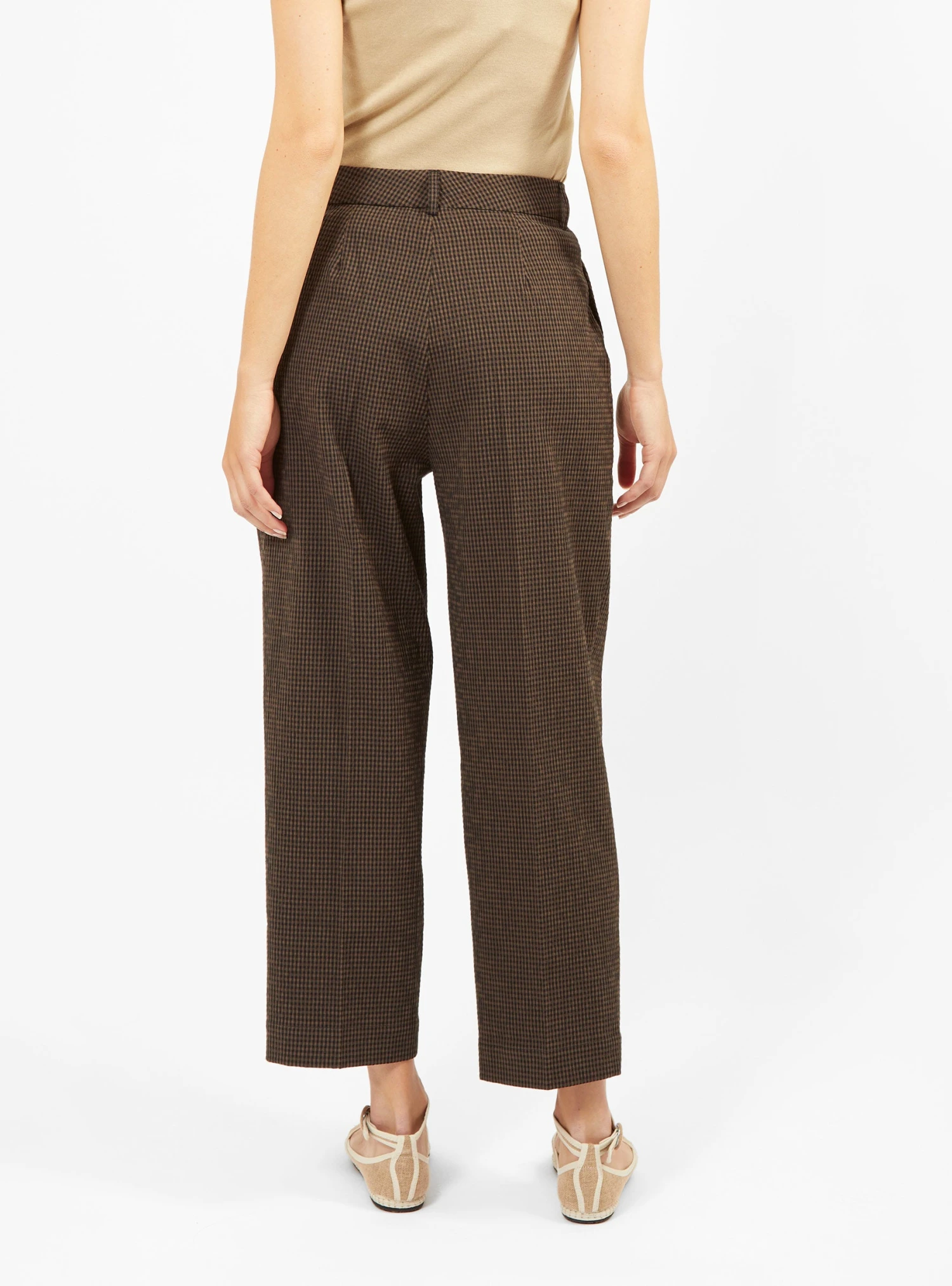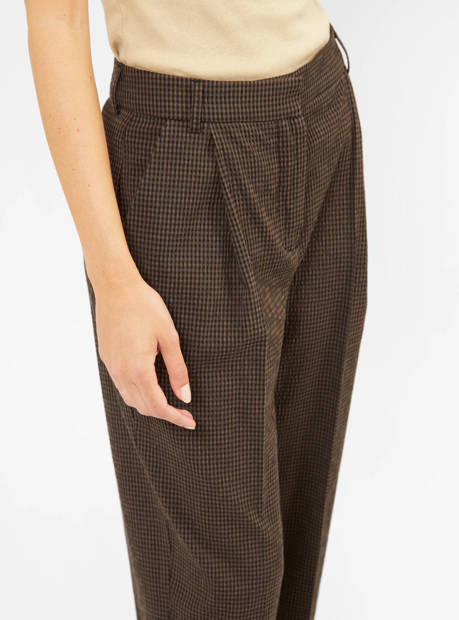 Finished in the season’s miniature gingham check, these brown and black Market trousers from YMC feature pleats at the hips to create added volume. Made from stretch cotton-blend seersucker, they’re cut to a high-rise silhouette with straight legs and cropped hems.