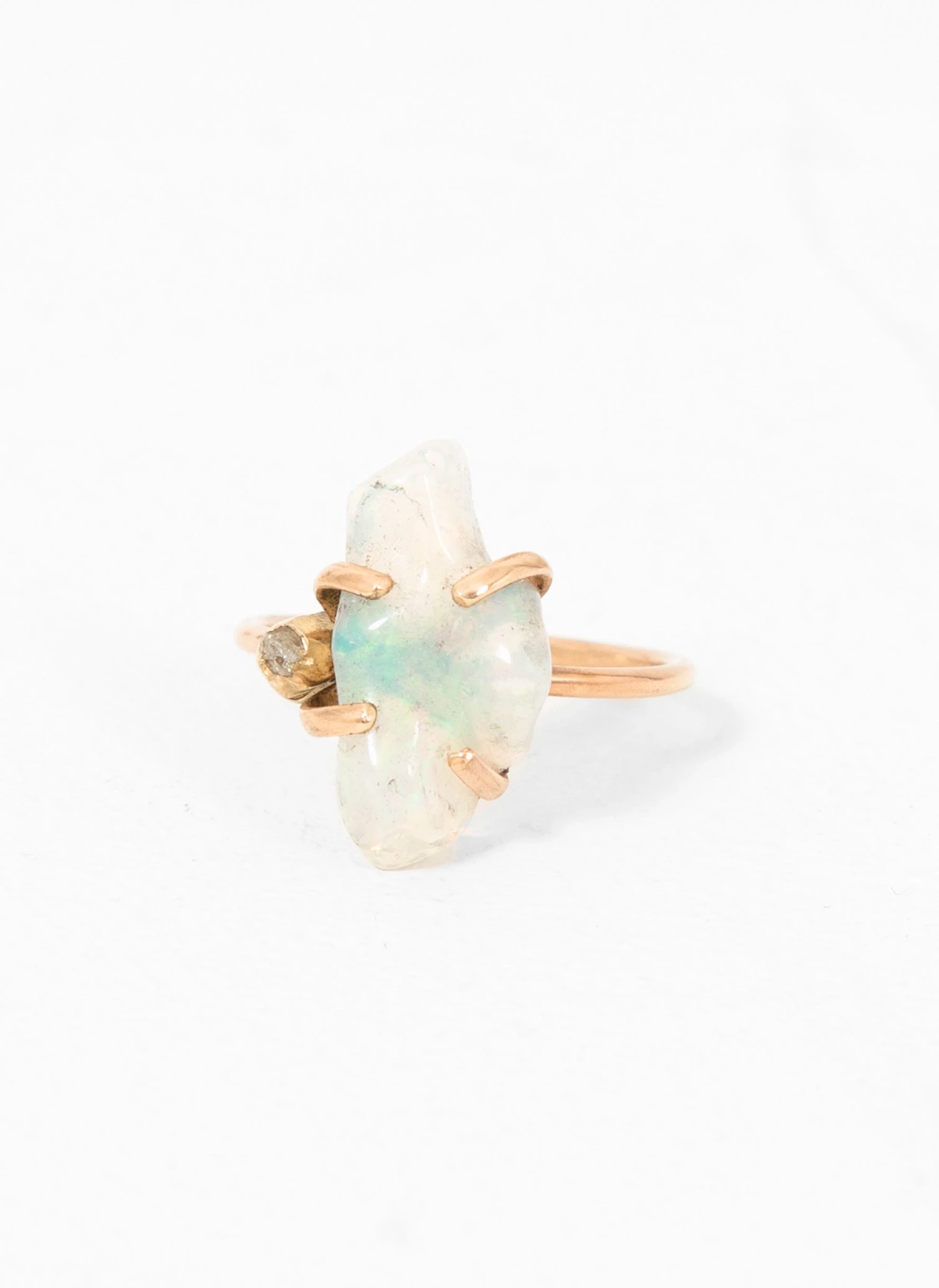 Emilie Shapiro captures the beauty of the night sky with the Milky Way Ring. This statement piece features a rough opal and diamond set in 14k yellow gold band.