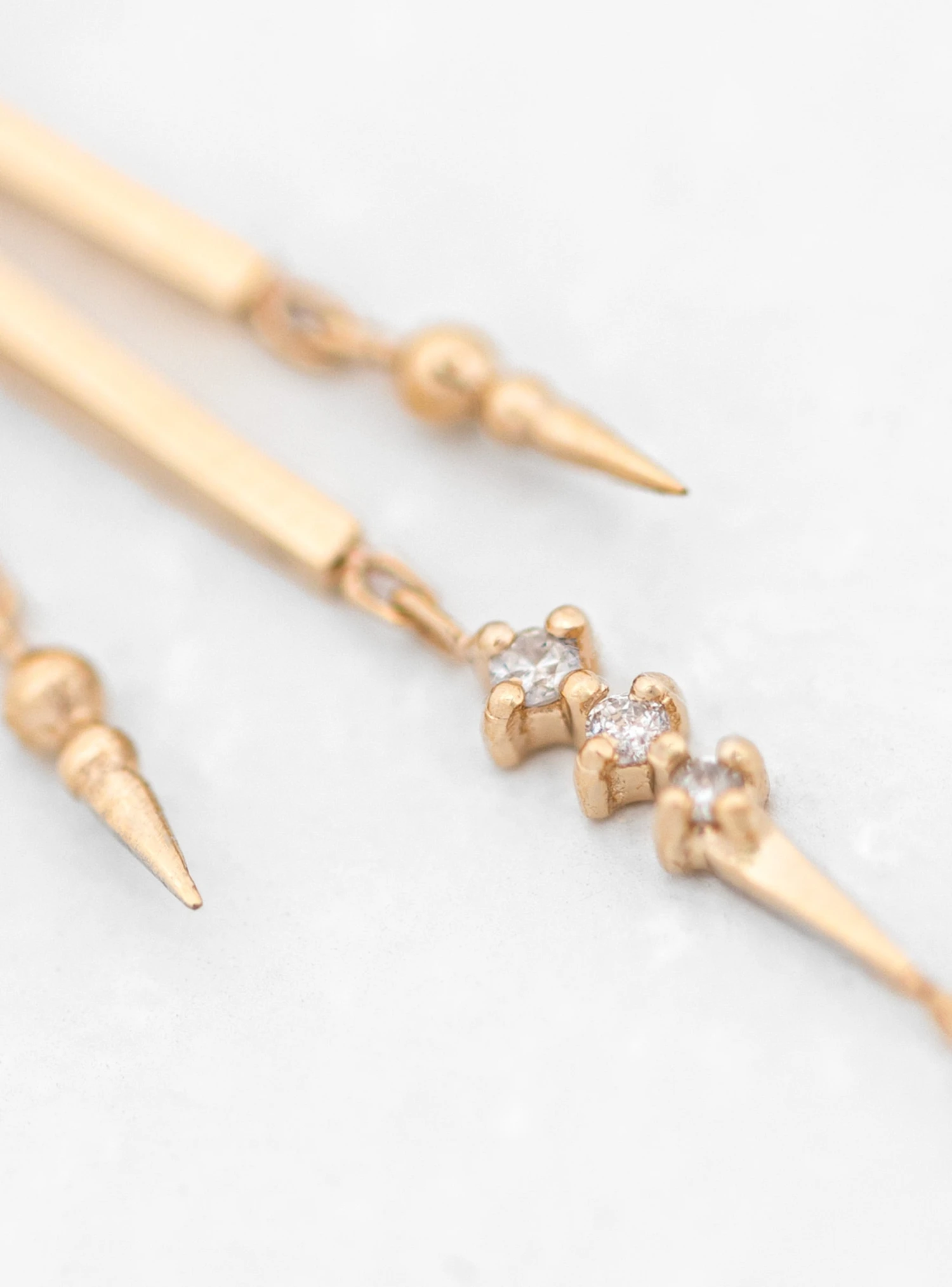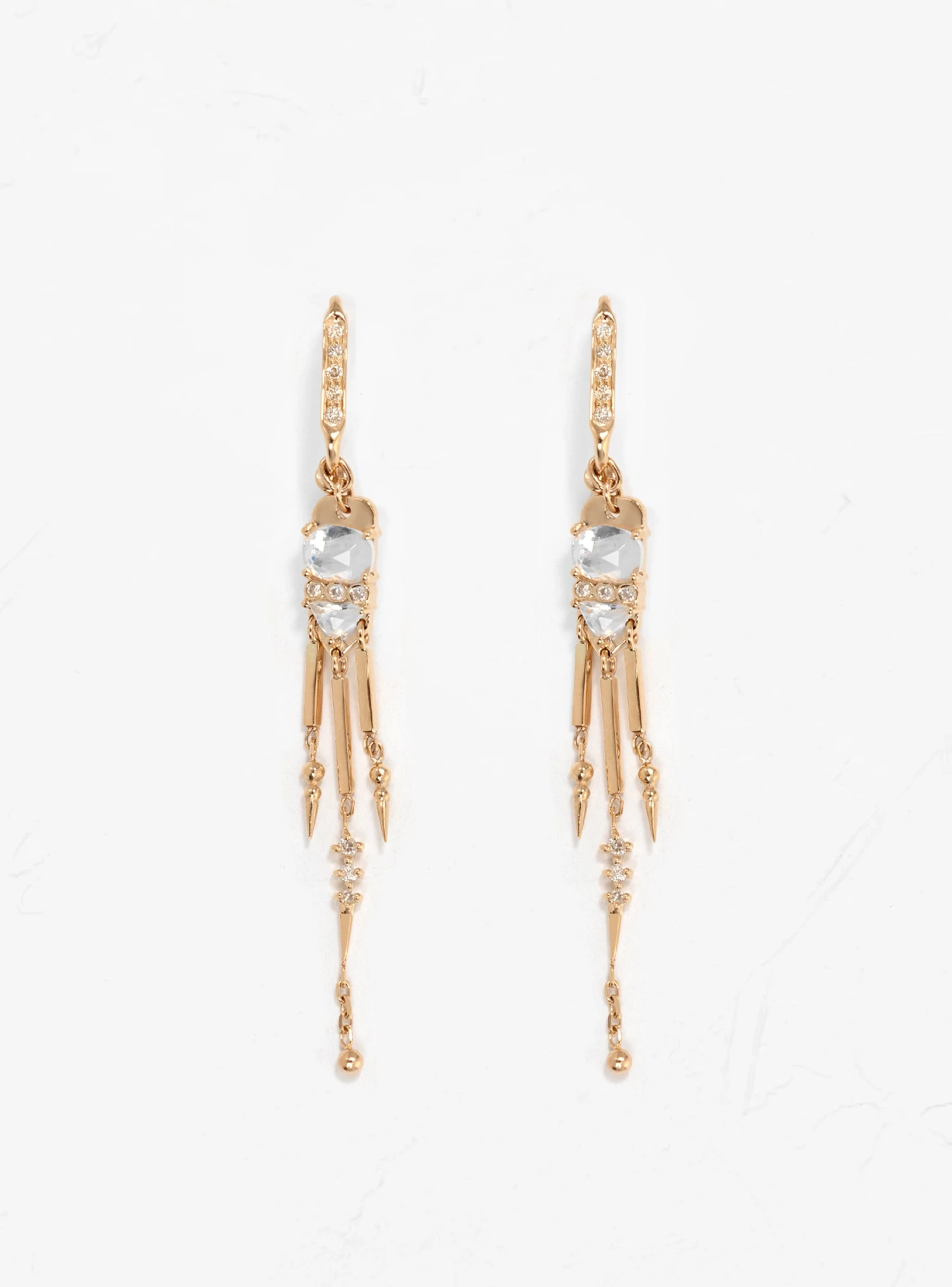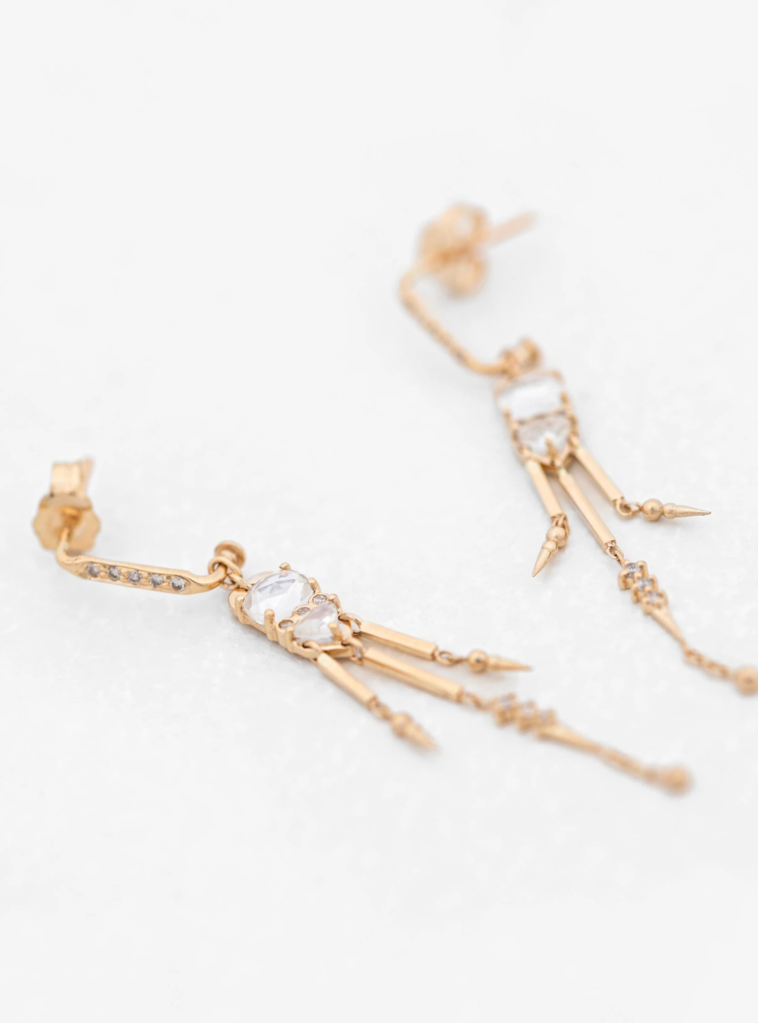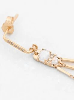 Inspired by her experiences travelling between India, France and Belgium, jewellery designer Celine Daoust’s pieces are a fusion of ancestral craftsmanship and cultural references. These delicately articulated Moonstone & Diamond earrings feature 2 large cut moonstones set in 14k yellow gold with drop pendants underneath reminiscent of protective talismans.