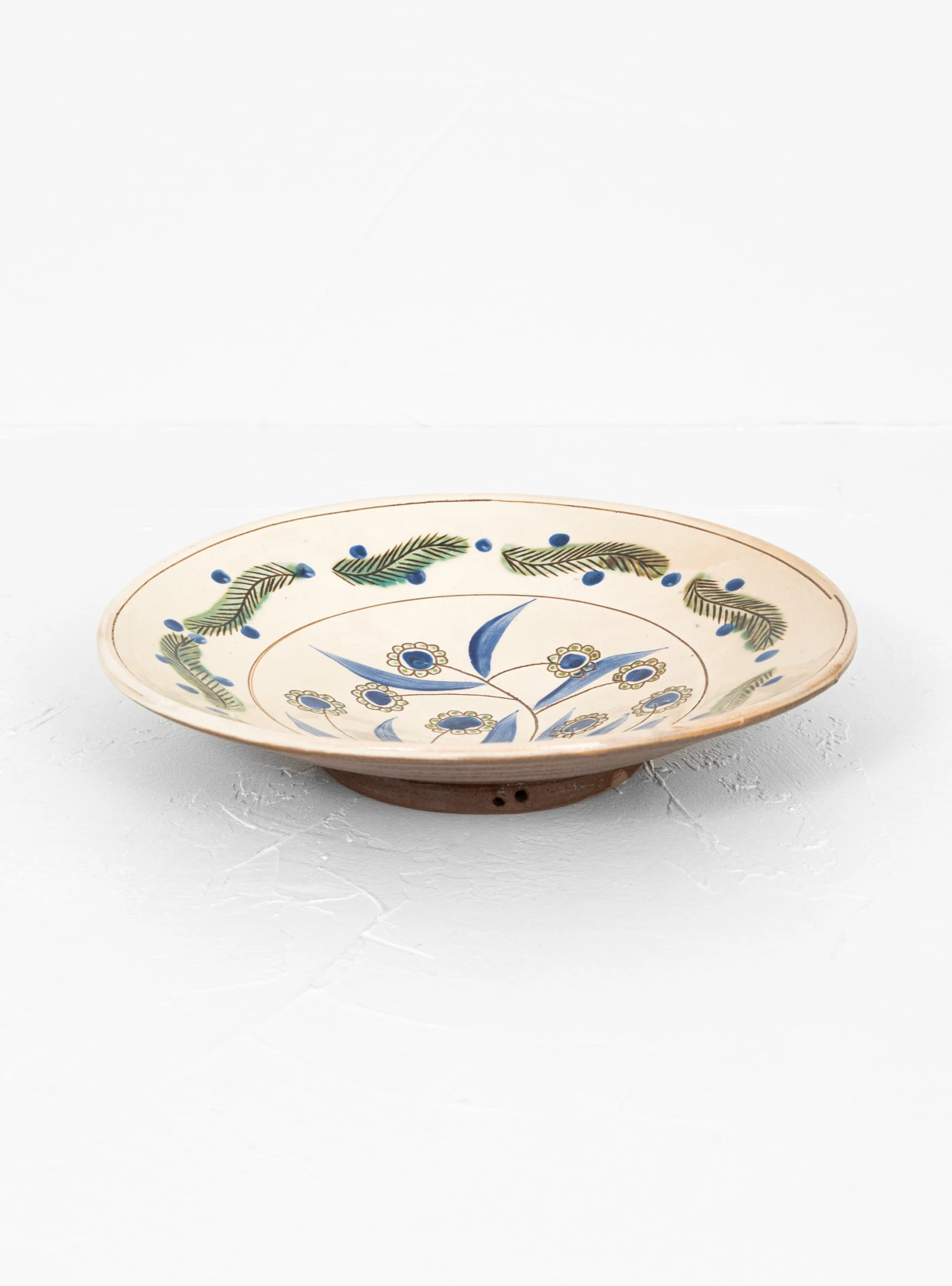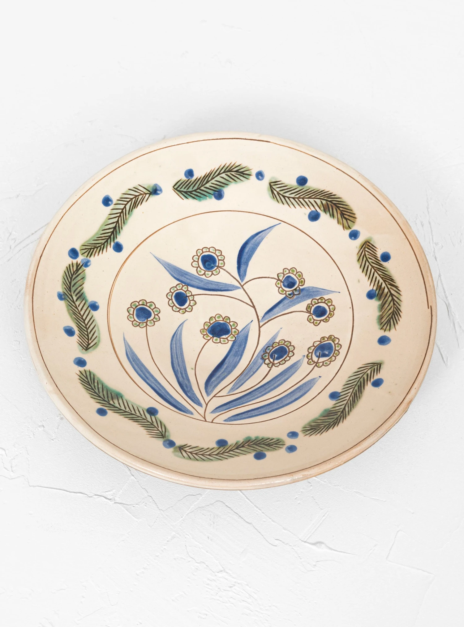 Malaika enlists highly skilled Egyptian artisans to create its range of homeware, including this off-white and blue Mounira platter. Handcrafted from clay by a potter in the oasis village of Tunis, Fayoum, it features a lead-free glaze and two holes at the base that can be used for mounting as a wall decoration.