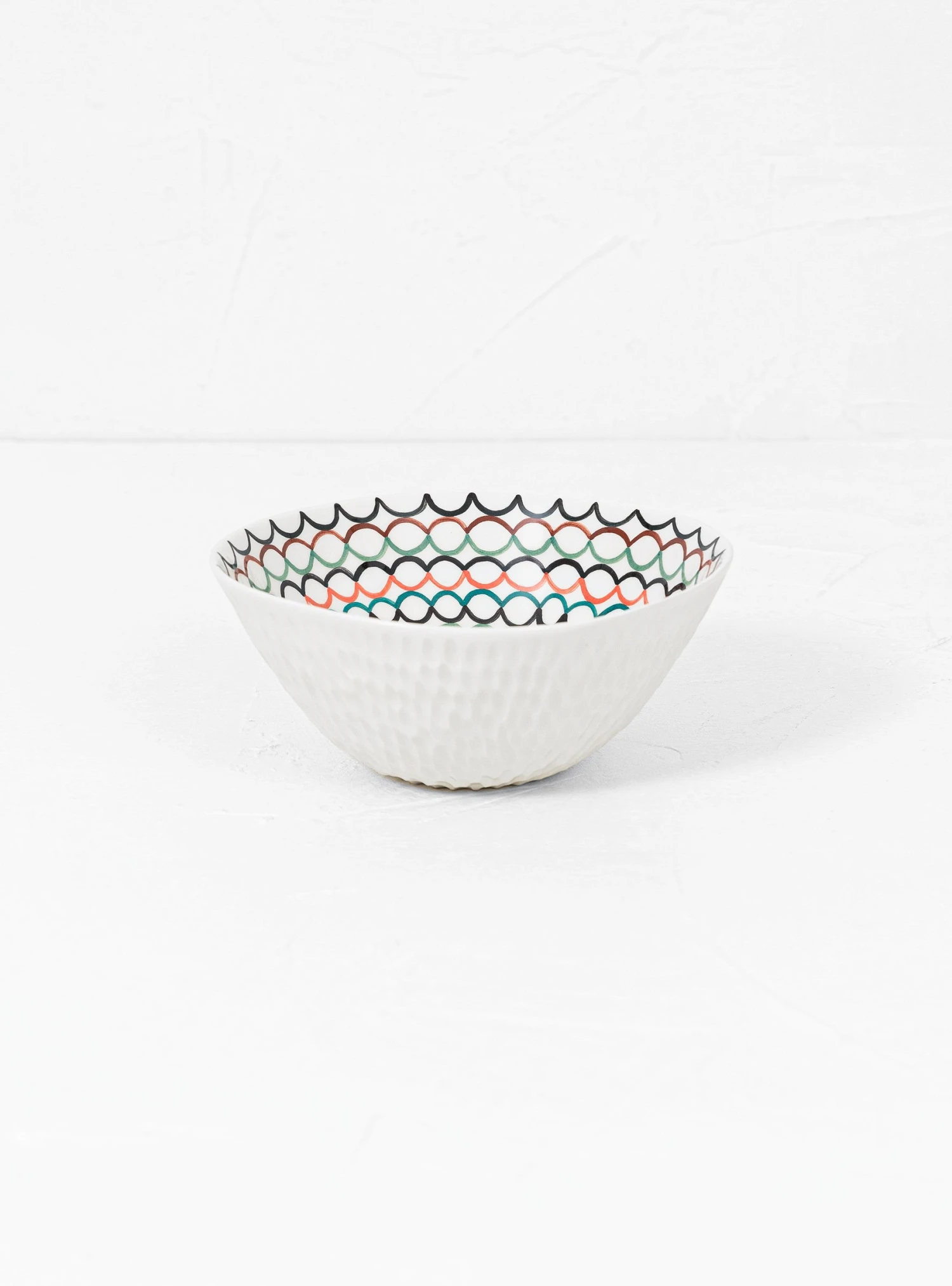 Crafted in the artisan’s rural Lithuanian studio, Aida Dirse’s Multicolour Pattern Bowl n59 is formed from white clay, hand-painted with under-glaze pigments and finished with a softly dimpled outer and a clear glaze. This bowl is painted with a multi-coloured, circular pattern.