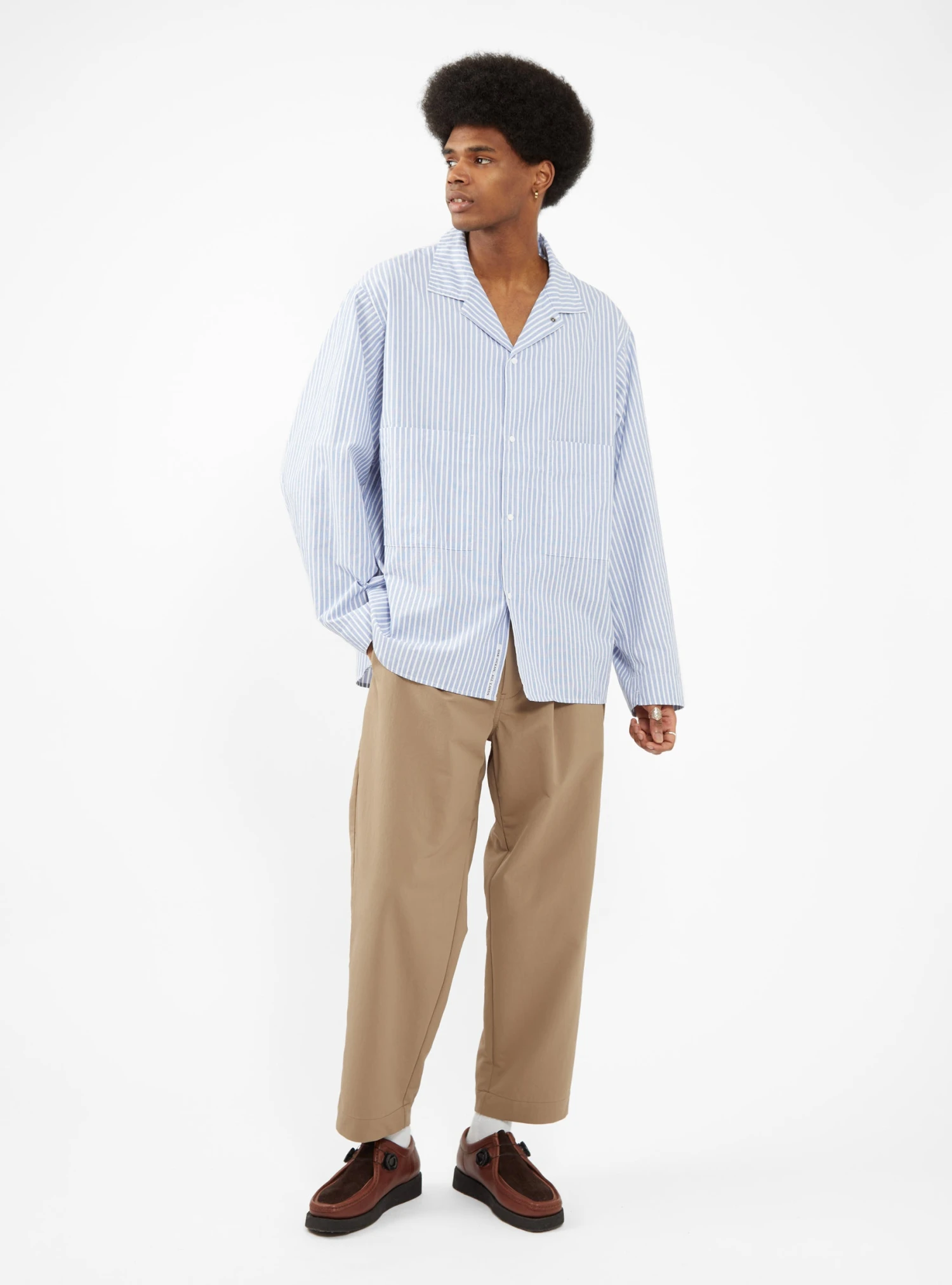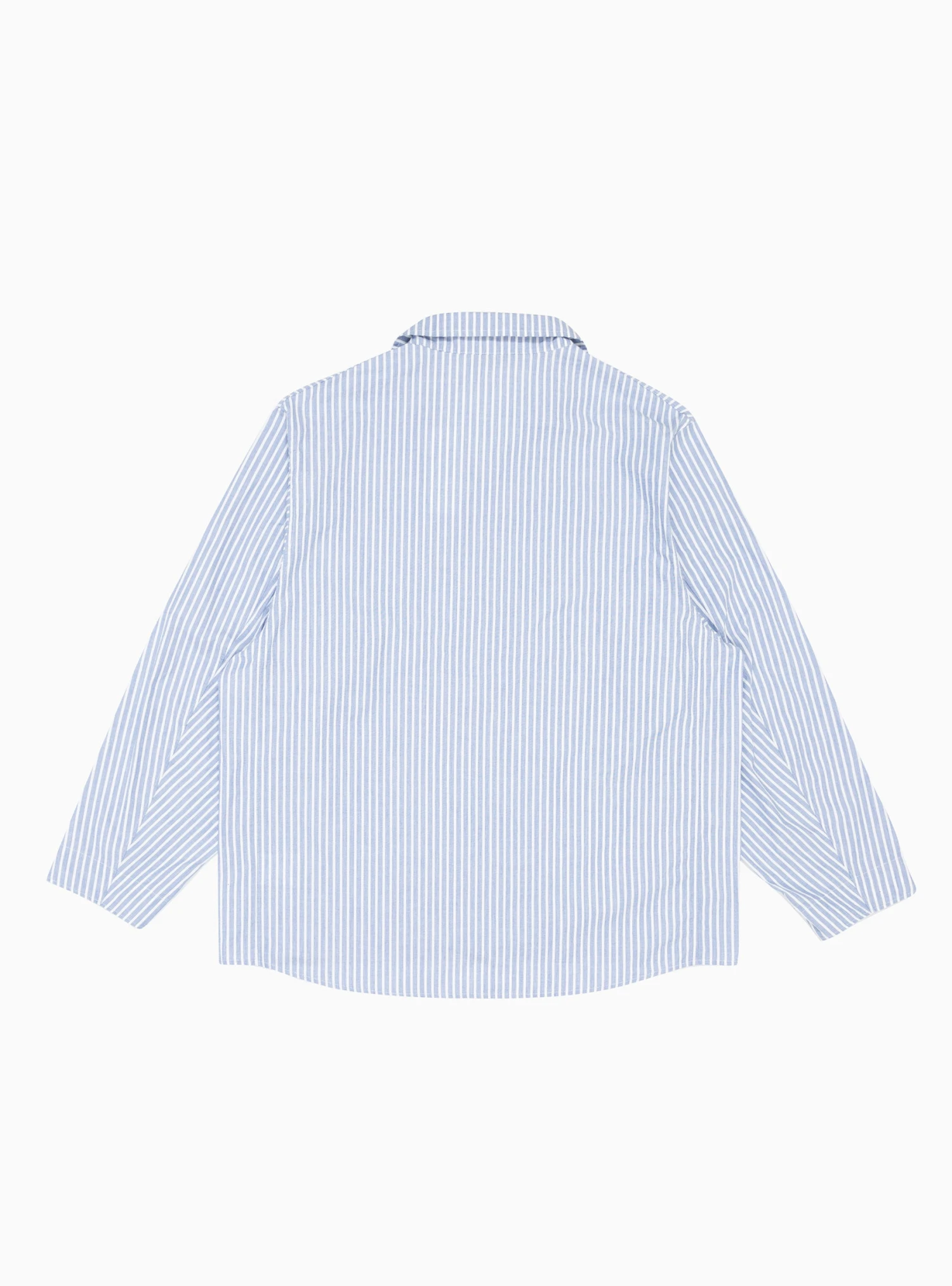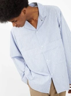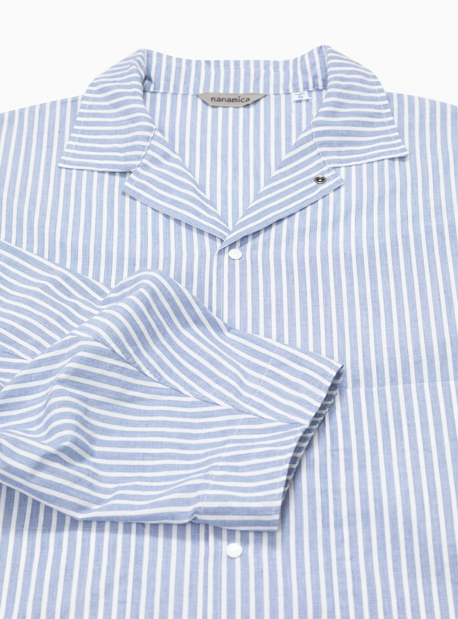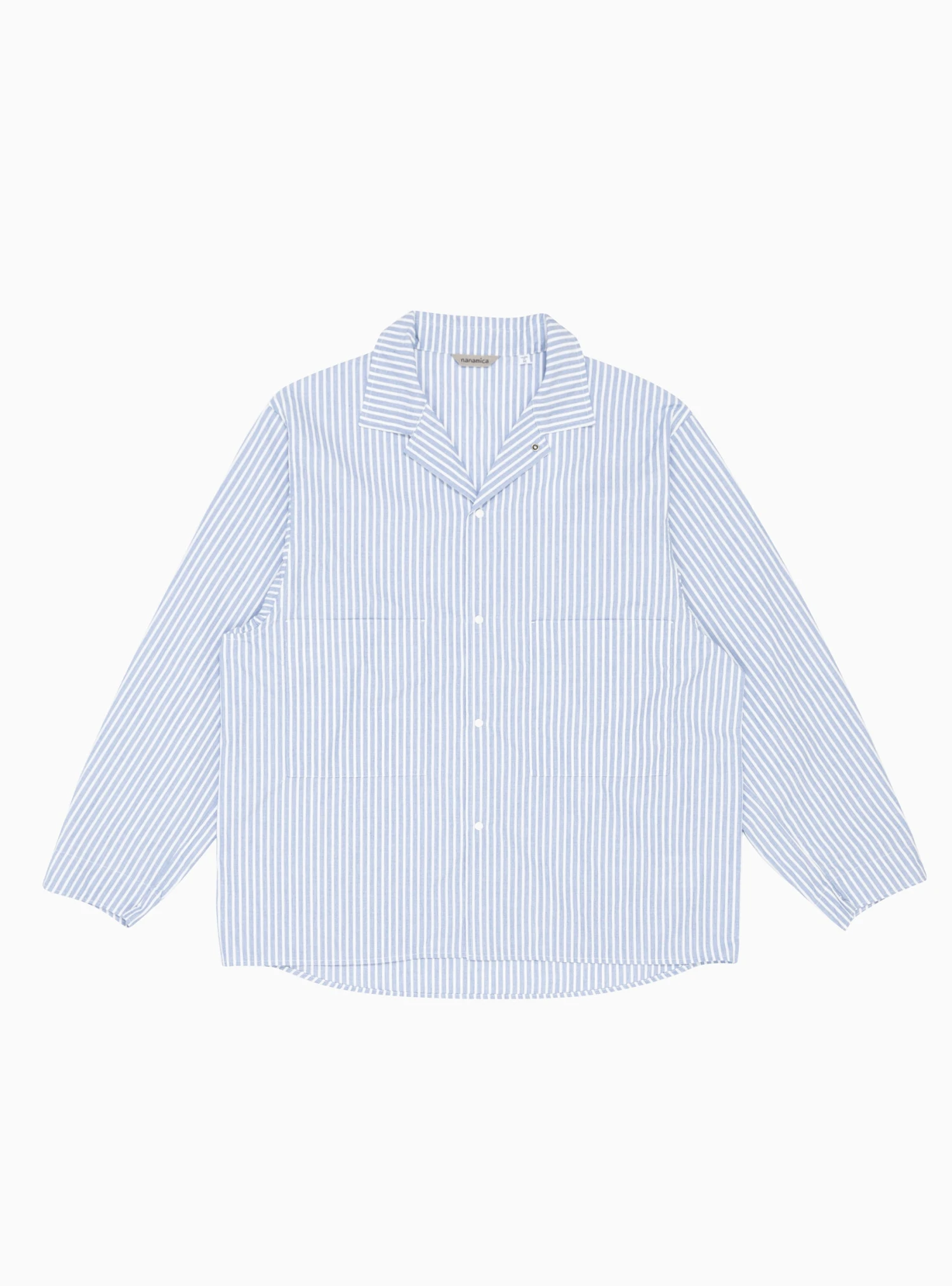 Made from lightweight cotton-blend twill, this blue and white striped shirt jacket from nanamica is cut to a boxy silhouette with a two-way spread collar, patch pockets, and a press-stud fastening.