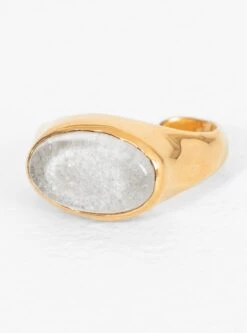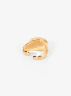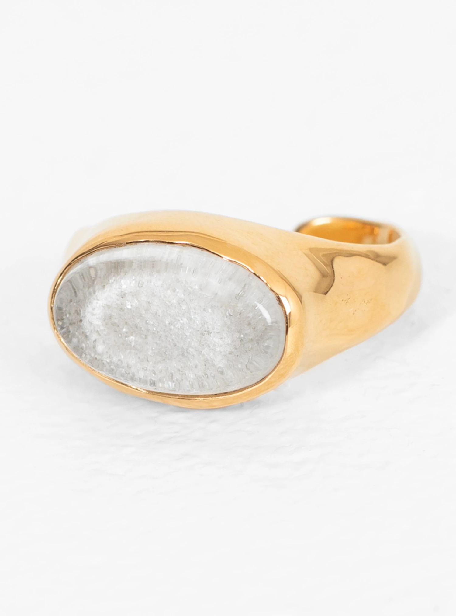 Handmade in LA from 24kt gold-plated brass, the Oval Sculpture ear cuff from CLED is embellished with one of the label’s snow-hued Eco Gems, which are repurposed from discarded glass bottles.