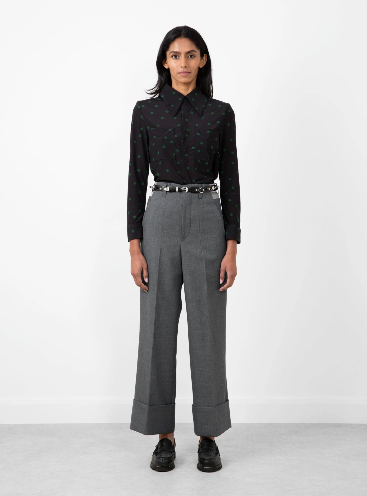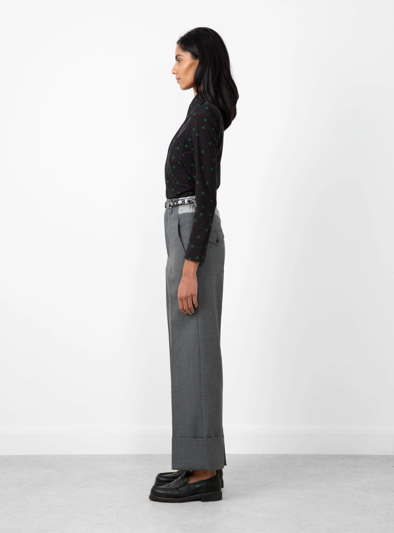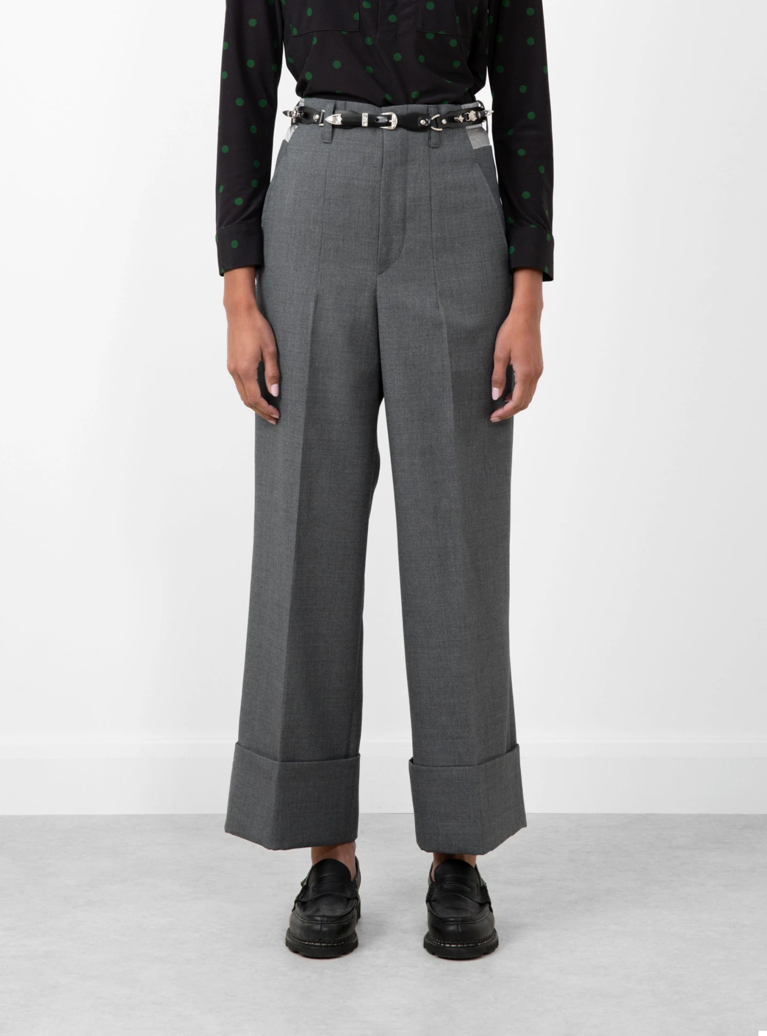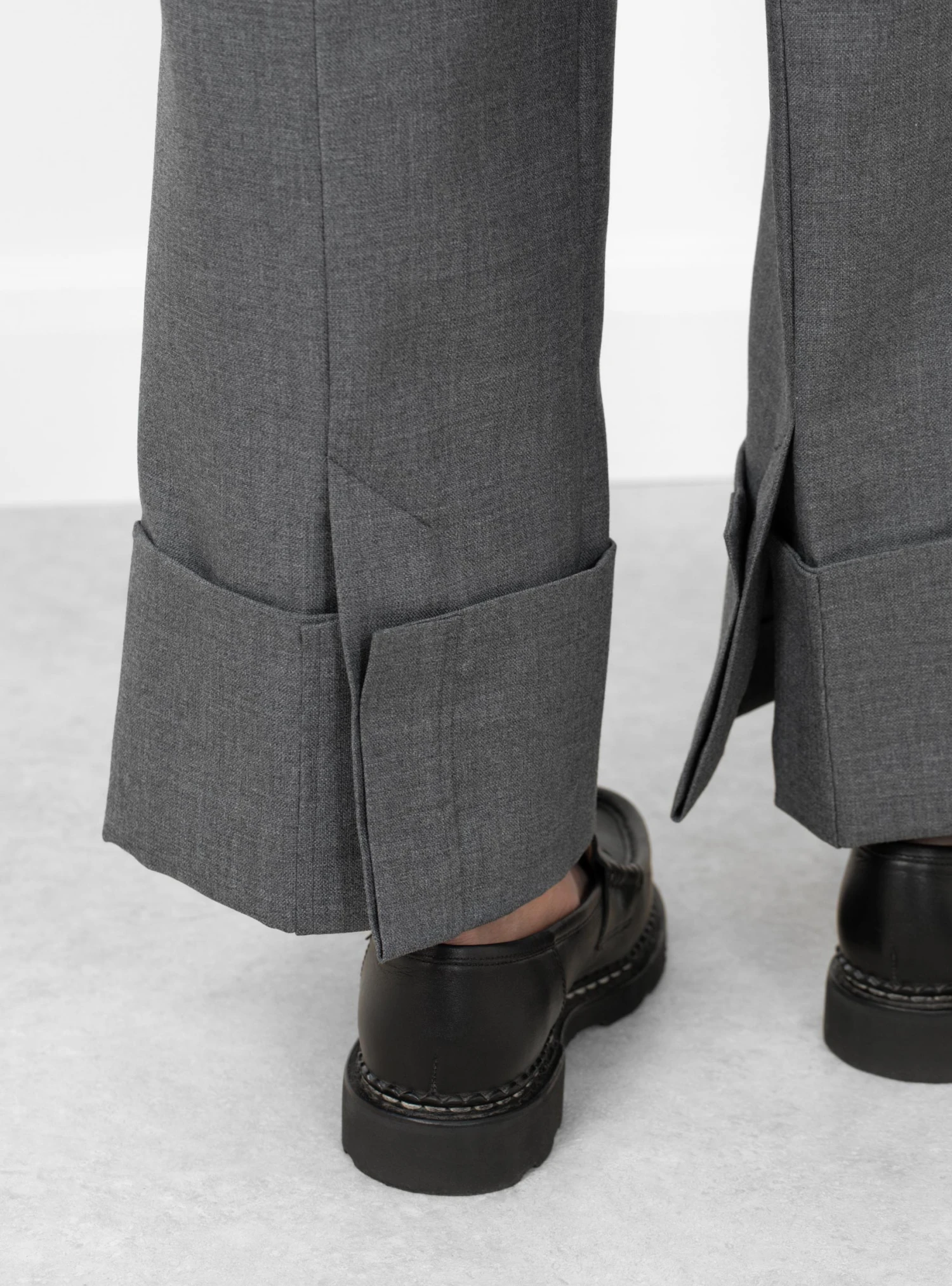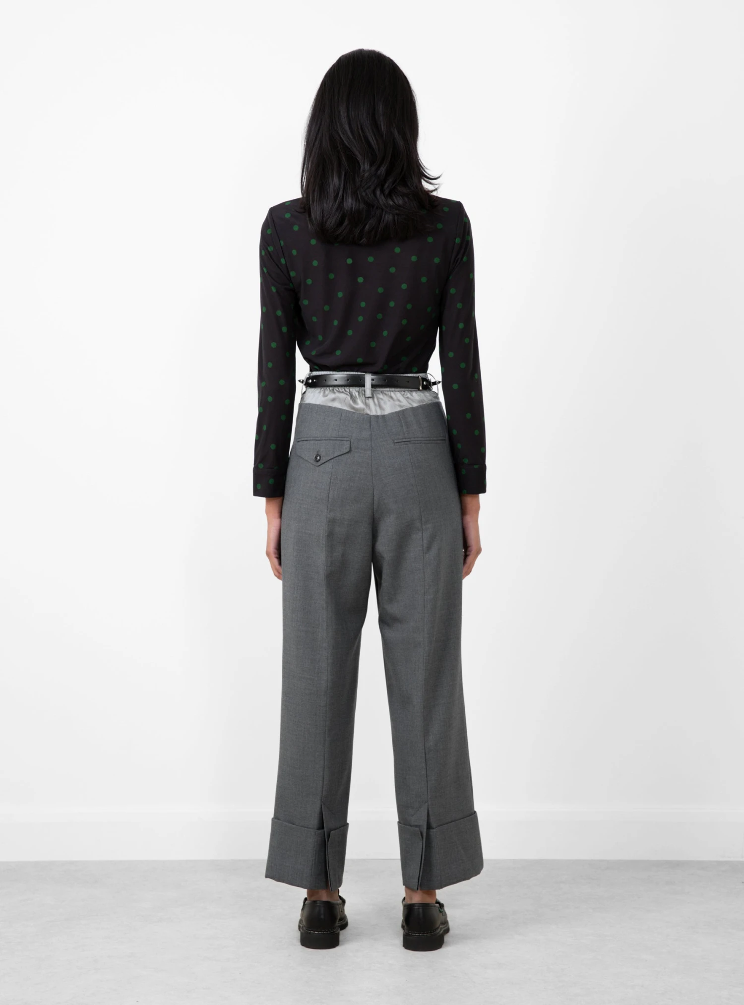 The Ox Pants from TOGA PULLA arrive in a grey. Made in Japan from a woollen blend, the mid-rise trousers fall to a relaxed fit with a voluminous taper. Front pleats and turn-ups at the cuff give the trousers their shape. A rear welt pocket and patch pocket sit below a shiny fabric detailing at the back of the trousers.Â