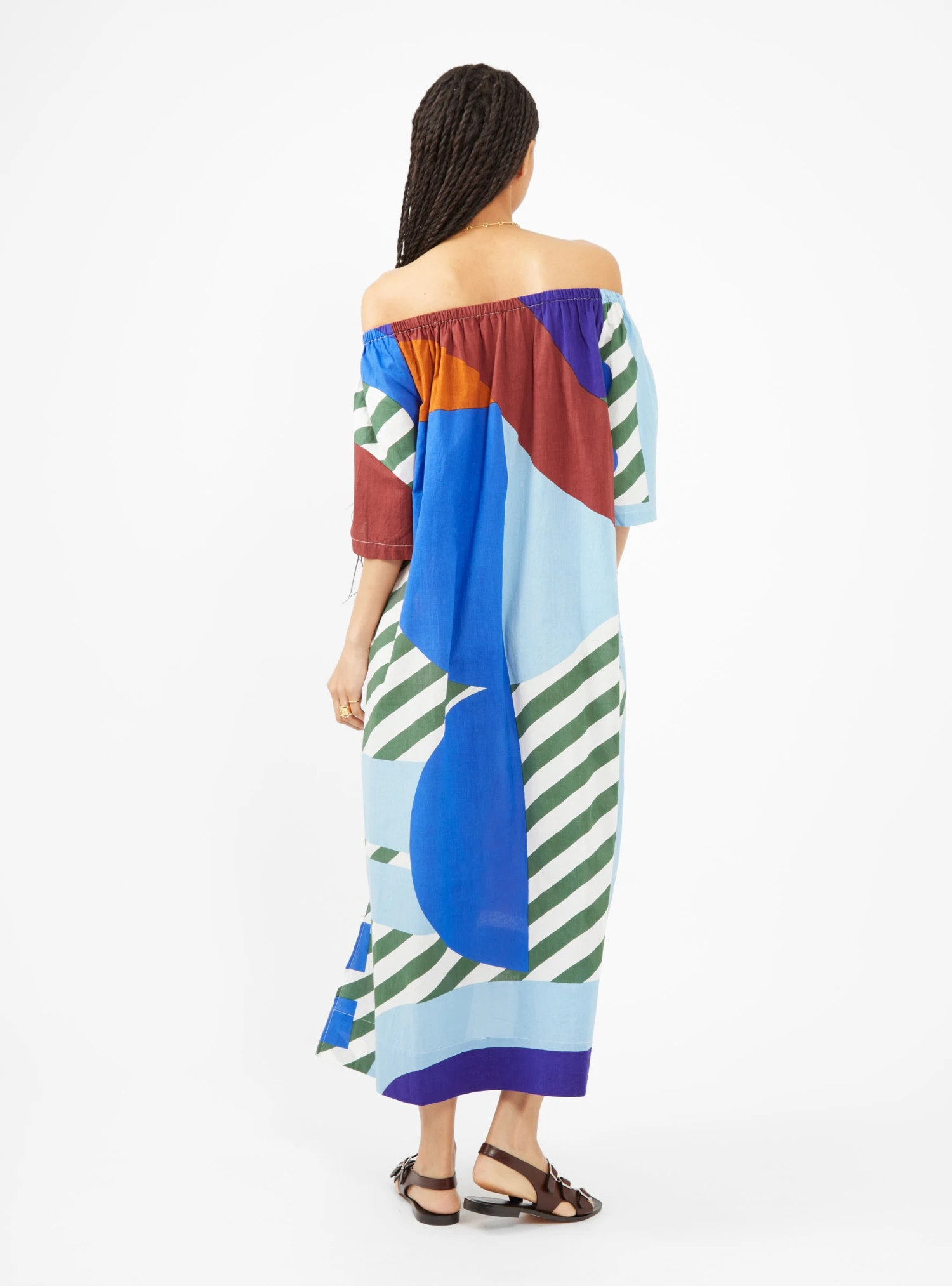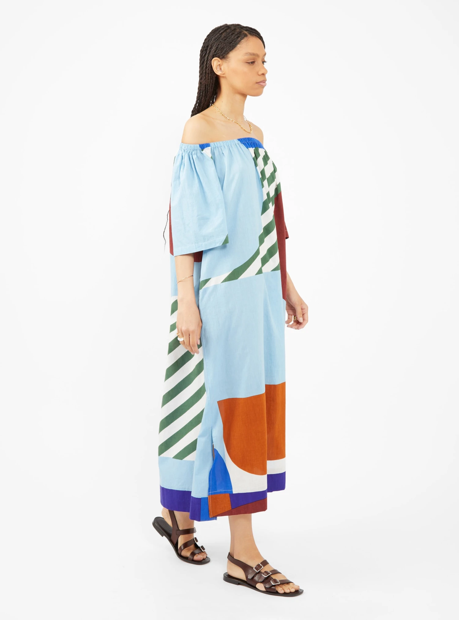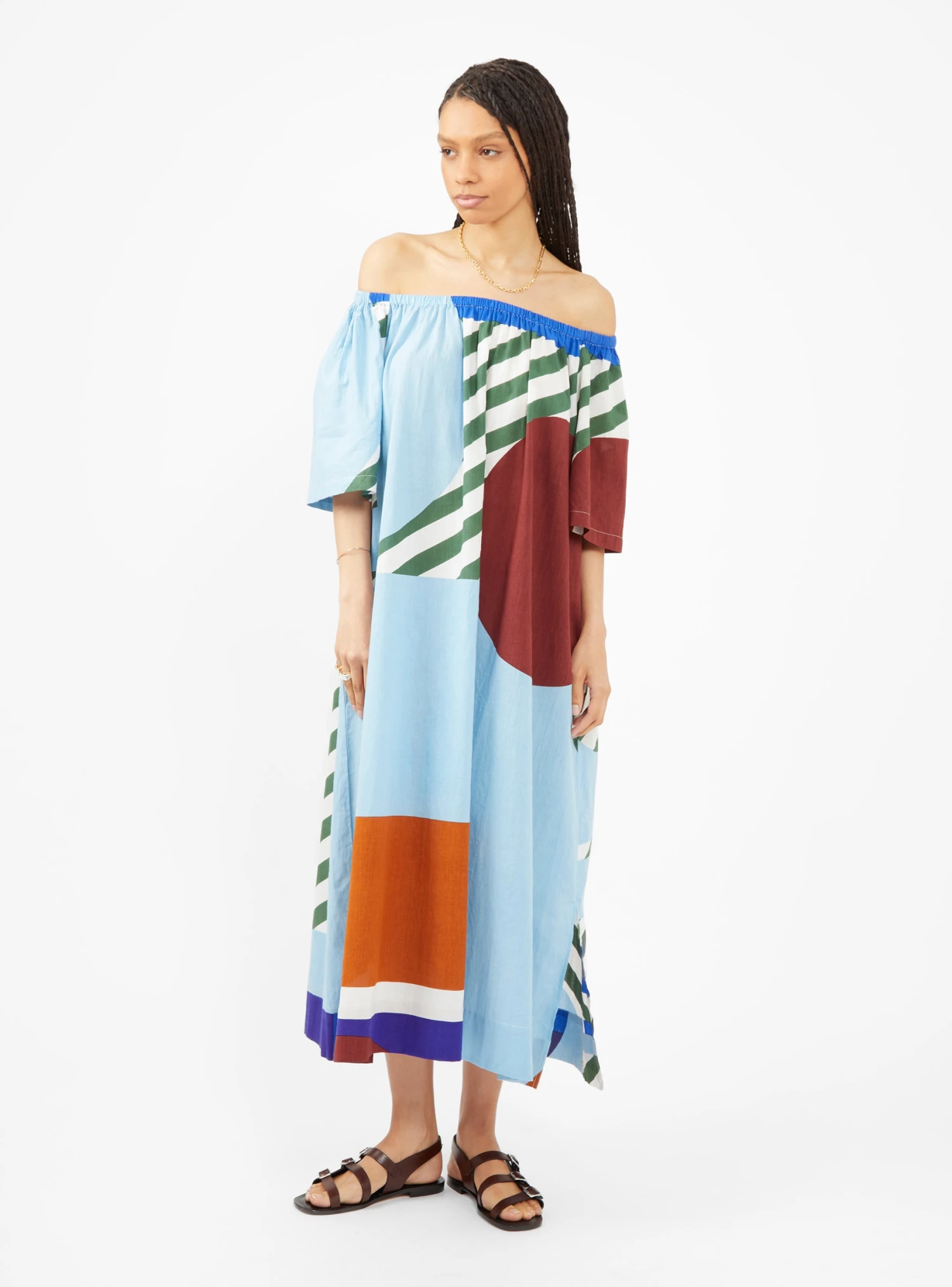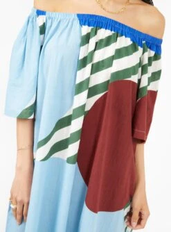 Printed in the Carte Postale pattern in blue, brown and green, this Mapoésie dress features handy side pockets and slits down the side for maximum functionality. The elastic collar allows the dress to alternatively be worn as a bustier.