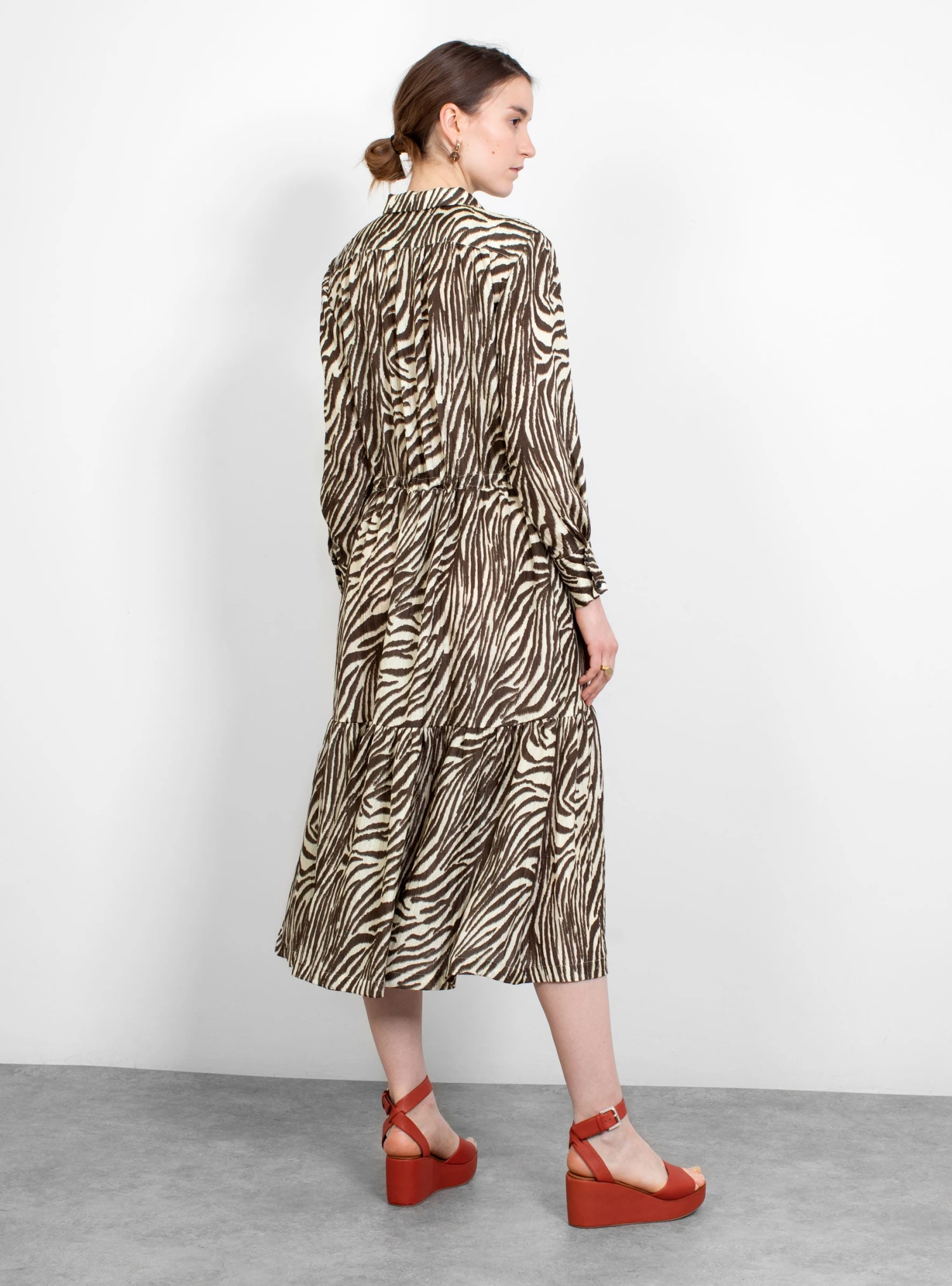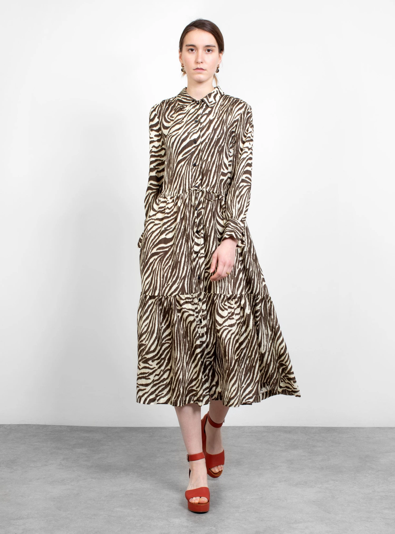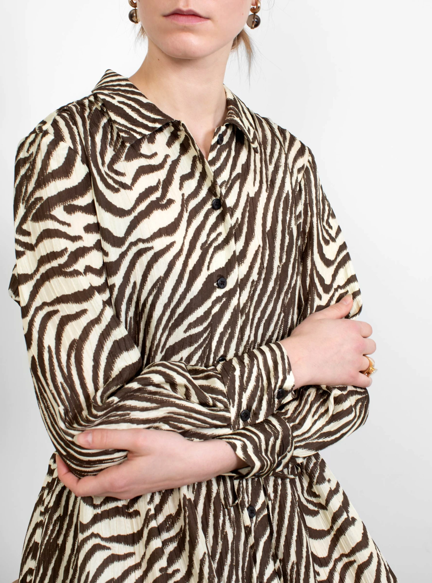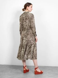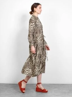 The Roman Dress from No. 6 Store arrives in a zebra print. The mid-length dress features a front button placket and is rounded off by a collar.