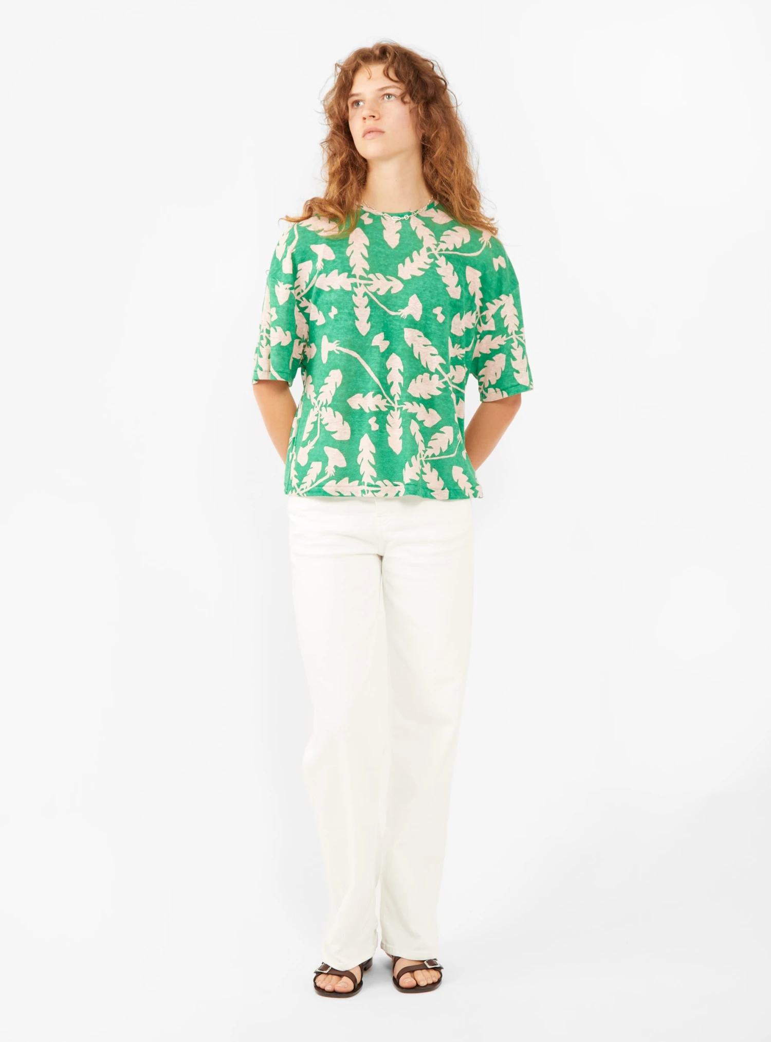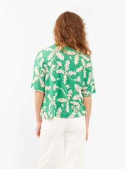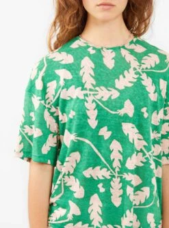 Drawing inspiration from Scandinavia, Japanese brand Mina Perhonen’s green Soffione top is a made from a soft blend of linen and rayon, in the Soffione botanical print, and designed for a relaxed fit.Â