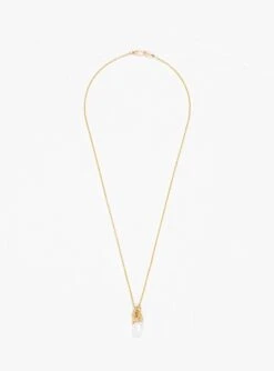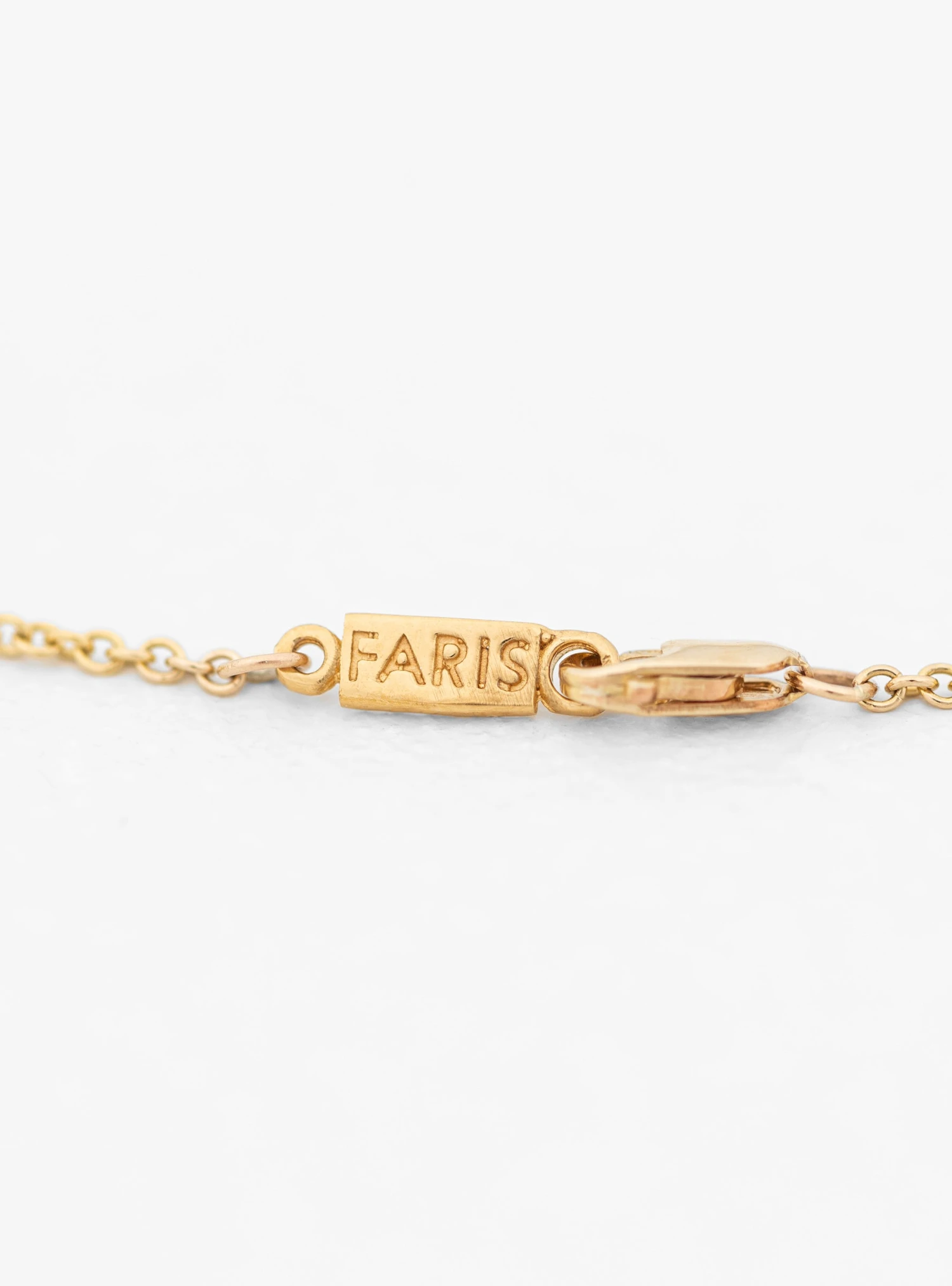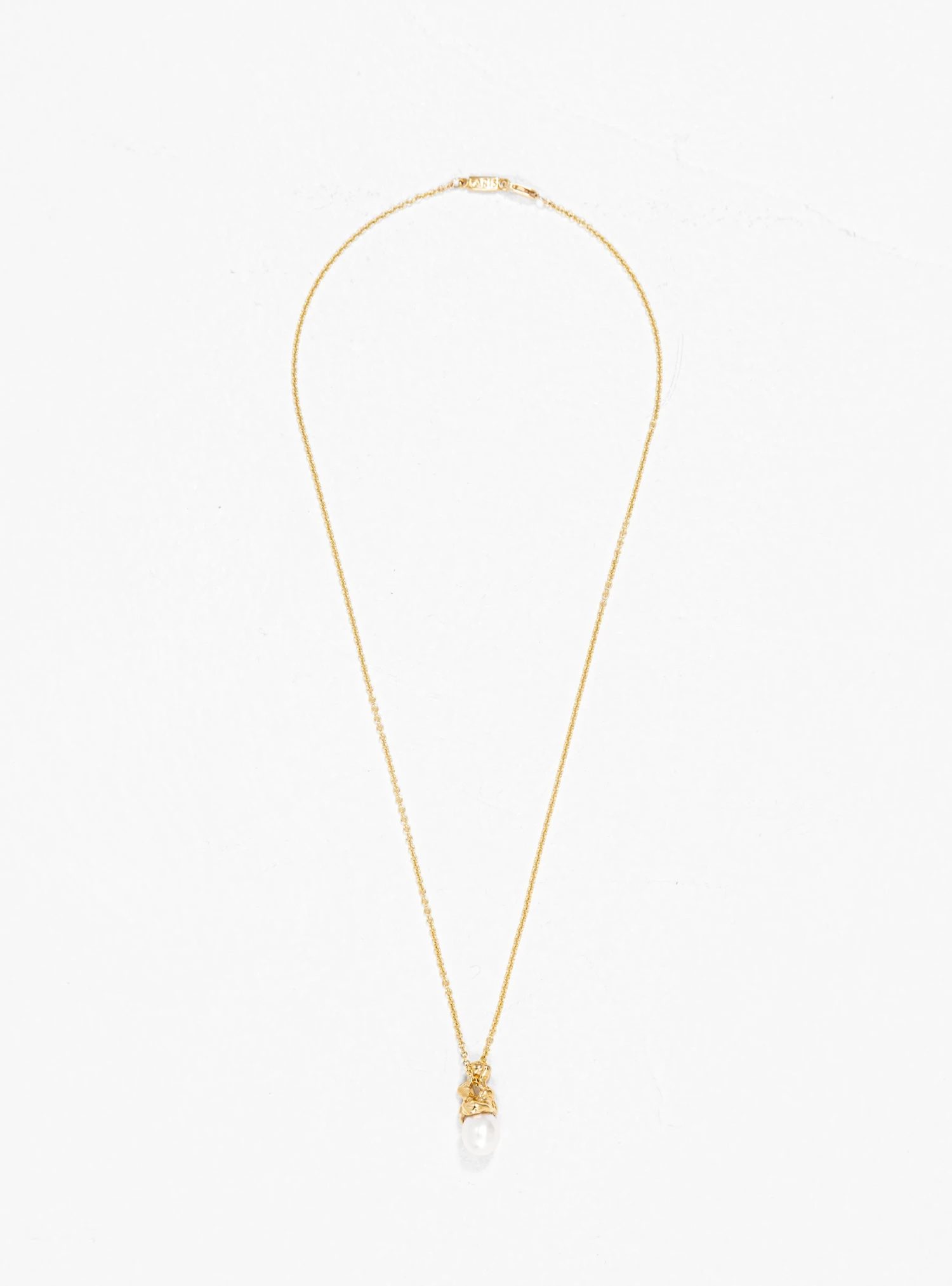 Suspending a shimmering freshwater pearl, this Sophia necklace from Faris is made by hand from 14kt gold-plated bronze at the label’s Seattle studio.