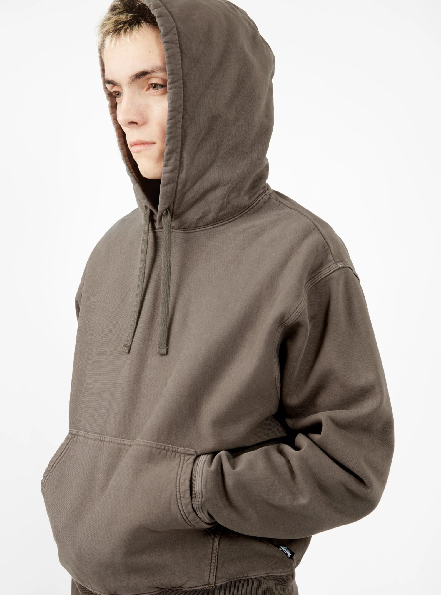 Pigment dyed to create a washed-out finish, this charcoal hoodie from Stüssy is cut from fleece-backed cotton jersey to a relaxed silhouette with a drawstring hood and kangaroo pocket.