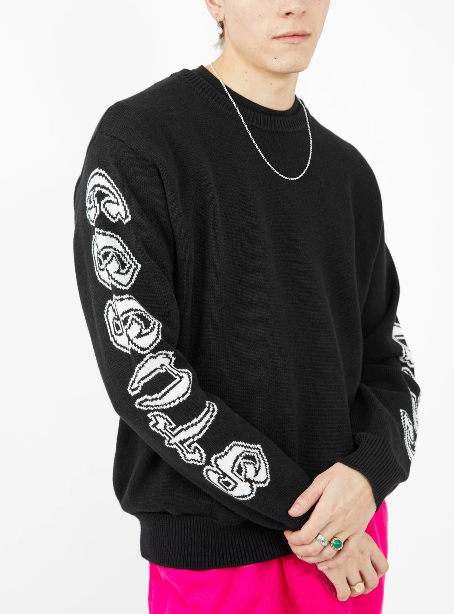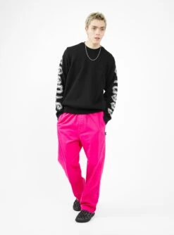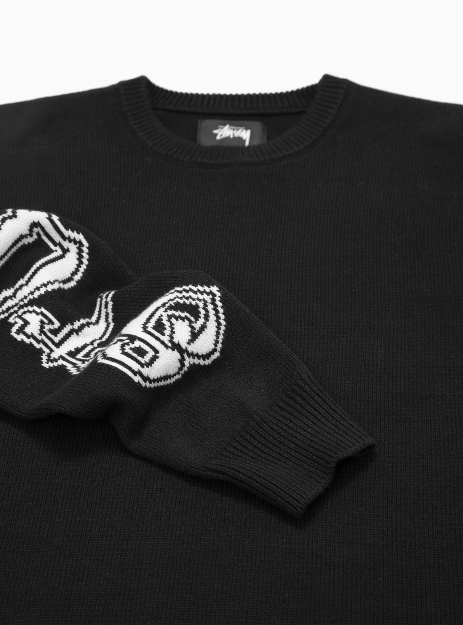 Featuring intarsia sleeve logos, this black sweater from Stüssy is knitted from cotton to a relaxed silhouette with a crewneck and ribbed edges.