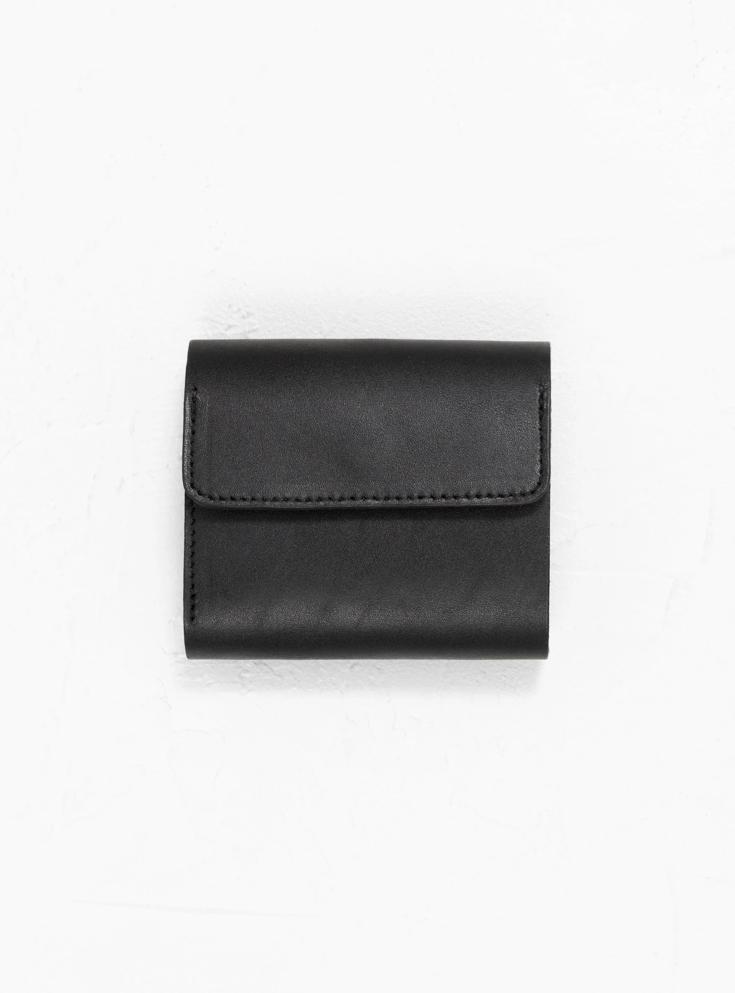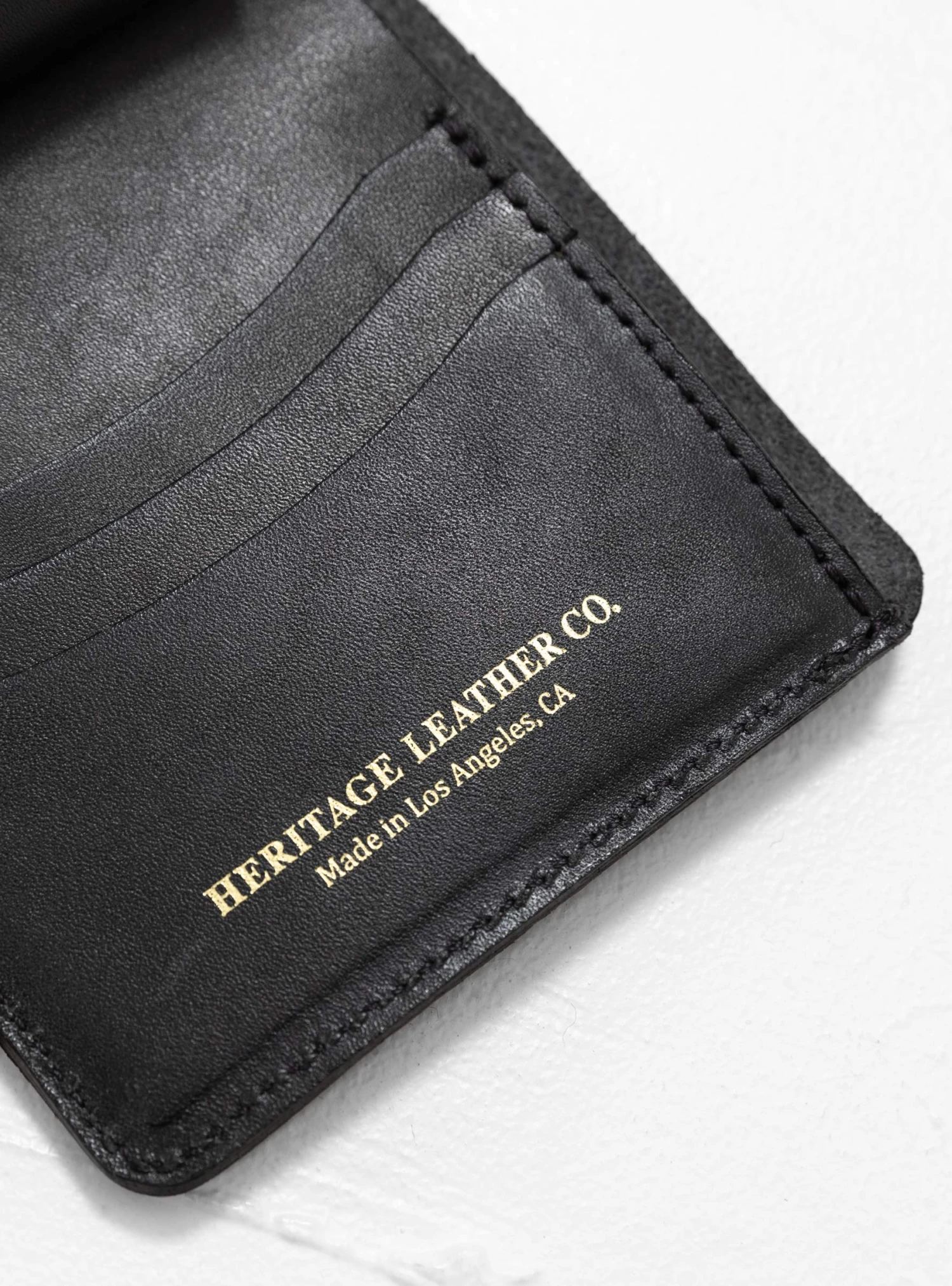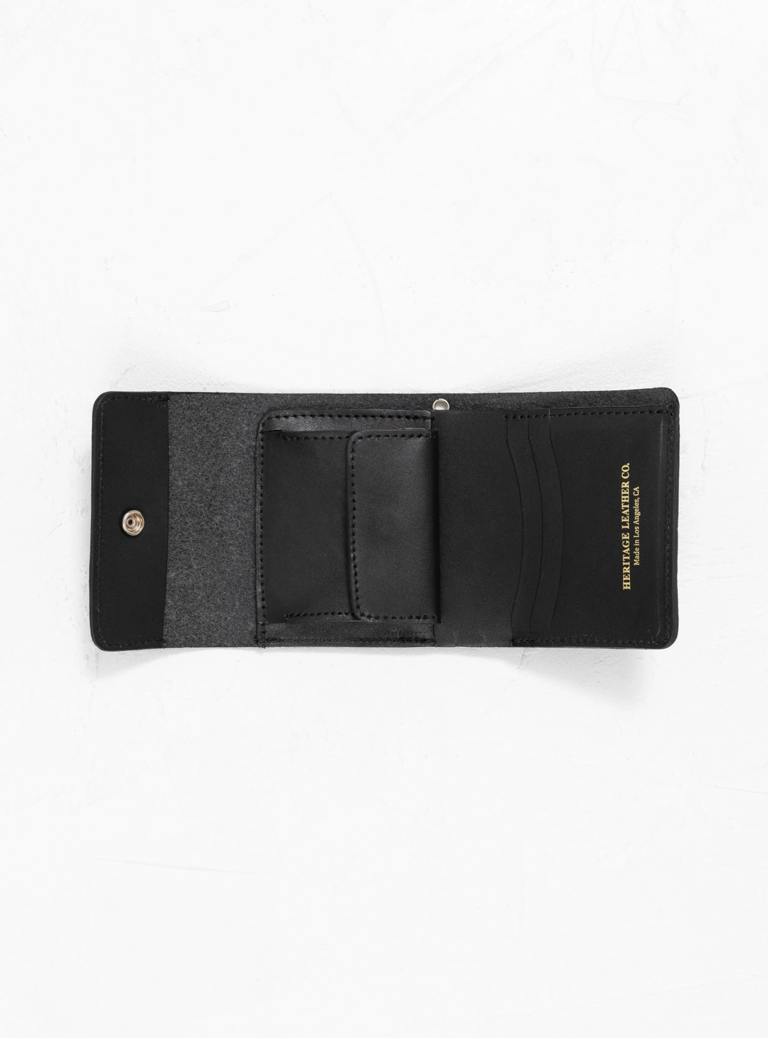 The Leather Black Tri-Fold Wallet from Heritage Leather Company features three card slots, a coin compartment, and a popper clasp. Elegant and practical, it’s the perfect accessory for the modern man.