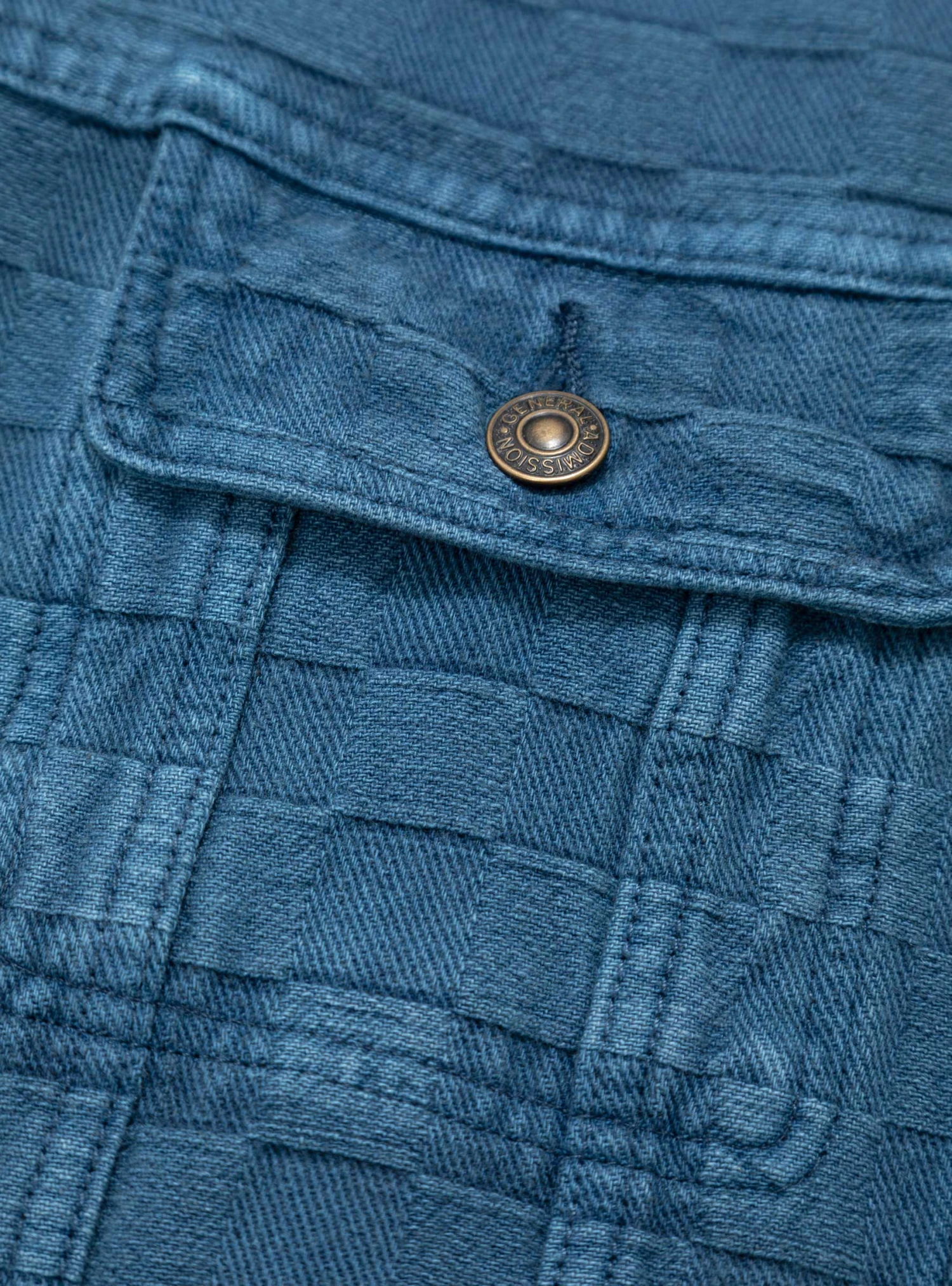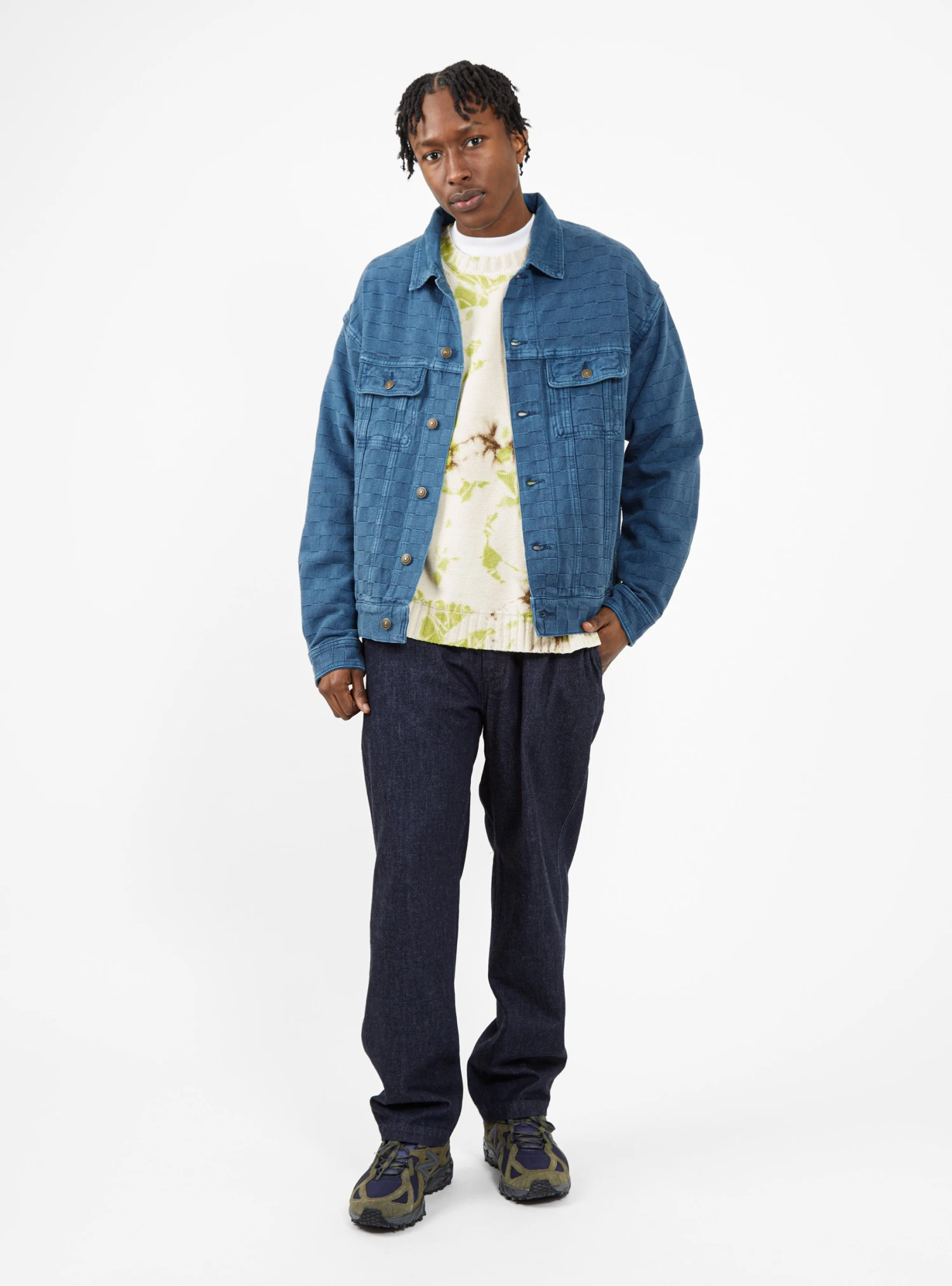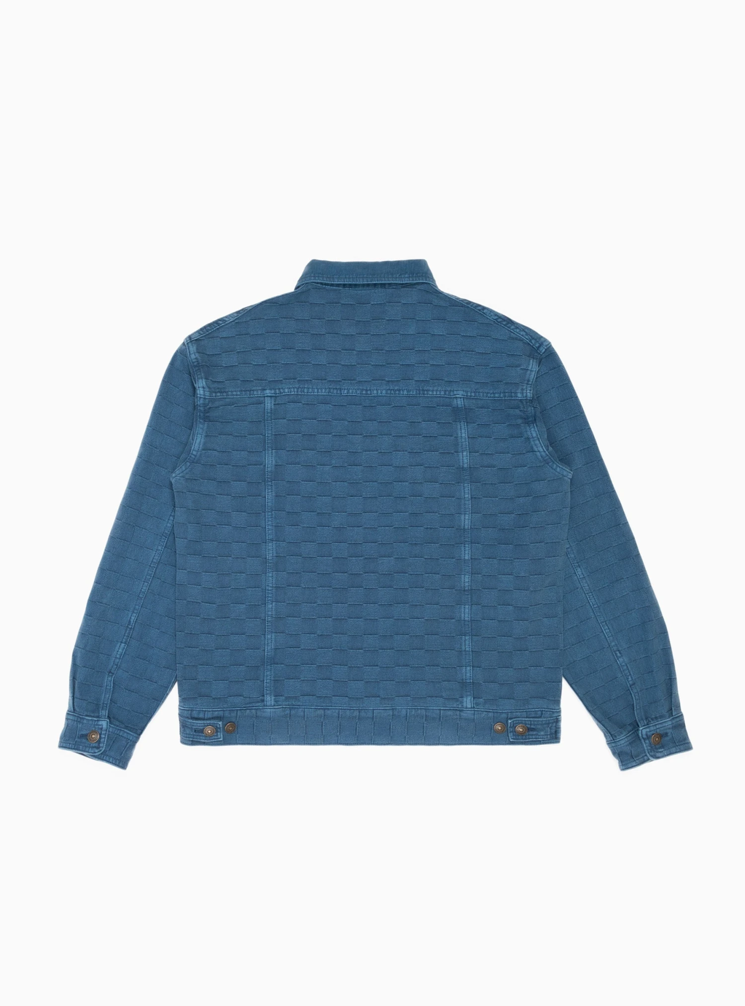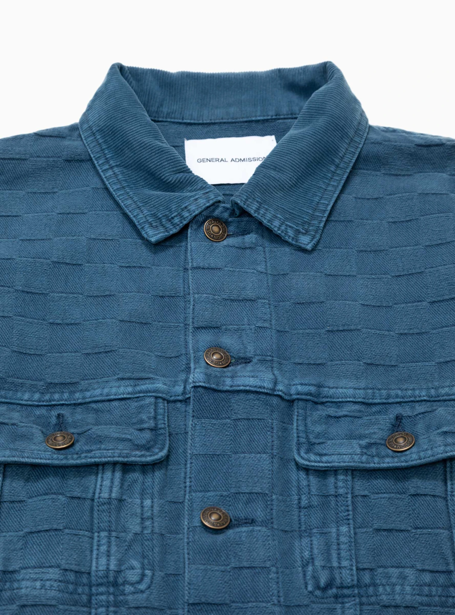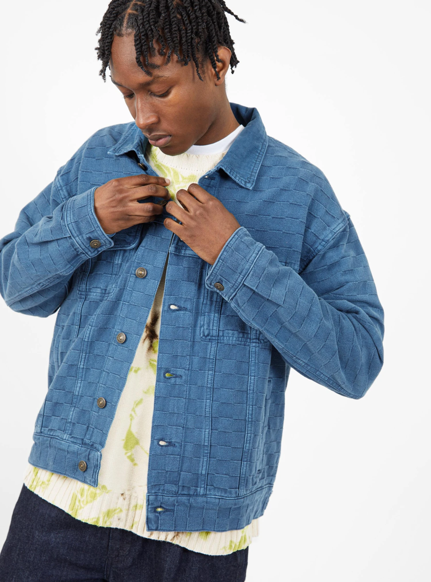 Made from garment-dyed cotton twill with a jacquard-check motif, this blue Trucker jacket from General Admission is cut to a relaxed silhouette with a corduroy collar and brass hardware.