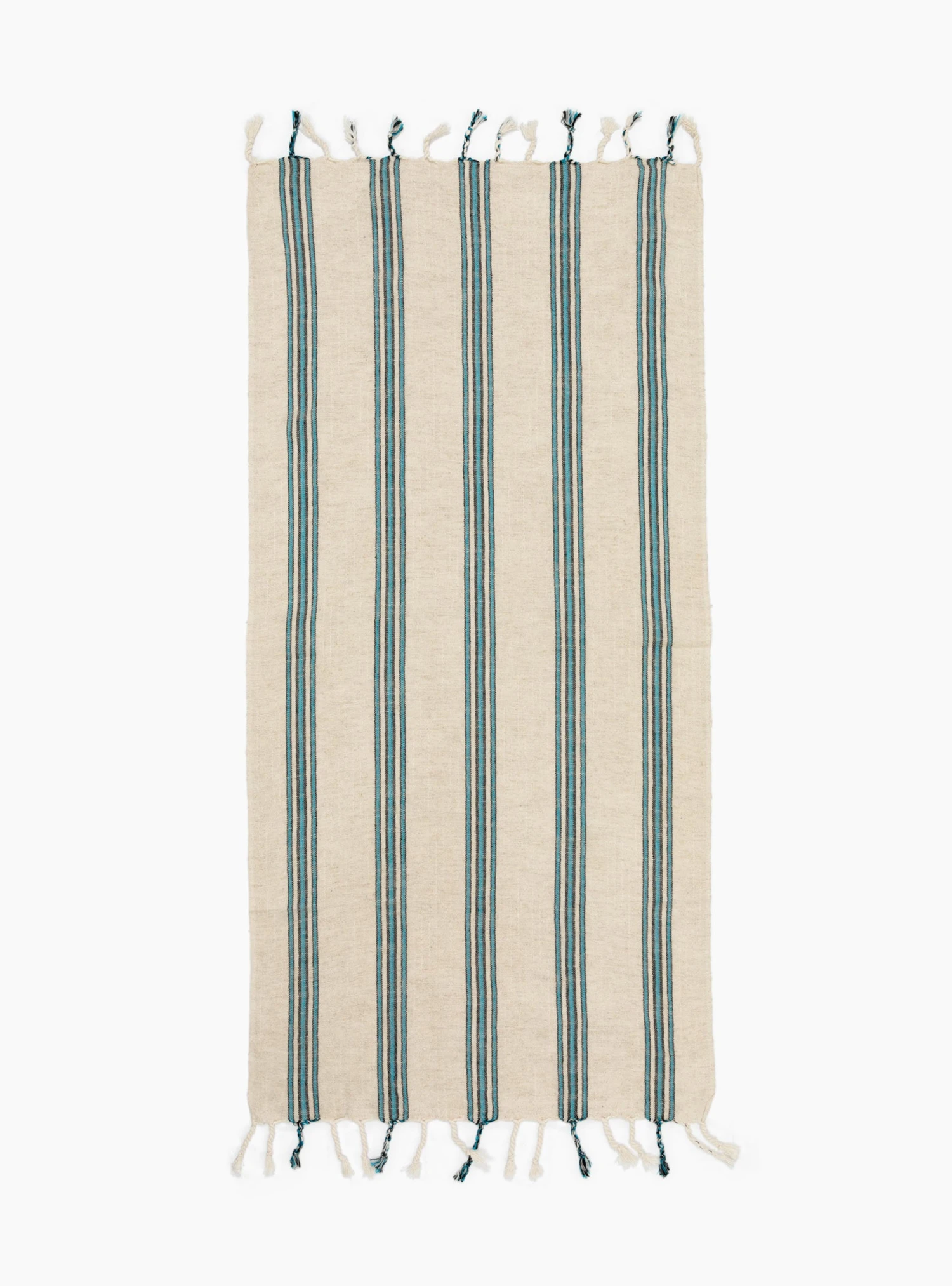 Featuring turquoise stripes, this hand towel from Mizar & Alcor is inspired by the earthy textures found throughout the Mediterranean. It’s handwoven in Turkey on centuries-old looms using a quick-drying blend of linen and cotton and features braided tassel fringing trims the ends.