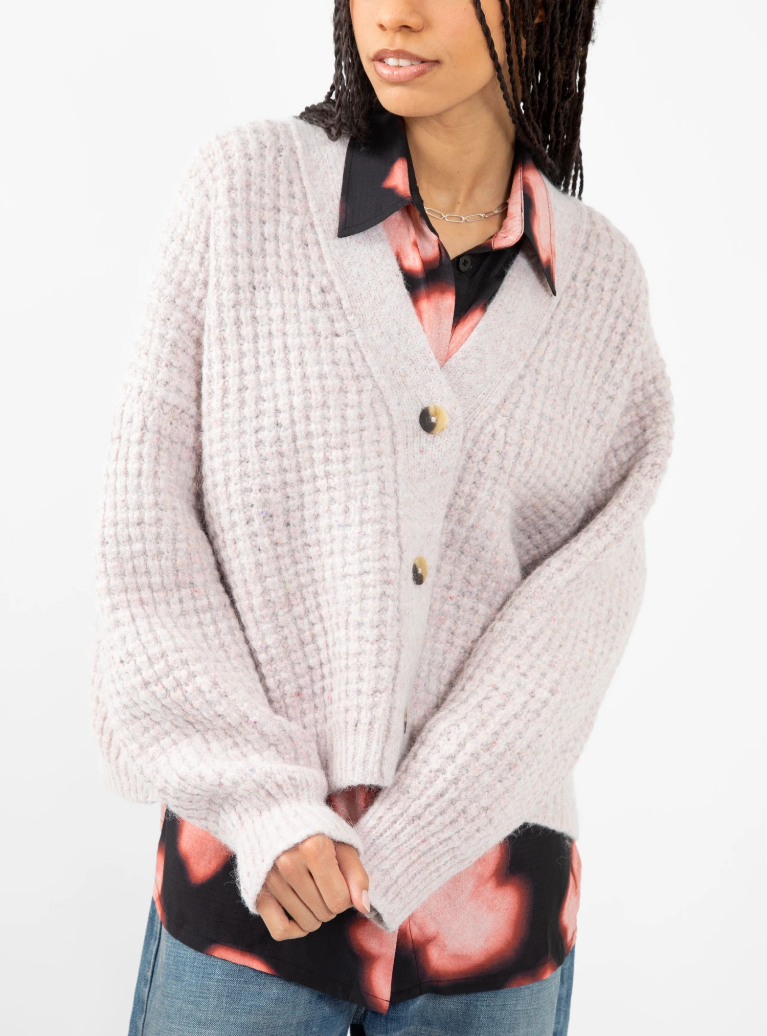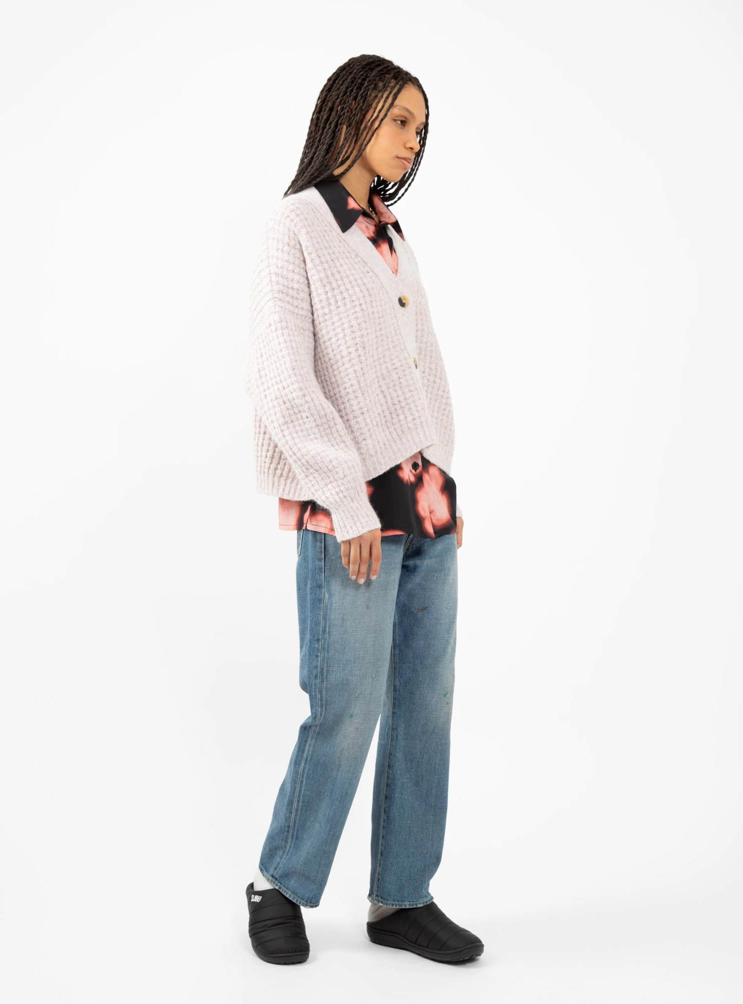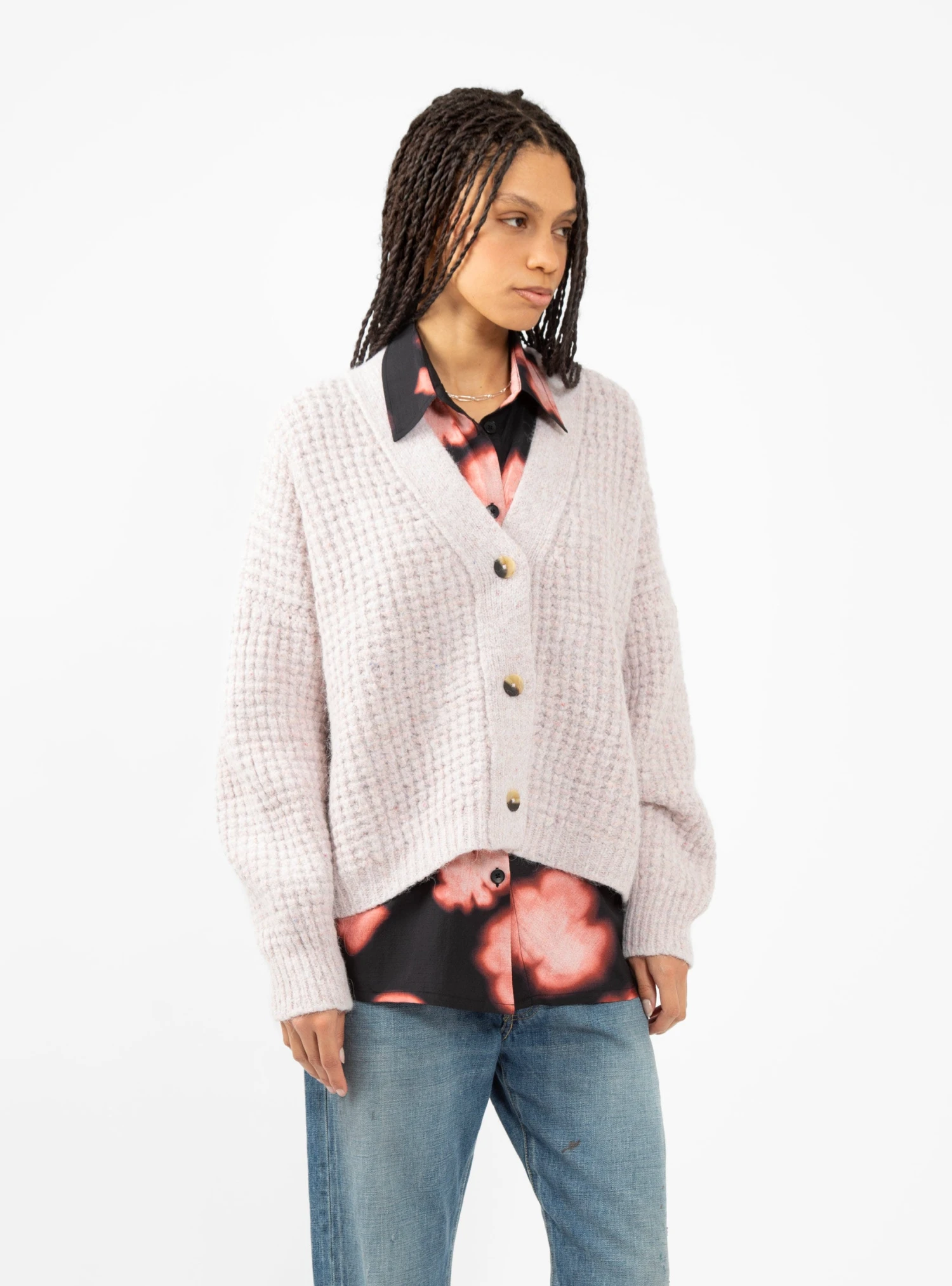 Made in Peru from fuzzy alpaca-blend yarn, this mauve Waffle cardigan from Lauren Manoogian is knitted to a relaxed, V-neck silhouette with dropped shoulders and features three tortoiseshell buttons punctuating the front.